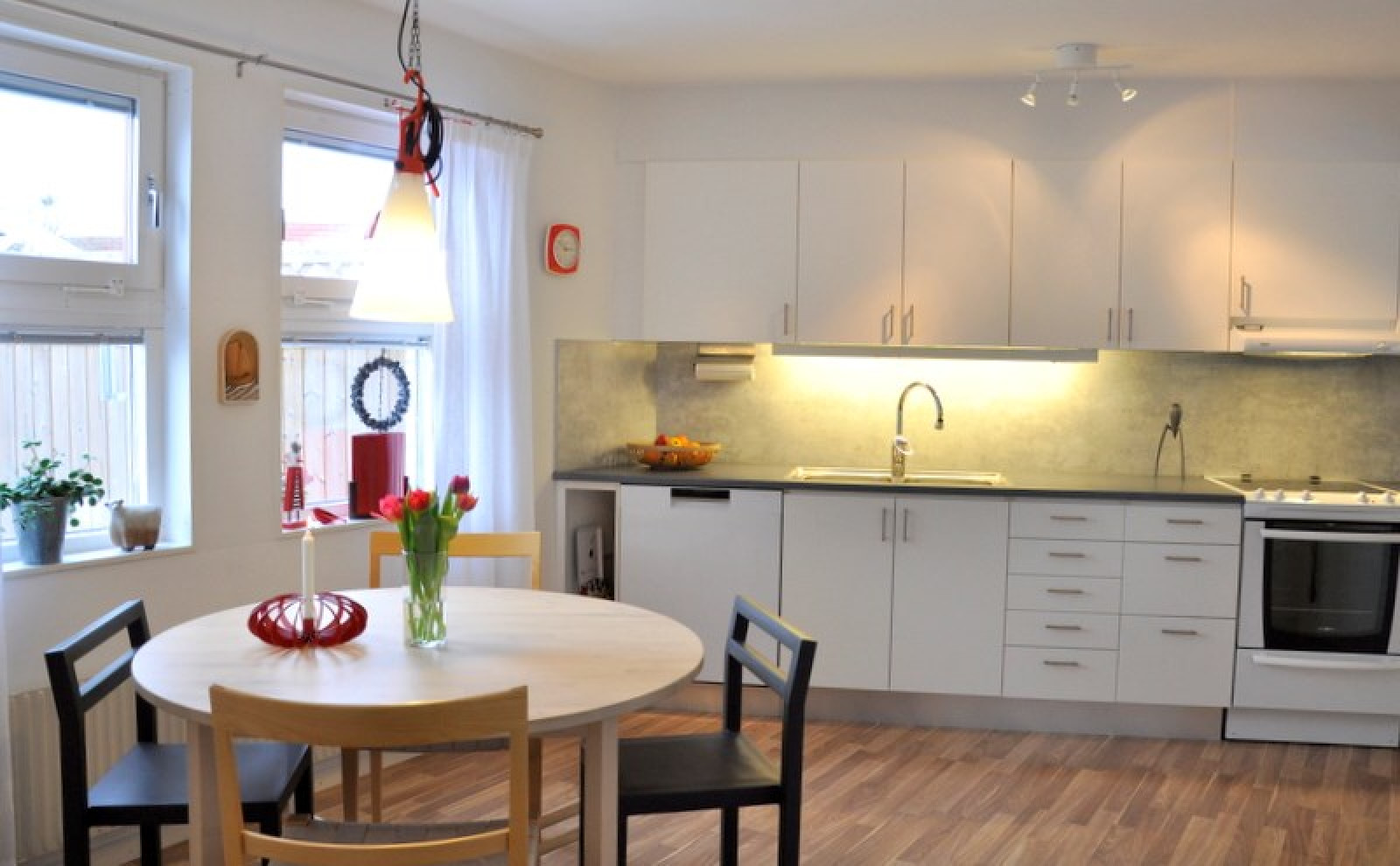 Laminatgolv, fönster åt nord/ost, målad vävtapet.