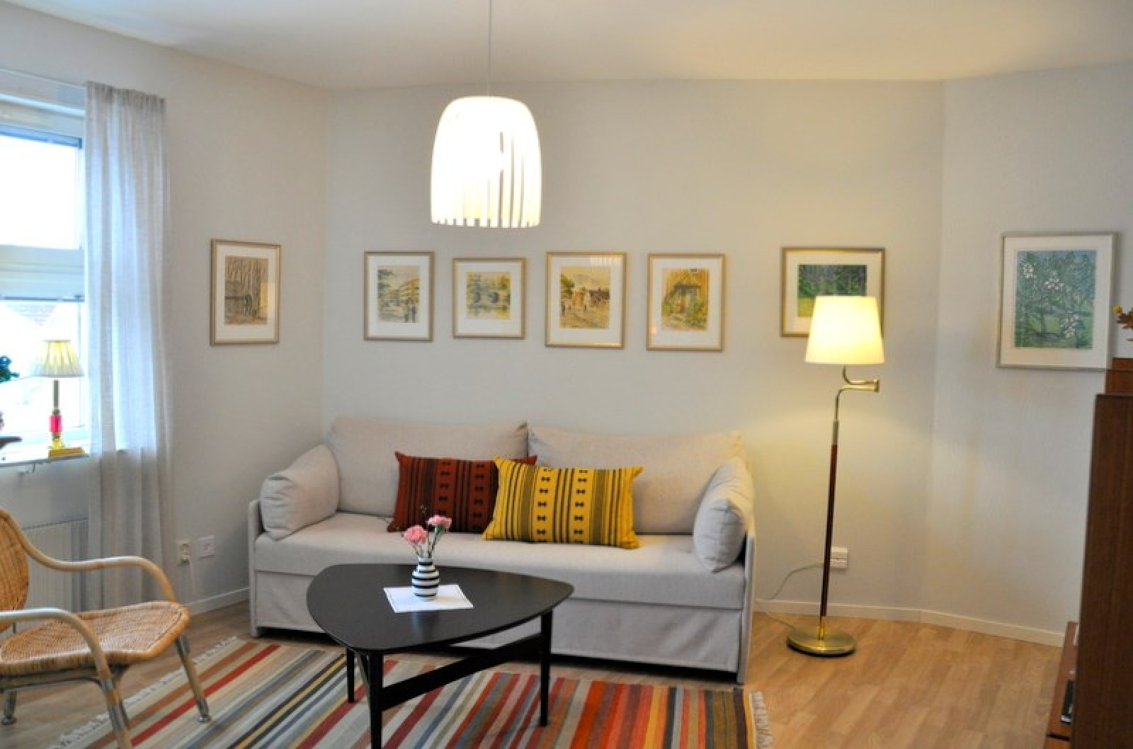 Laminatgolv, fönster åt väster, målad strukturtapet.