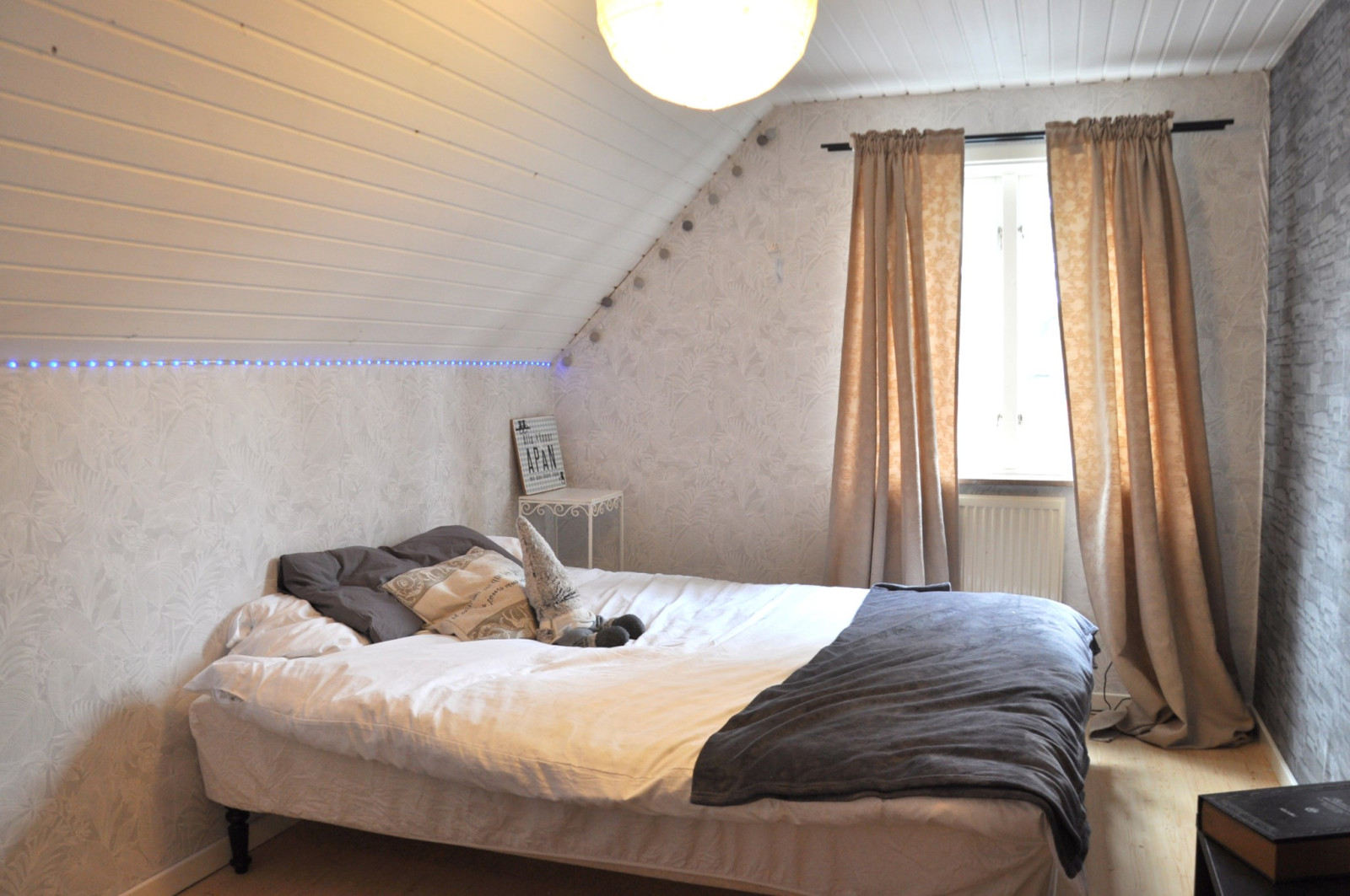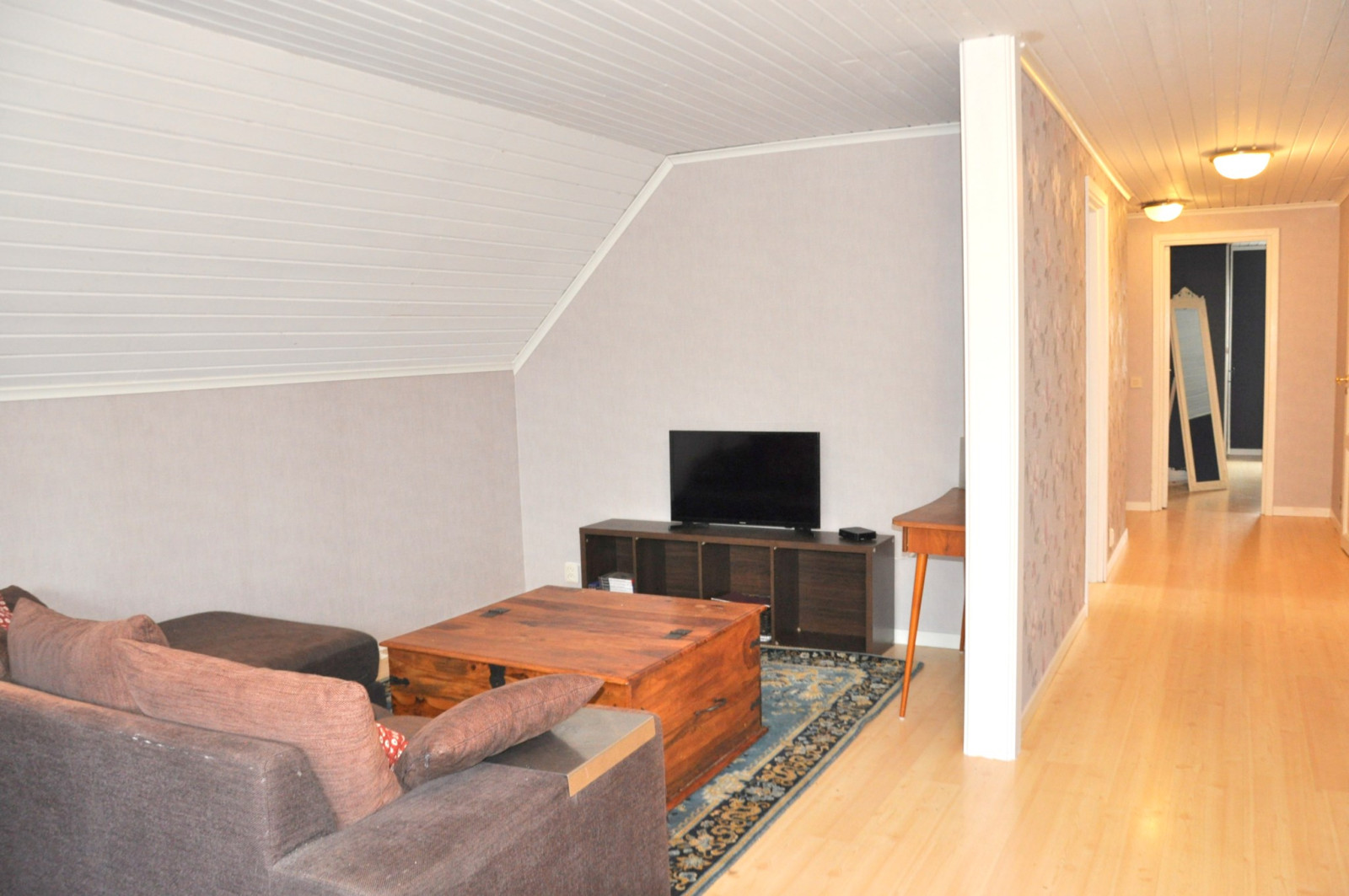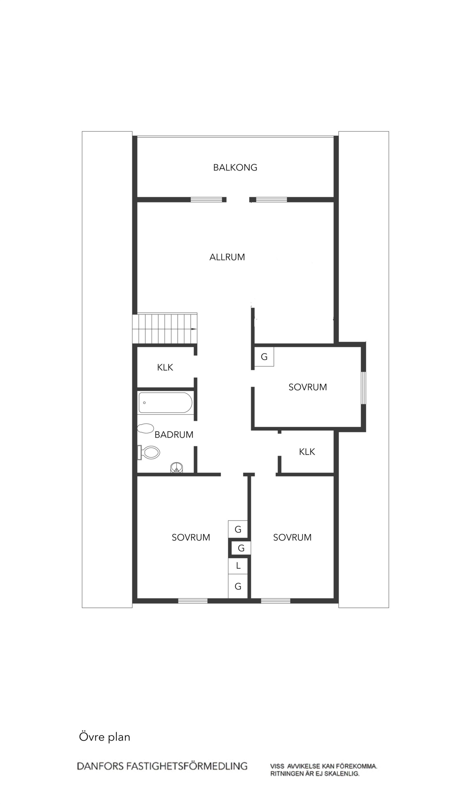 På ovanvåningen kommer man upp i ett öppet allrum med utgång till en balkong. På ovanvåningen finns också tre sovrum, ett helkaklat badrum samt två klädkammare.