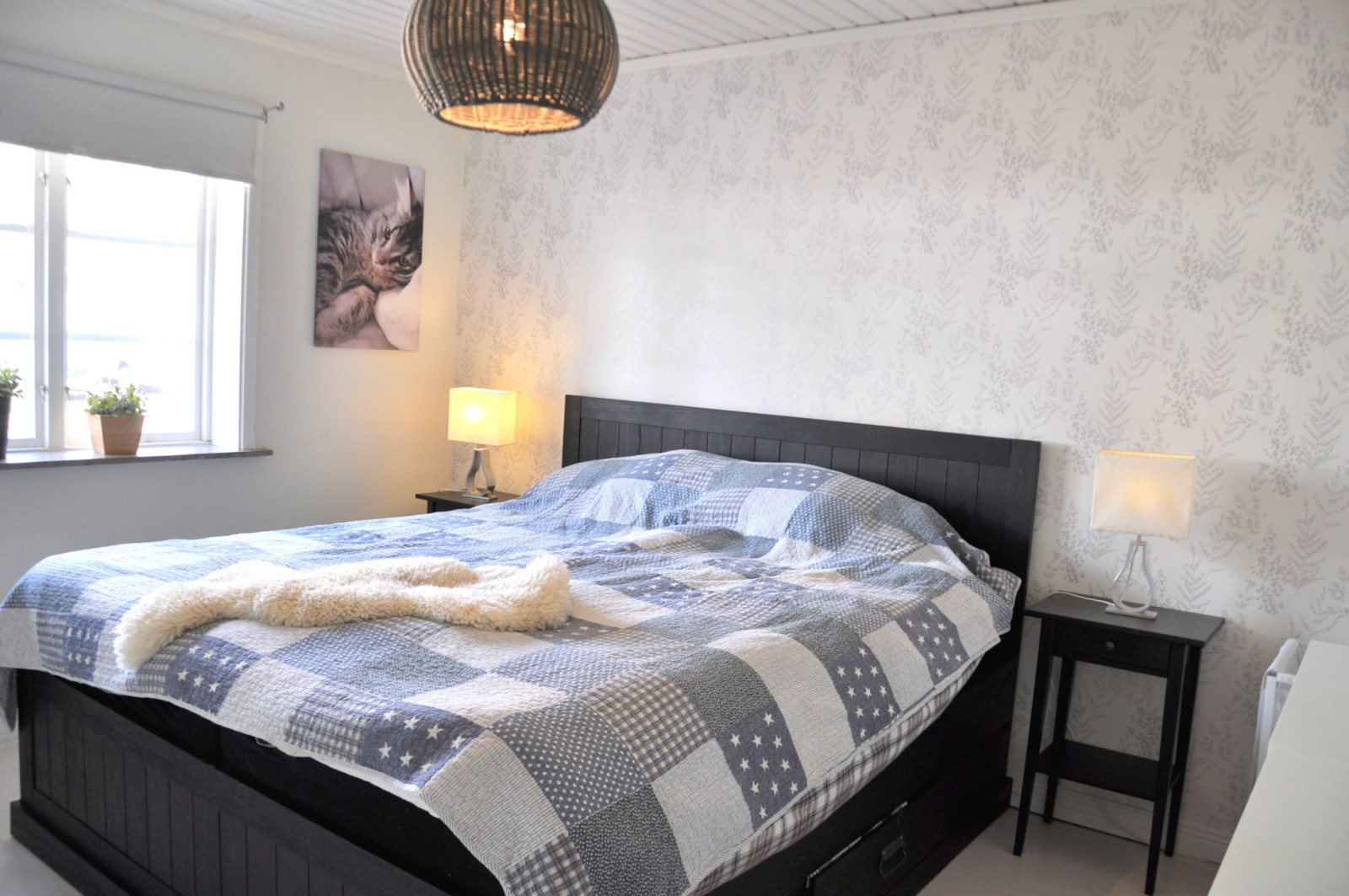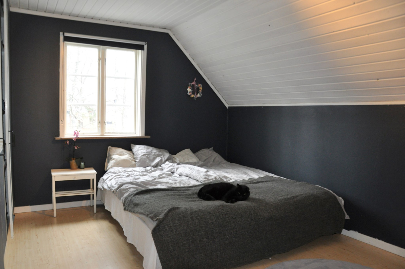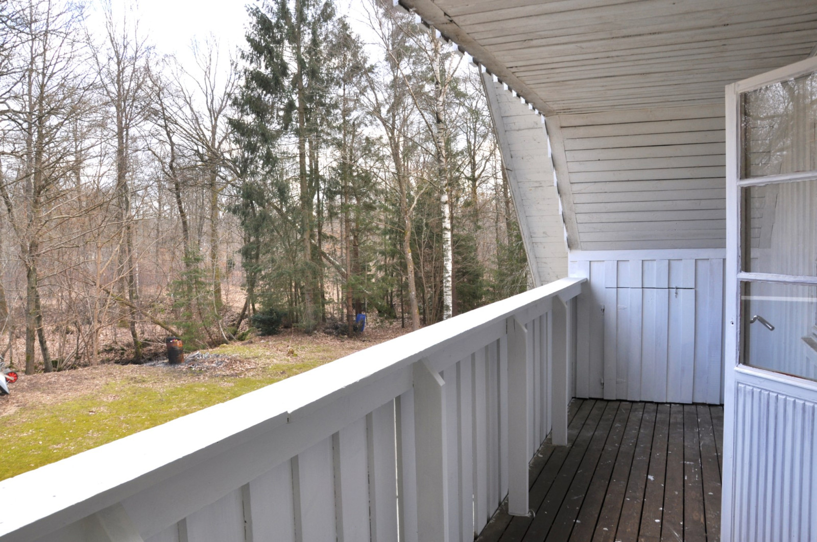 På ovanvåningen kommer man upp i ett öppet allrum med utgång till en balkong. På ovanvåningen finns också tre sovrum, ett helkaklat badrum samt två klädkammare.