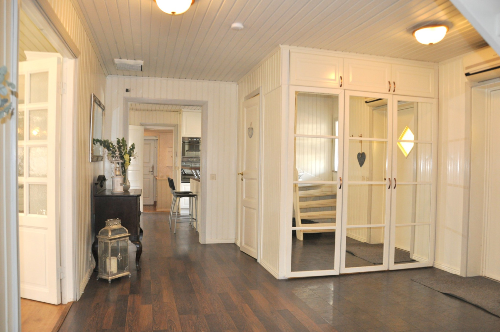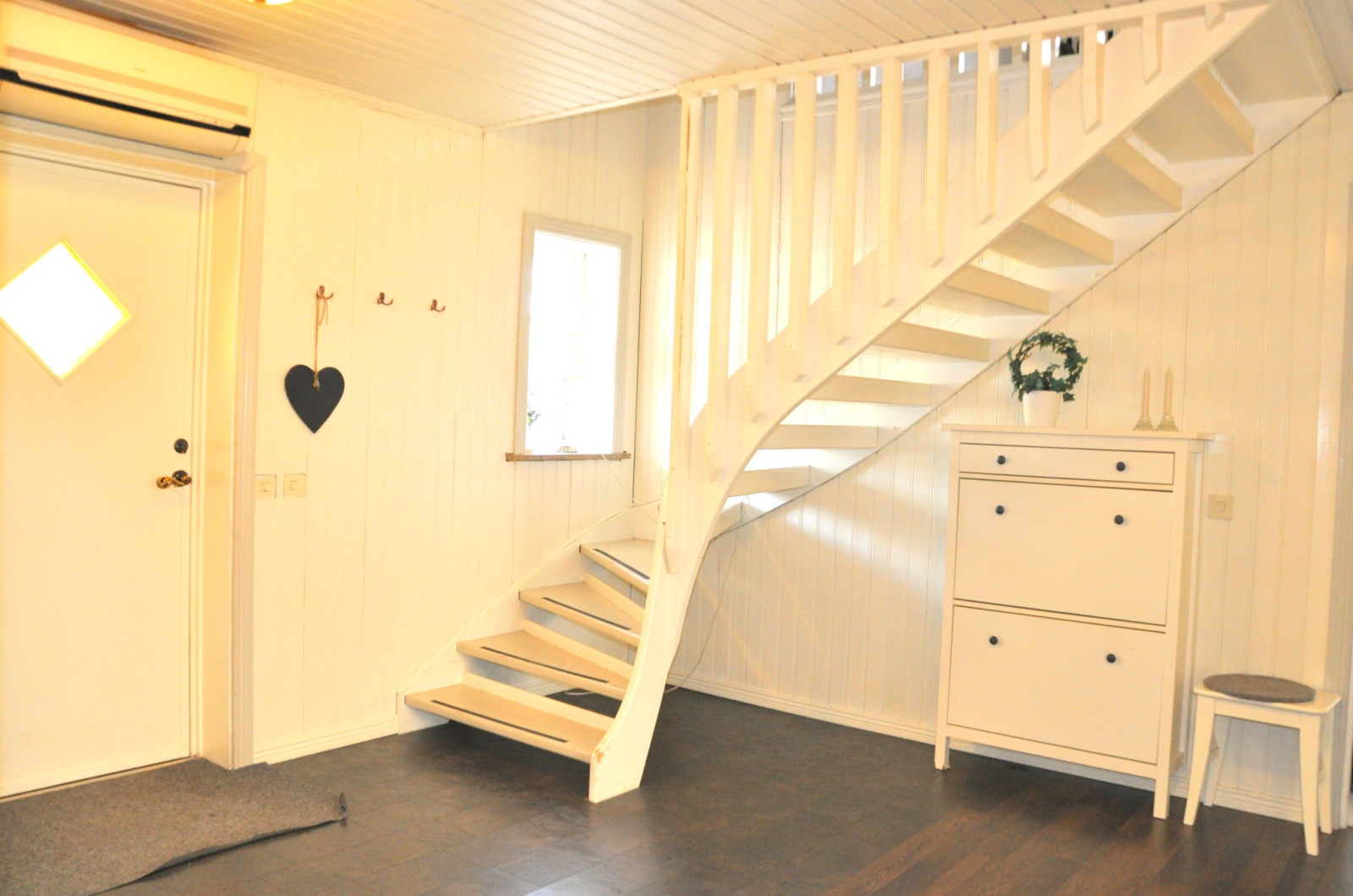 Huvudentré till en stor och rymlig hall med goda förvaringsmöjligheter och trappa till ovanvåningen. Till vänster efter trappan finns det första sovrummet med bra garderobsutrymme. Rakt fram från hallen ligger ett stort sällskapsrum med gott om plats för både matbord och soffgrupp. Här finns också två utgångar till trädgården/altanen samt en täljstenskamin som ger bra extra värme och myskänsla.