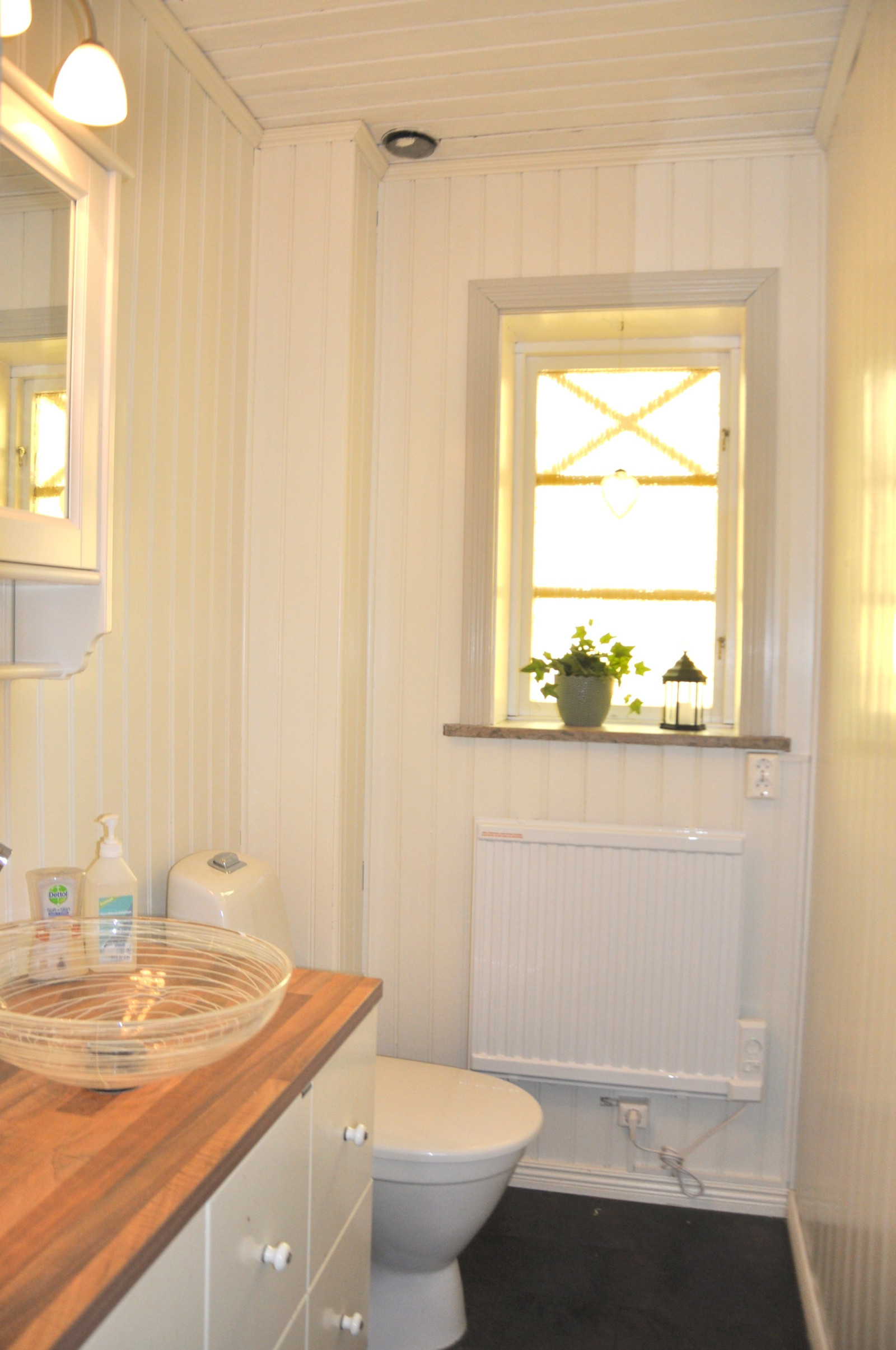 Helkaklat badrum på ovanvåningen med badkar, WC och handfat. Golvvärme. Renoverat 2003.Tvättstuga