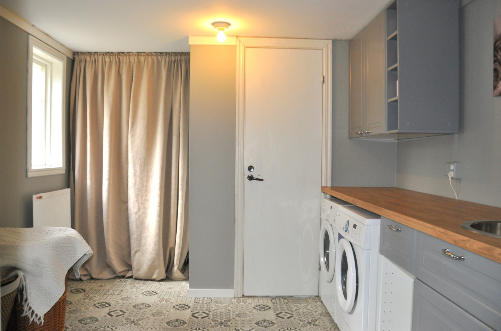 Nyrenoverad tvättstuga (2020) med tvättmaskin, rejäl arbetsbänk, vask och bra med förvaringsutrymmen.