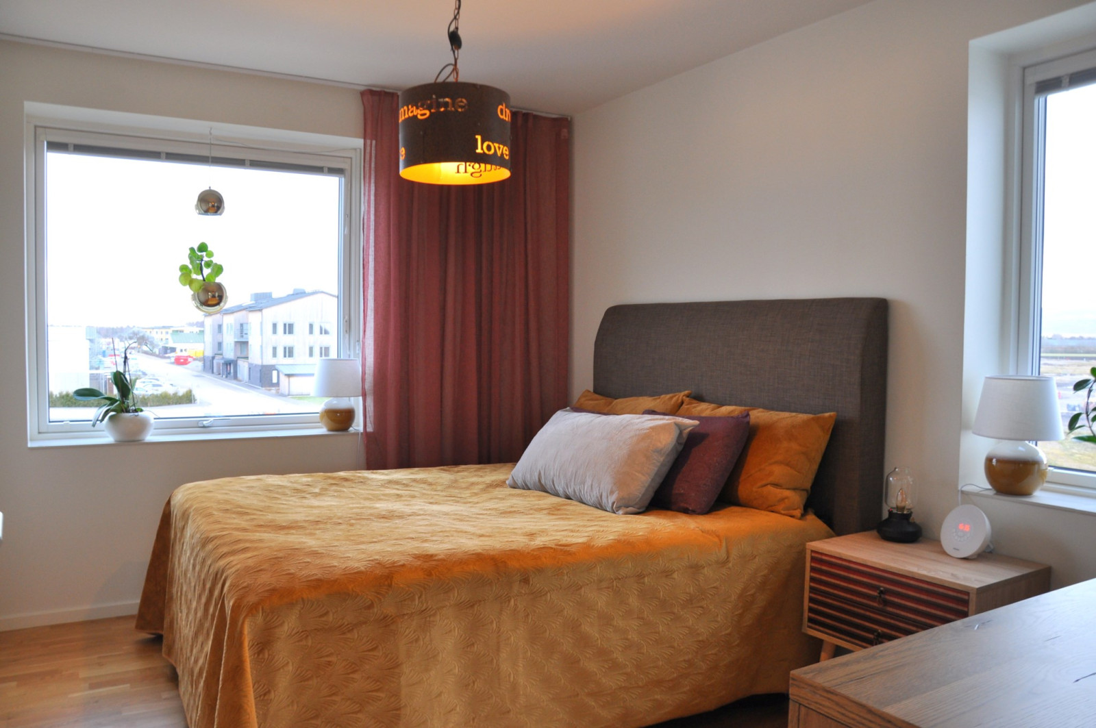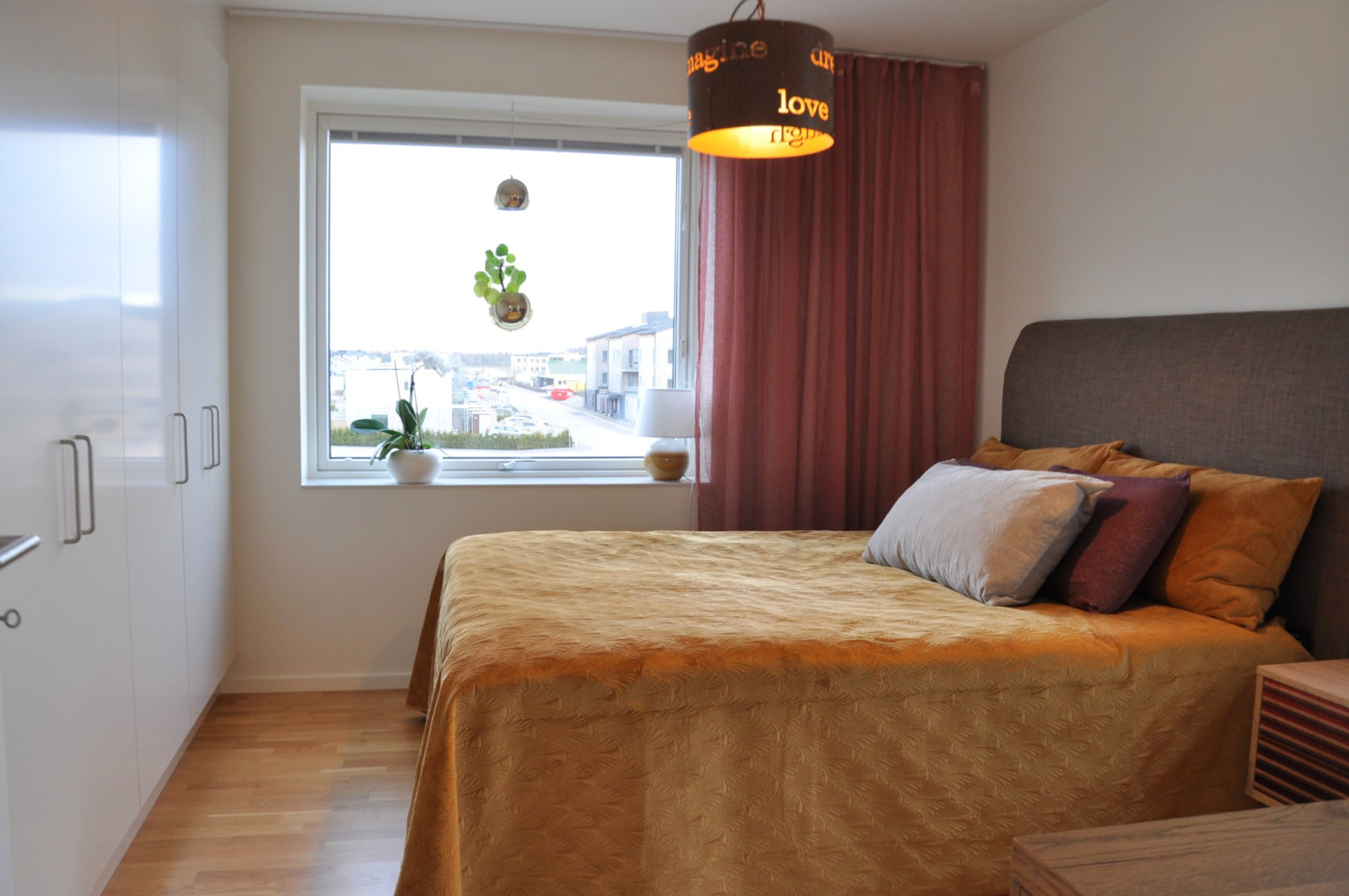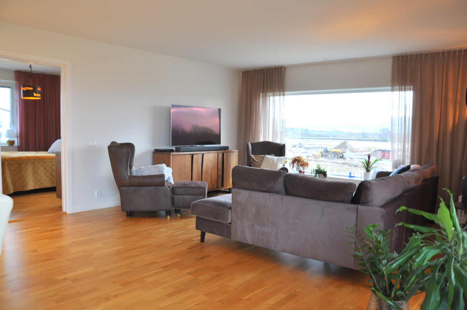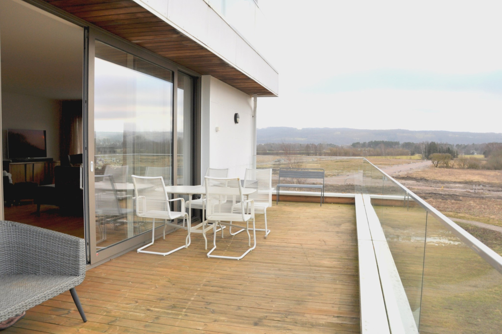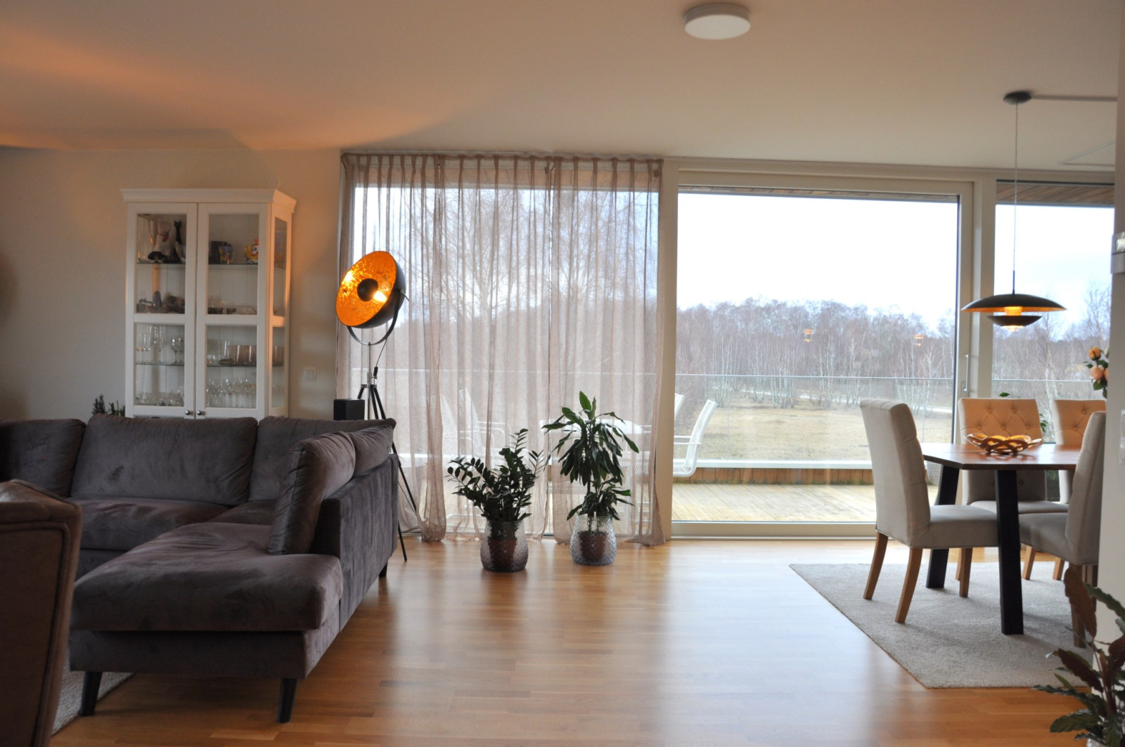 Entré till hall med avhängningsmöjligheter och en direkt vy mot söder och Hallandsåsen. Längs hallens vänstra sida ligger först det rymliga badrummet och därefter ett sovrum. Rakt fram finns det stora sällskapsrummet. Här finns också matplatsen och köket med öppen planlösning. Från matplatsen finns utgång till den stora balkongen varifrån man har en härlig utsikt över naturreservatet i väster och mot Hallandsåsen i söder. Från sällskapsrummet nås även master bedroom med gott om garderober och fönster åt två håll.