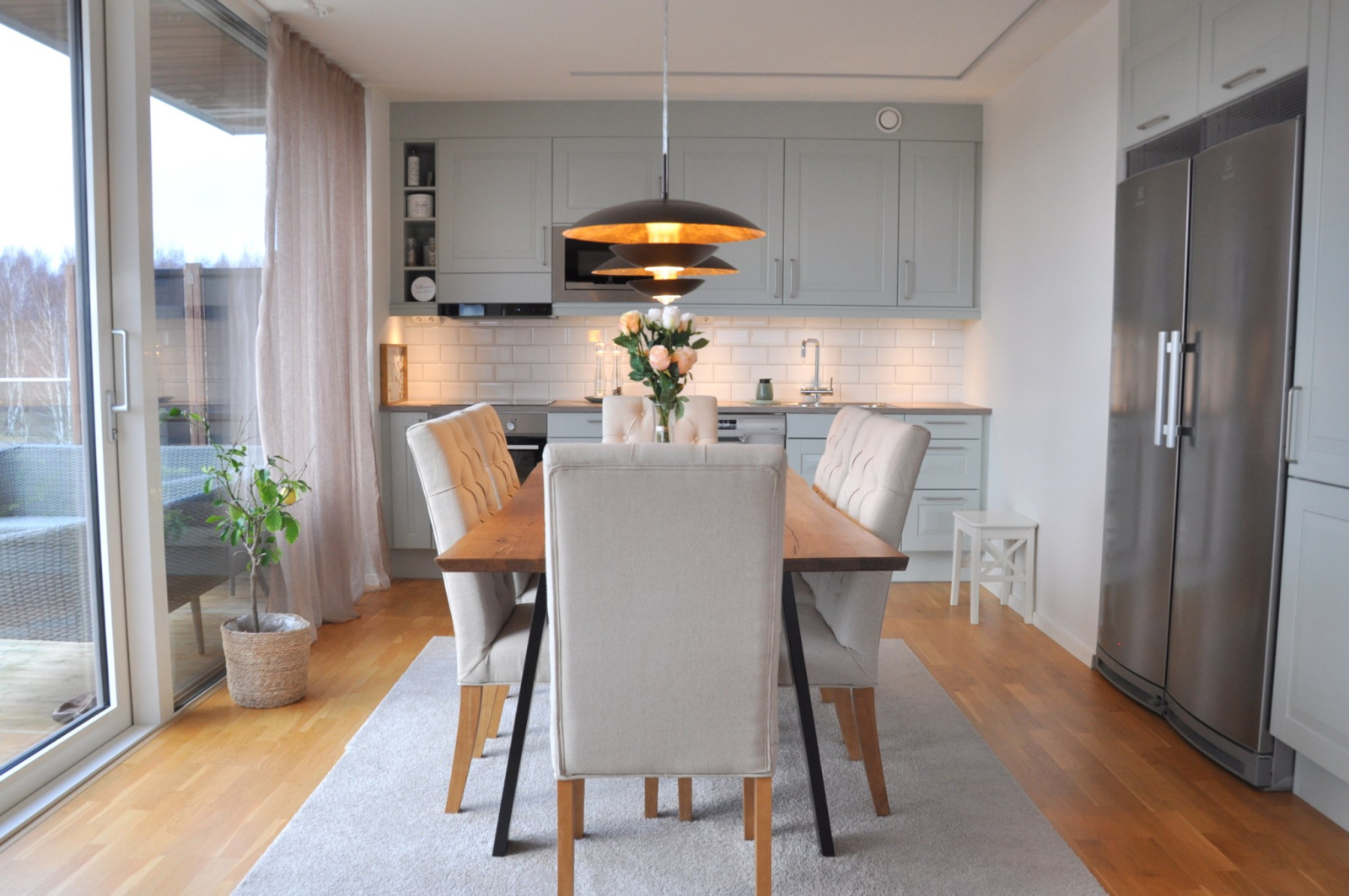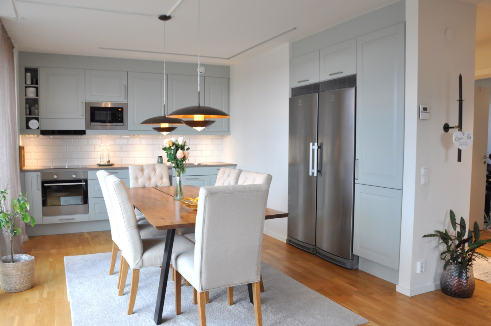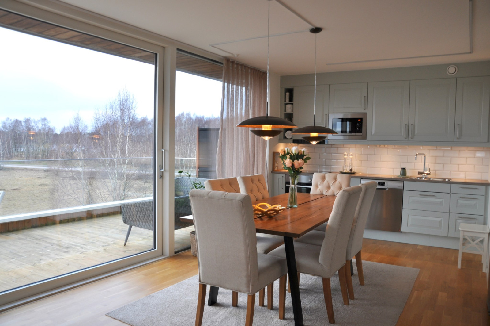 Ljust och trivsamt kök med induktionshäll, spisfläkt, inbyggd ugn, mikrovågsugn, kylskåp, frysskåp samt diskmaskin. Kapitalvaror från Electrolux och köksinredning från Marbodal. Rymlig matplats med utgång till balkongen.