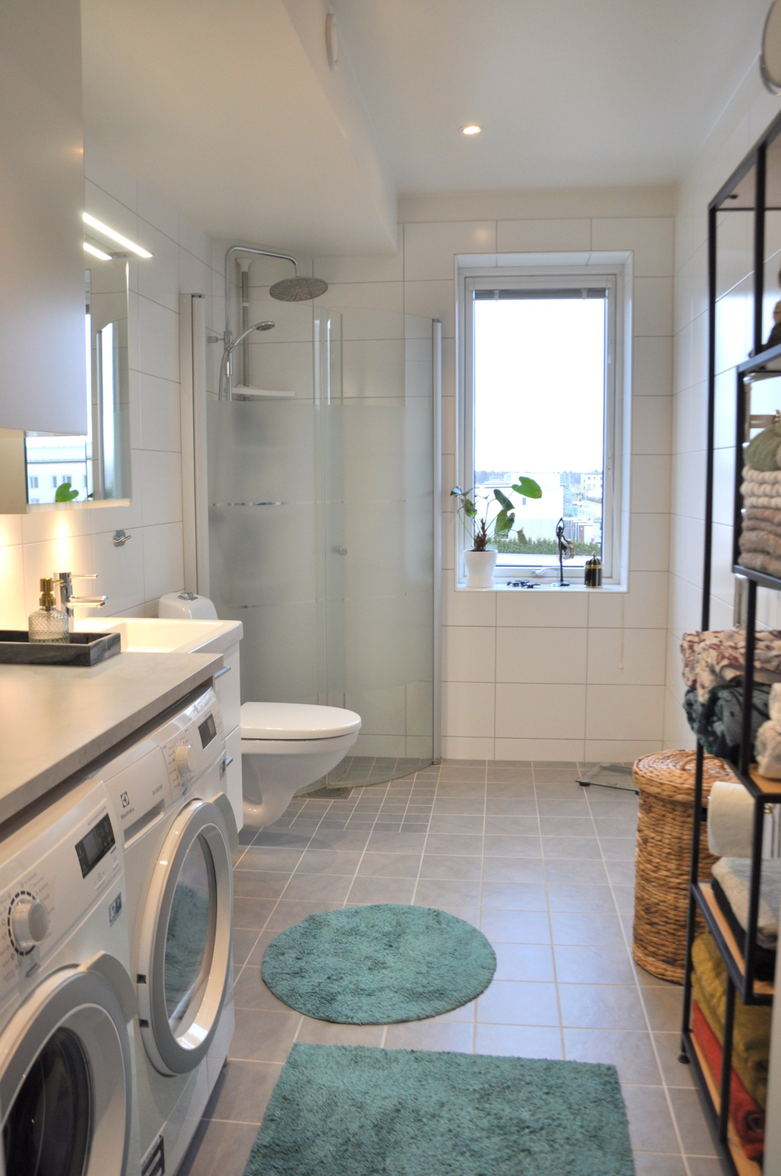 Helkaklat badrum med dusch, WC, tvättställ, handdukstork, tvättmaskin och torktumlare.