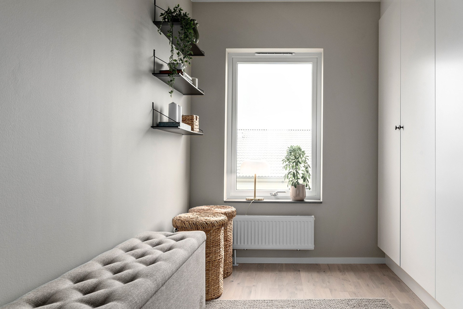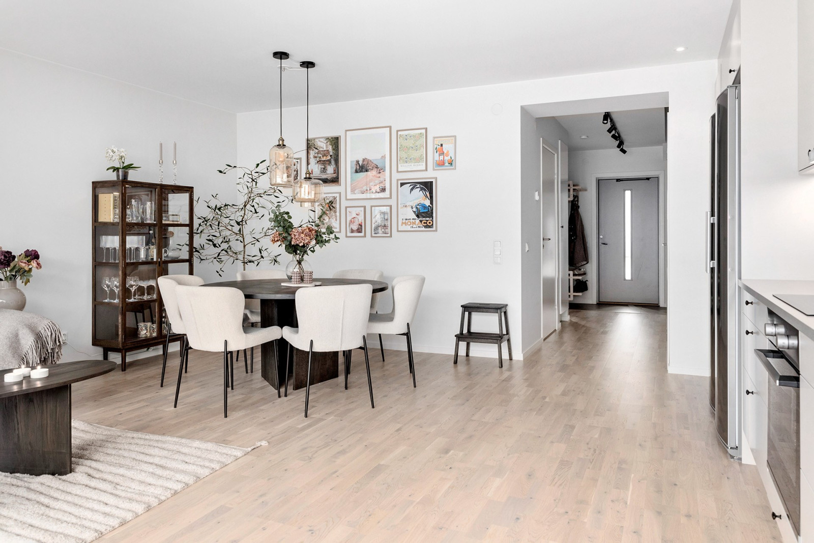 Uppvärmning via frånluftsvärmepump med golvvärme på entréplan och radiatorer på plan 2.Kök