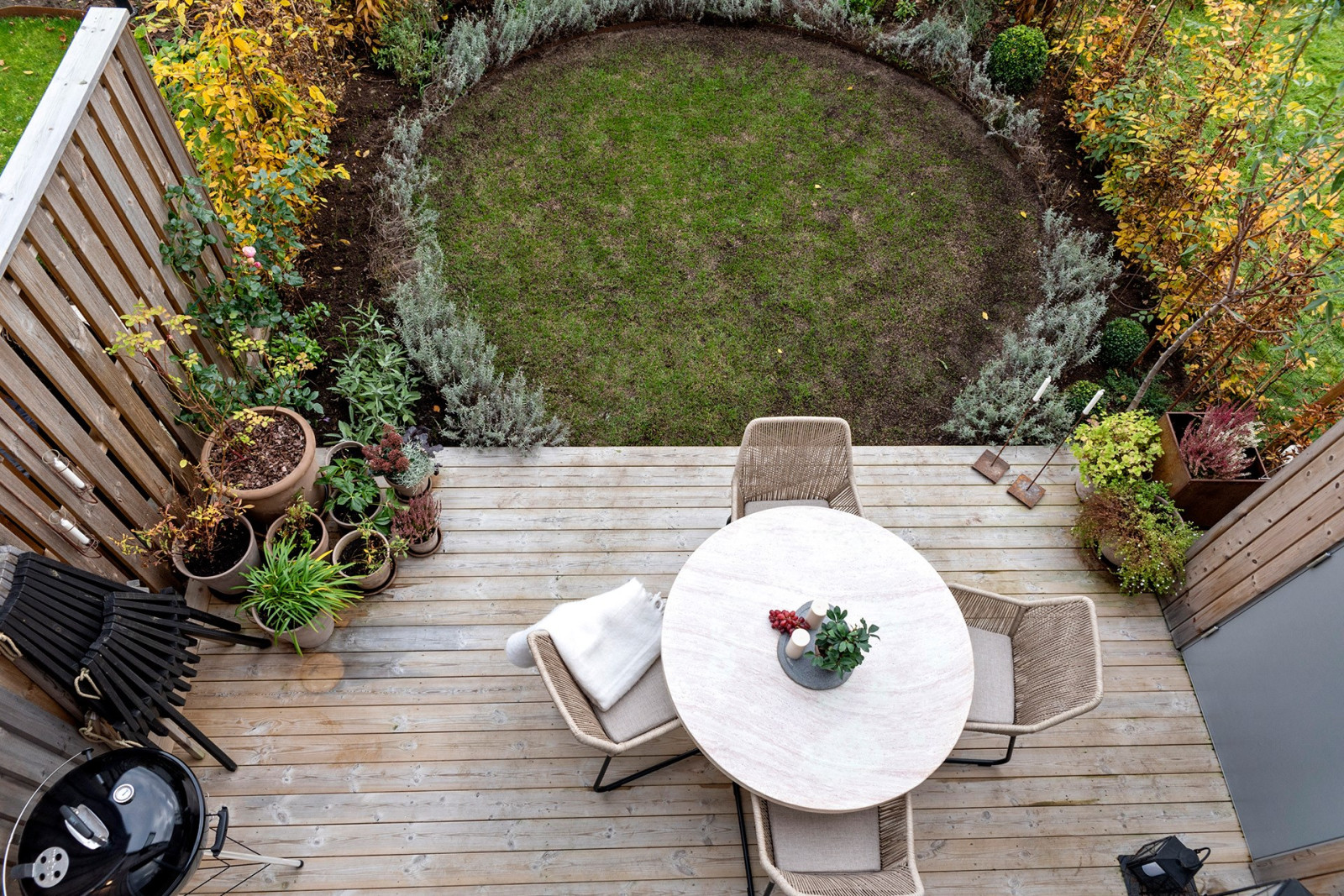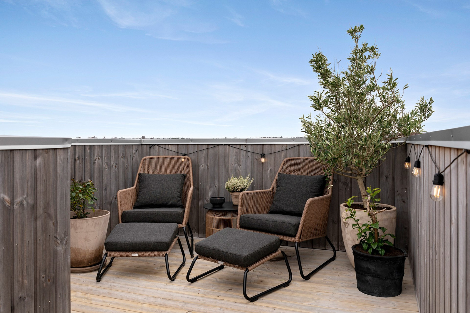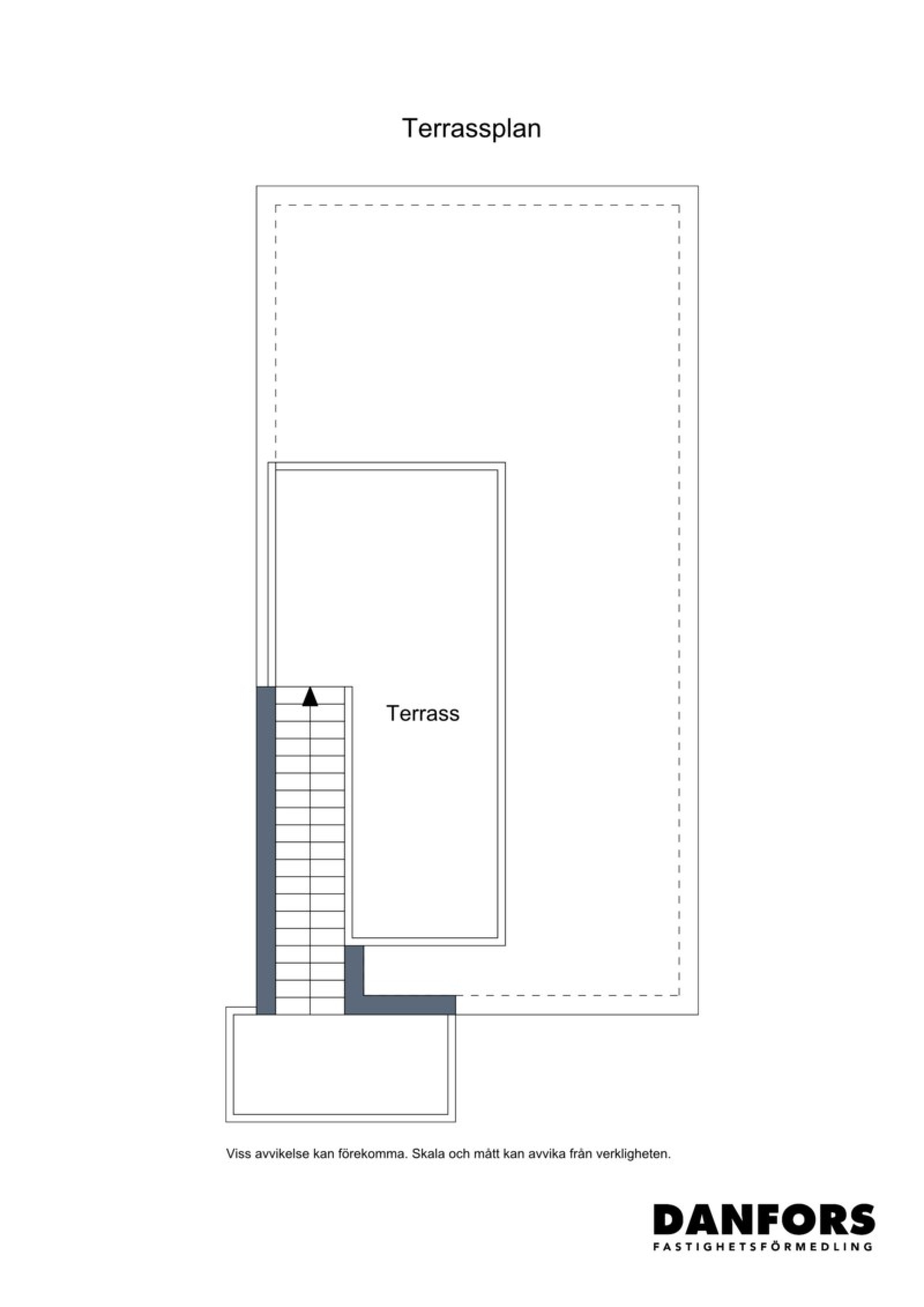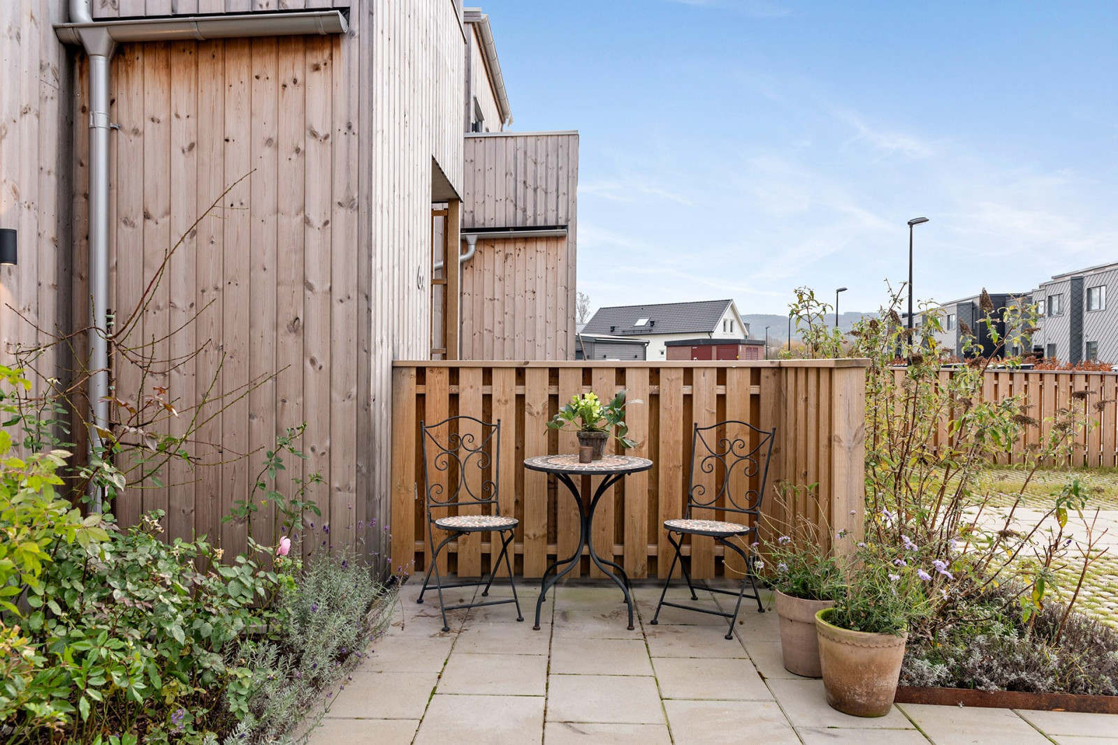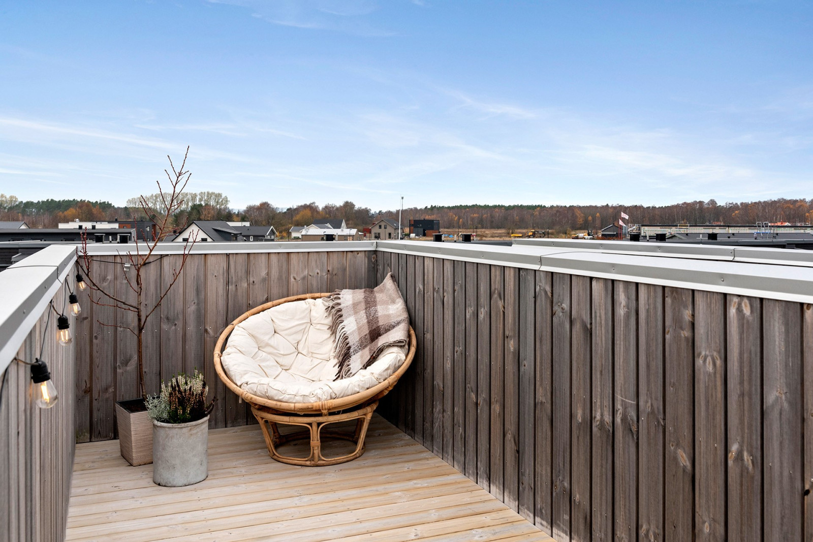 Altandäck samt trädgårdstäppa. Belysning samt eluttag finns. Trädgården avgränsas med en avenbokshäck. Dessutom finns en balkong i västerläge samt en takterrass.Bilplats