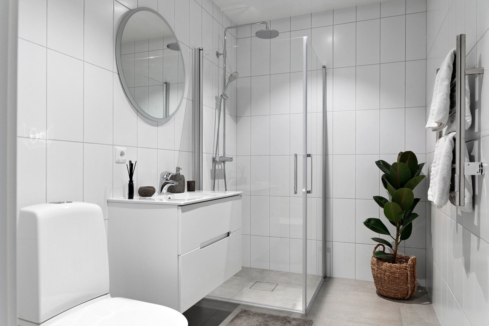 WC, dusch, handfat, spegel med belysning, elektrisk handdukstork samt golvvärme.