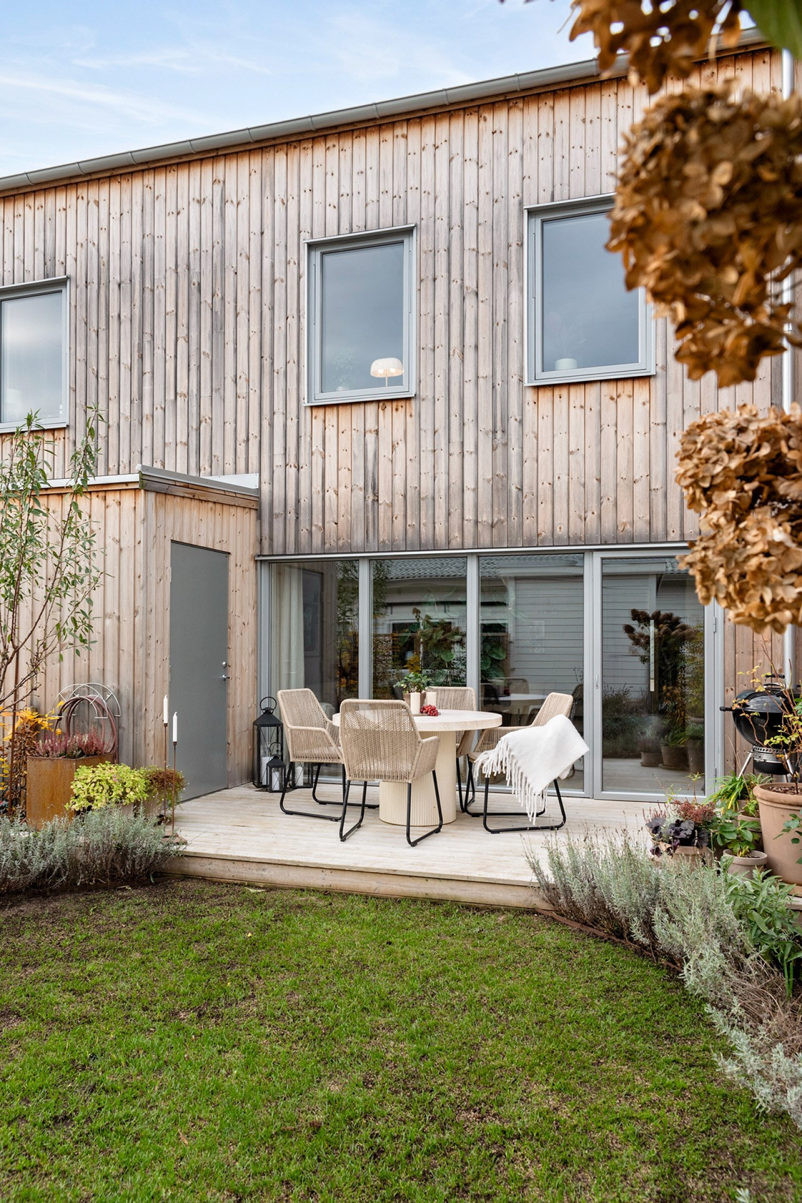 Byggnadstyp2-plans radhusByggnadsår2024Fönster3-glas isolerUppvärmningFrånluftsvärmepumpVentilationMekanisk frånluft (frånluftsvärmepump)Våningsplan1 av 1. Hiss finns ej.Övriga byggnader/utrymmenFörråd i anslutning till entrén samt ett mindre redskapsförråd på trädgårdssidan.ÖvrigtByggnaderna är uppförda i trä (trästomme, träfasad samt takbjälklag i trä) på en platta av betong. Papptak. Aluminiumklädda träfönster (3-glas)Ekonomi