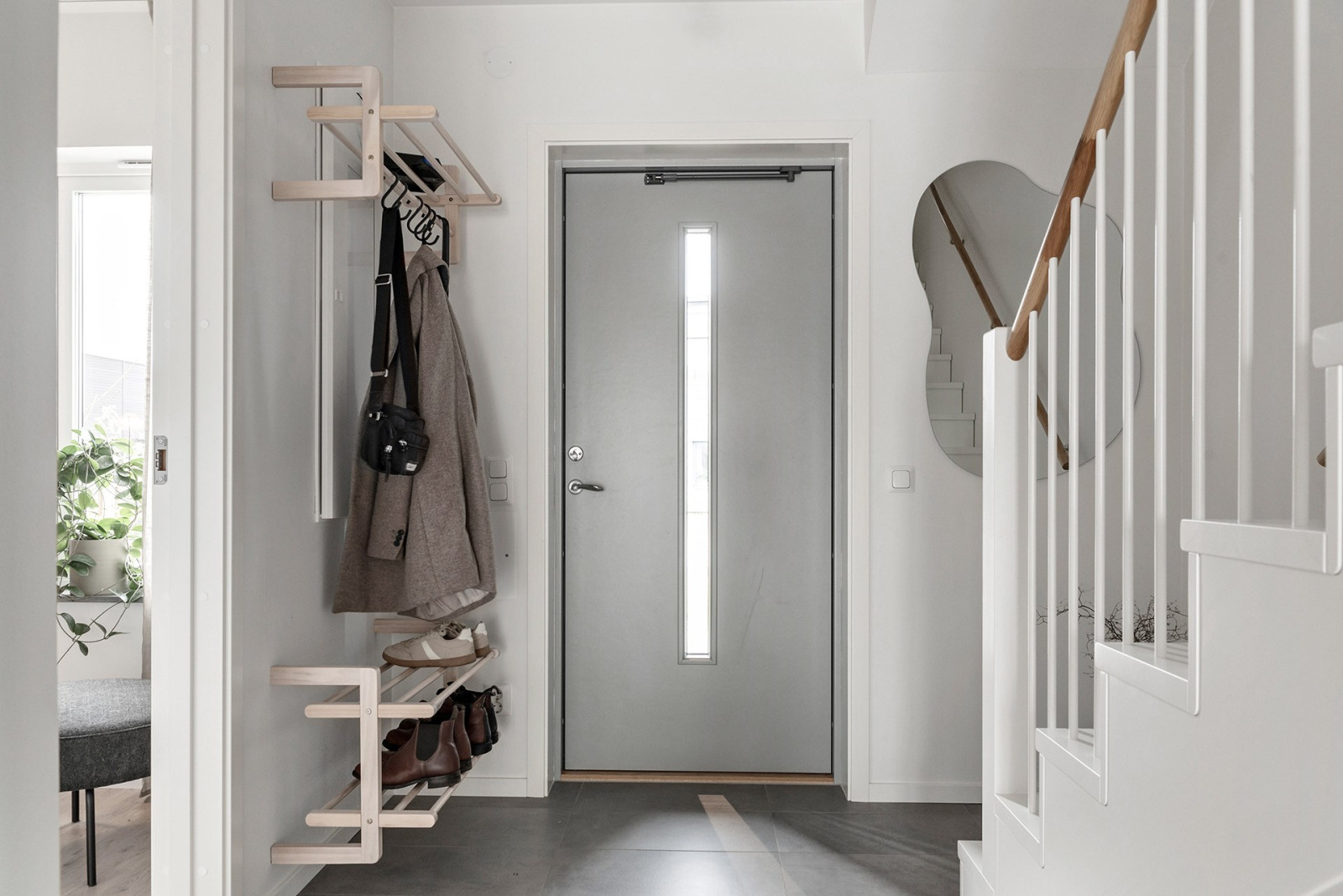 Entré till en klinkerbelagd hall med hatthylla och garderob. I hallen finns trappan till ovanvåningen med steg och handledare i ek. På motsatt sida om trappan finns ett sovrum/kontor. I anslutning till hallen finns också ett helkaklat badrum placerat. Vidare in i bostaden når man kök och sällskapsrum med öppen planlösning. Från sällskapsdelen finns stora glaspartier med dörr till altandäcket och trädgårdstäppan.