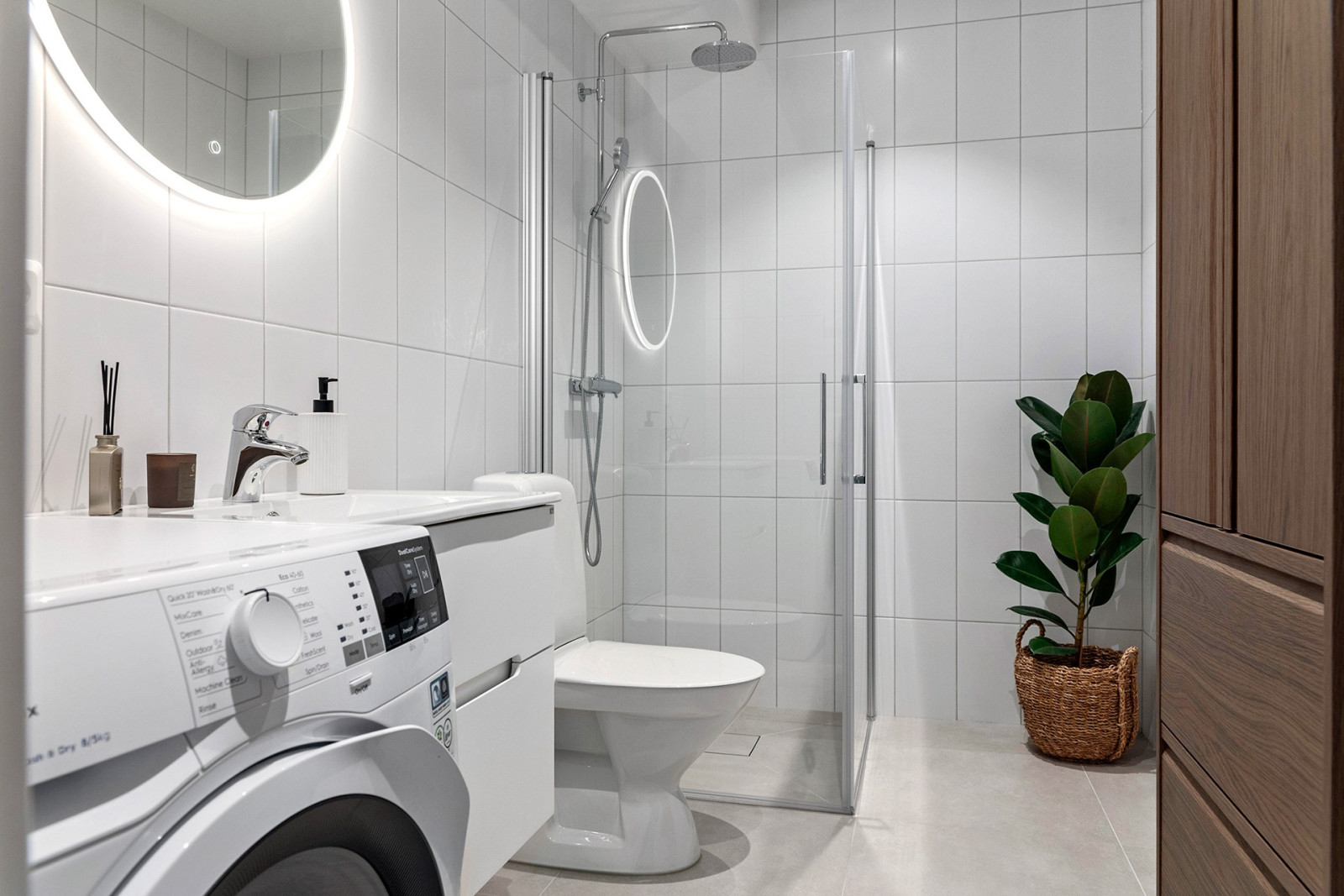 I badrummet på entréplan finns även en kombinerad tvättmaskin/torktumlare.-