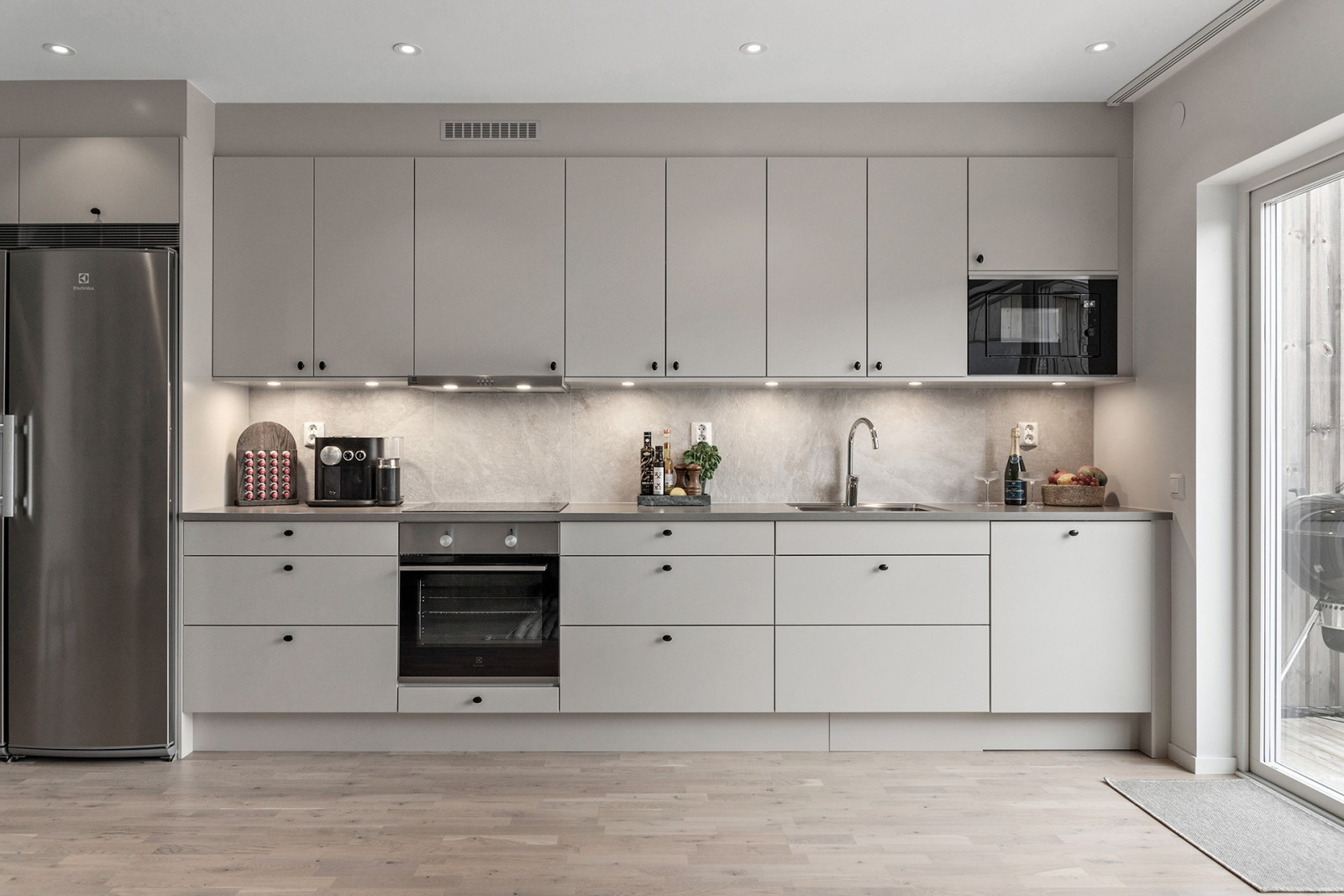 Inbyggnadsugn, micro, kylskåp, frysskåp, spisfläkt, integrerad diskmaskin samt induktionshäll. Rostfria kapitalvaror från Electrolux.