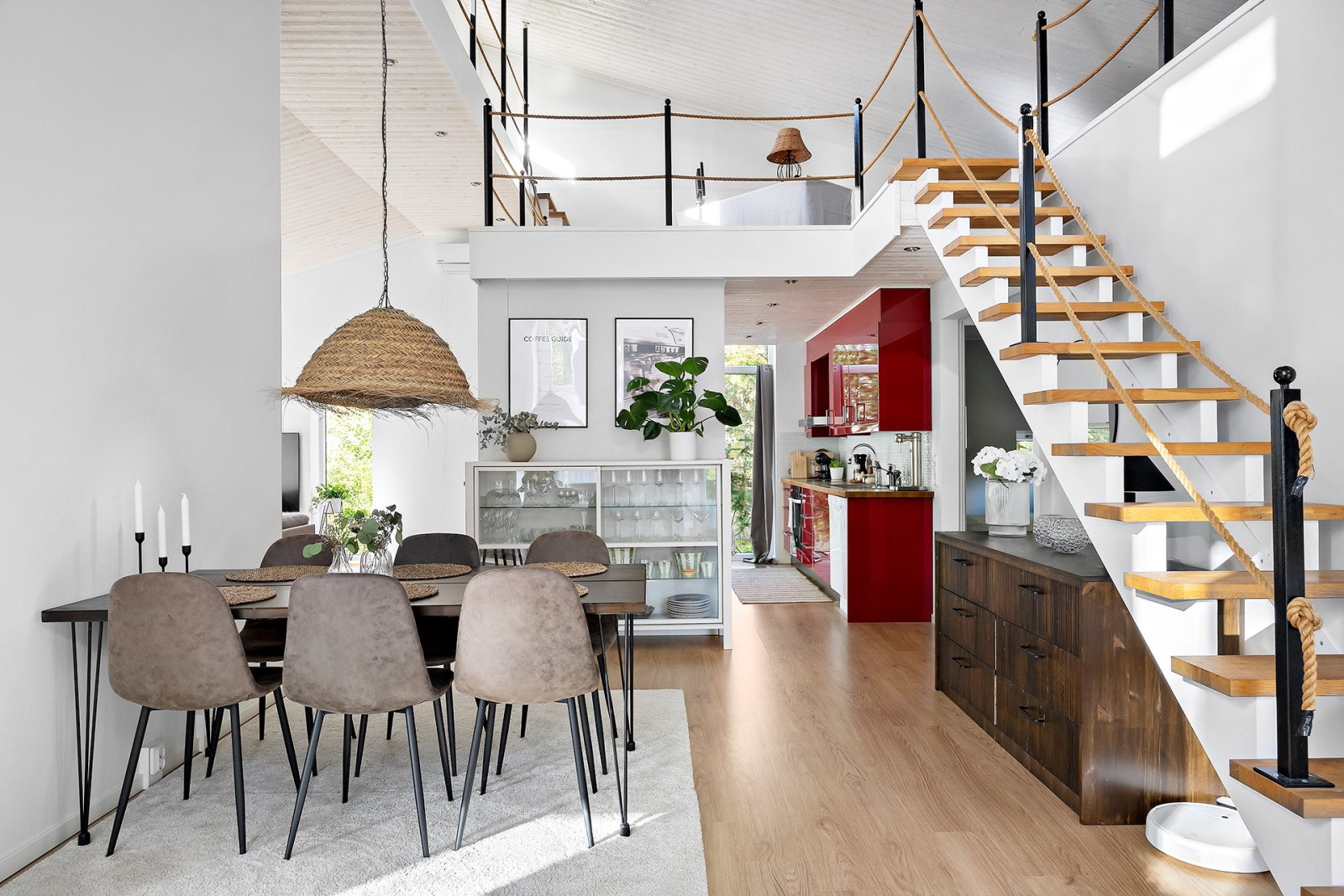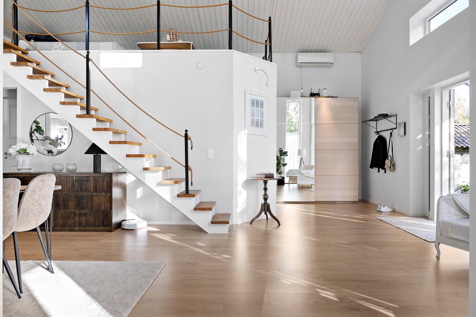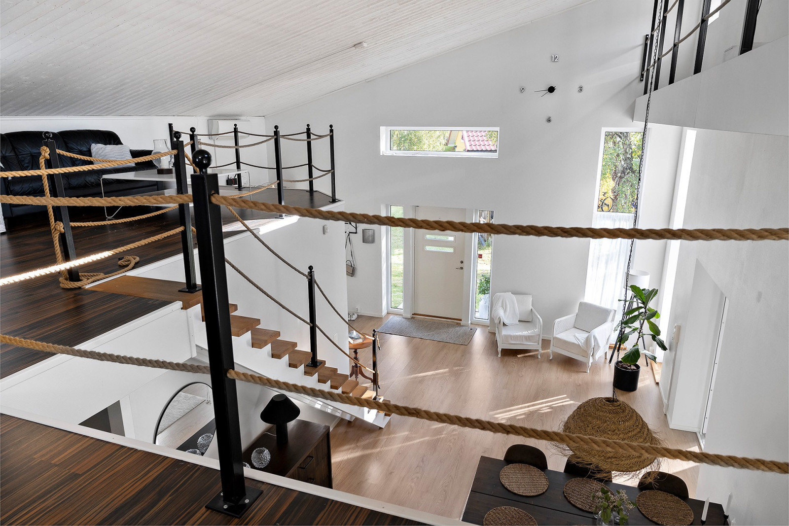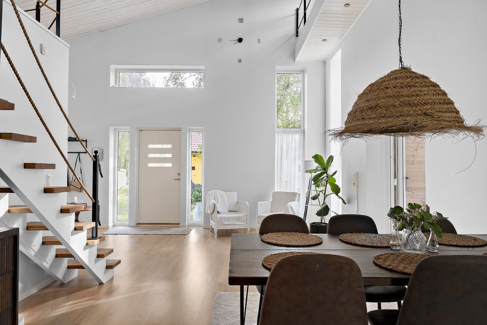 Från hallen öppnar huset upp sig med härlig takhöjd ända upp till nock och ett vackert loft som bidrar till den öppna och ljusa känslan. De stora högfönstren och de liggande fönstren längs loftgången släpper in rikligt med dagsljus och skapar en trivsam atmosfär året runt. Till höger i hallen finns en rymlig skjutgarderob med gott om förvaring, och härifrån leder även ektrappan upp till loftet. Planlösningen bjuder på en fin öppenhet mellan kök, vardagsrum och loft – perfekt för umgänge och familjeliv. Vidare från allrummet nås de två sovrummen samt badrummet. Det färgstarka köket har högblanka köksluckor, generösa arbetsytor och gott om förvaring. Här finns även stora fönster som släpper in ett vackert ljus över den fristående köksbänken. Vardagsrummet ligger i direkt anslutning till köket och har en stor öppning mot allrummet, vilket förstärker känslan av rymd. Fyra höga fönster bidrar till ett fantastiskt ljusinsläpp och från rummet leder pardörrar ut till det trivsamma uterummet – en perfekt plats för sommarens middagar och avkopplande stunder. Loftet ramas in av rep och svarta smidesstolpar som ger en unik karaktär. Här finns gott om yta för både umgänge, arbete eller extra sovplats, samt ytterligare en liten trappa som leder upp till loftgången. Uterummet har även det en fin rymd med tre högfönster, skjutdörrspartier åt väster ut till altanen samt ett fint klinkergolv med golvvärme (el).