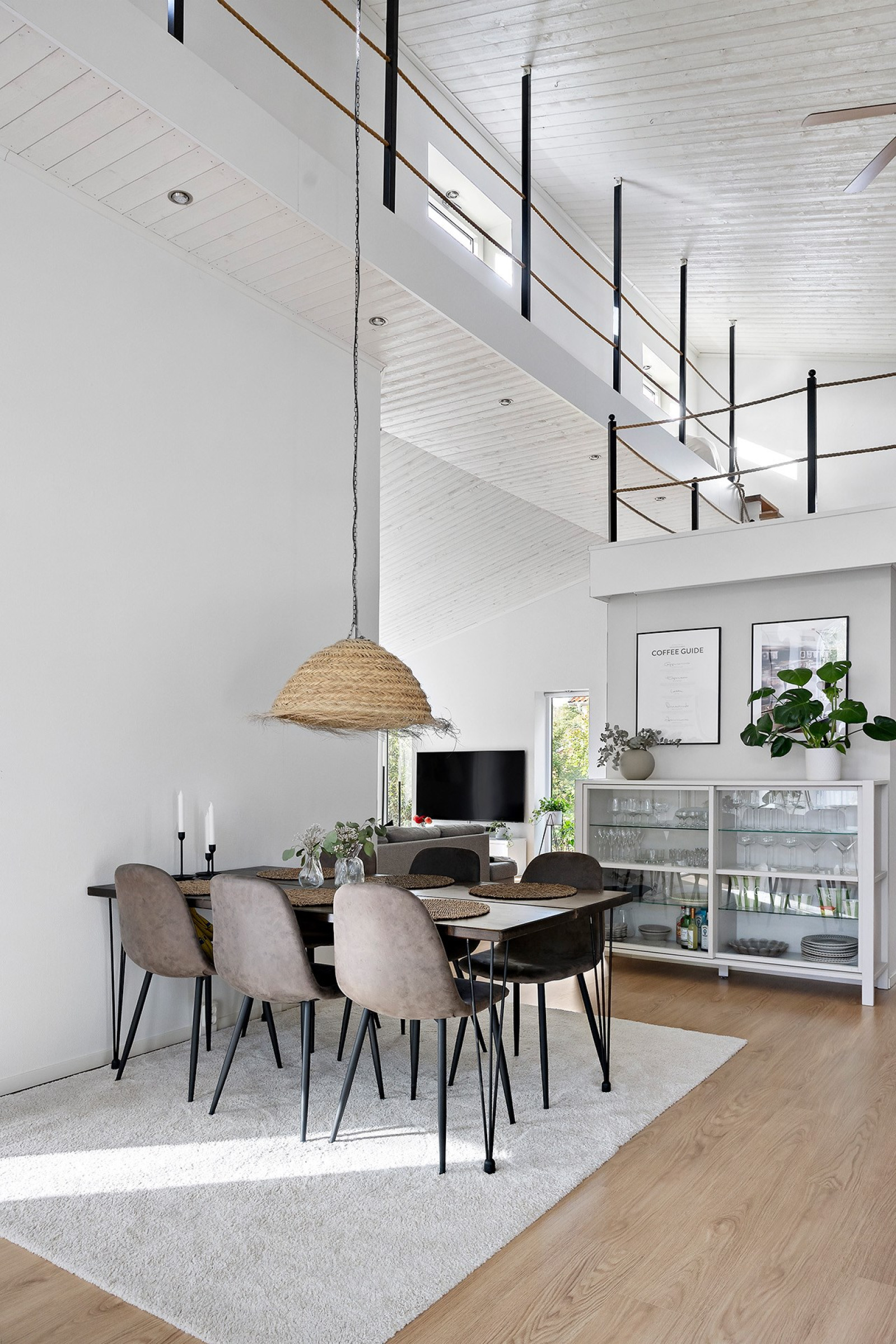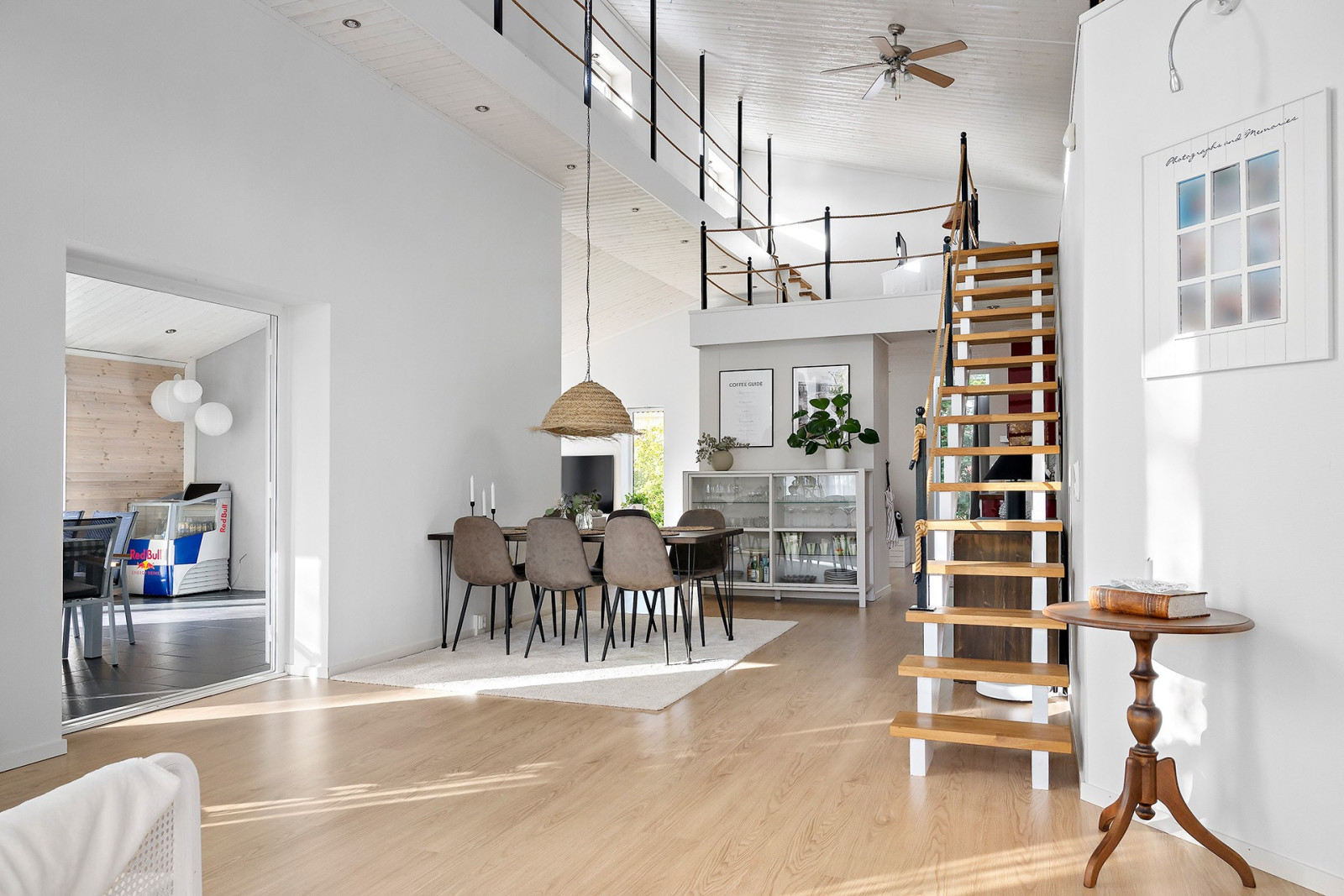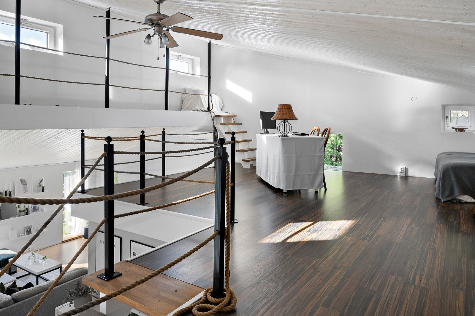 Från hallen öppnar huset upp sig med härlig takhöjd ända upp till nock och ett vackert loft som bidrar till den öppna och ljusa känslan. De stora högfönstren och de liggande fönstren längs loftgången släpper in rikligt med dagsljus och skapar en trivsam atmosfär året runt. Till höger i hallen finns en rymlig skjutgarderob med gott om förvaring, och härifrån leder även ektrappan upp till loftet. Planlösningen bjuder på en fin öppenhet mellan kök, vardagsrum och loft – perfekt för umgänge och familjeliv. Vidare från allrummet nås de två sovrummen samt badrummet. Det färgstarka köket har högblanka köksluckor, generösa arbetsytor och gott om förvaring. Här finns även stora fönster som släpper in ett vackert ljus över den fristående köksbänken. Vardagsrummet ligger i direkt anslutning till köket och har en stor öppning mot allrummet, vilket förstärker känslan av rymd. Fyra höga fönster bidrar till ett fantastiskt ljusinsläpp och från rummet leder pardörrar ut till det trivsamma uterummet – en perfekt plats för sommarens middagar och avkopplande stunder. Loftet ramas in av rep och svarta smidesstolpar som ger en unik karaktär. Här finns gott om yta för både umgänge, arbete eller extra sovplats, samt ytterligare en liten trappa som leder upp till loftgången. Uterummet har även det en fin rymd med tre högfönster, skjutdörrspartier åt väster ut till altanen samt ett fint klinkergolv med golvvärme (el).