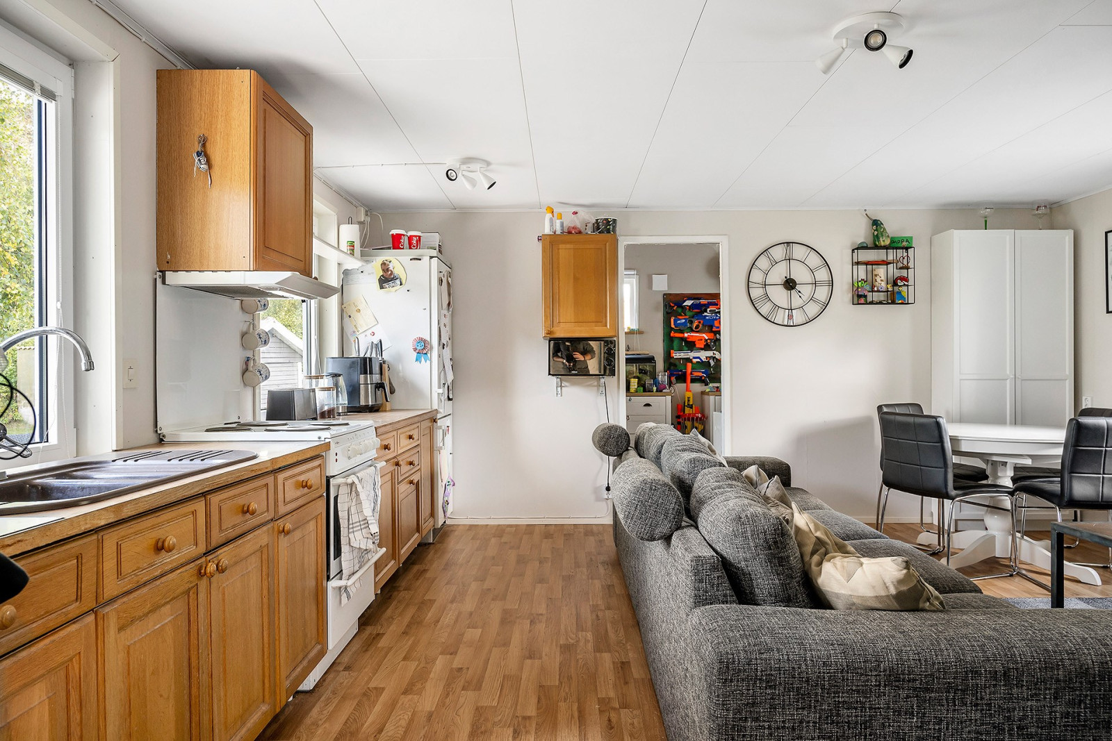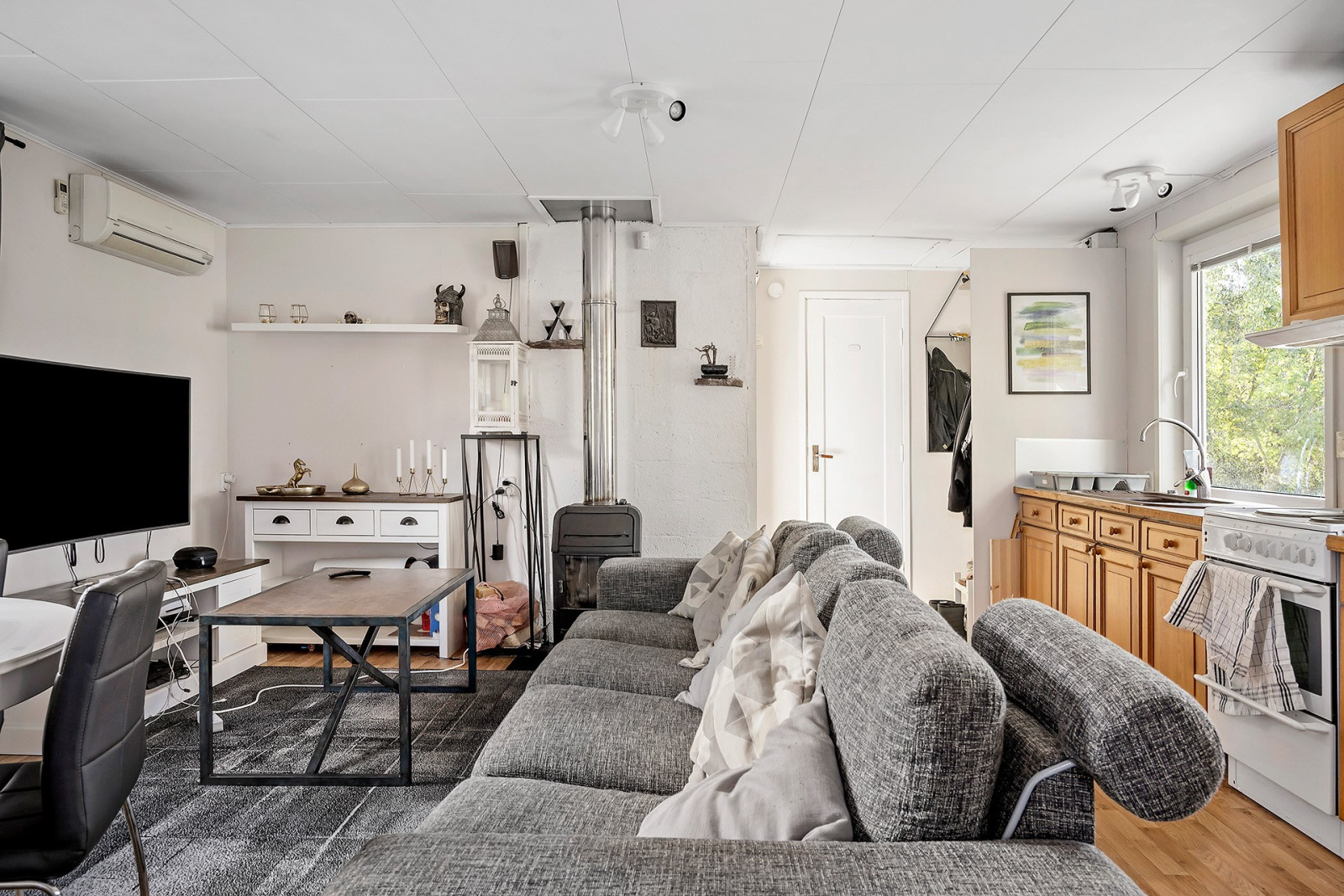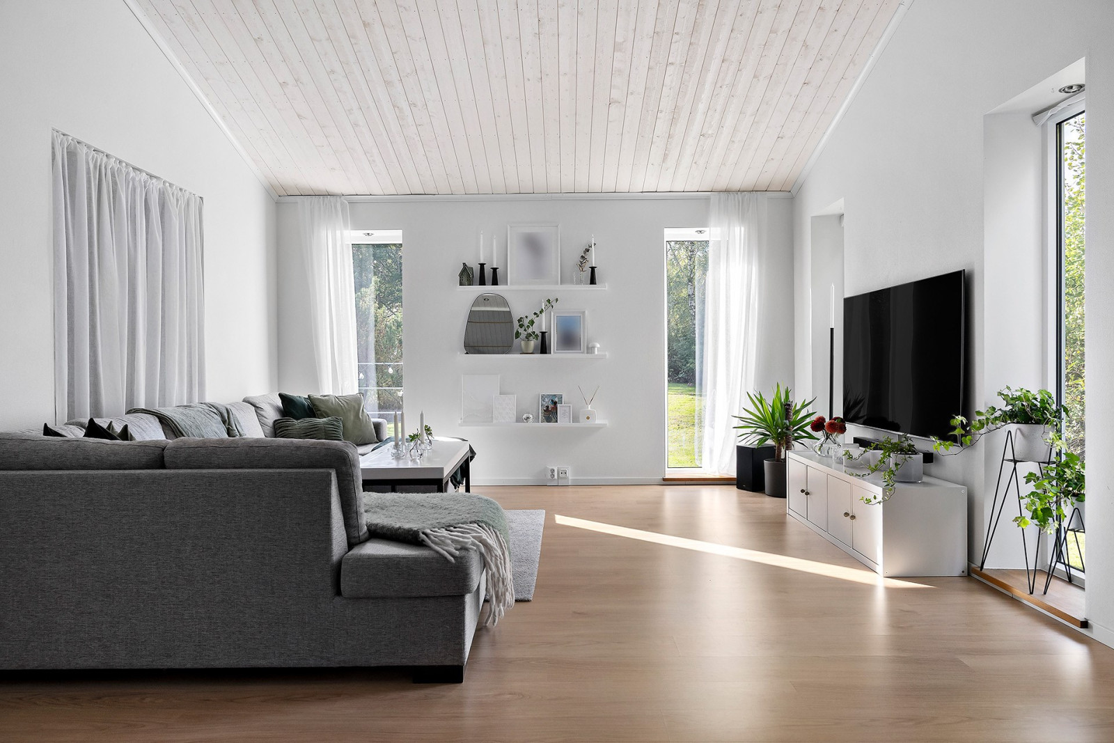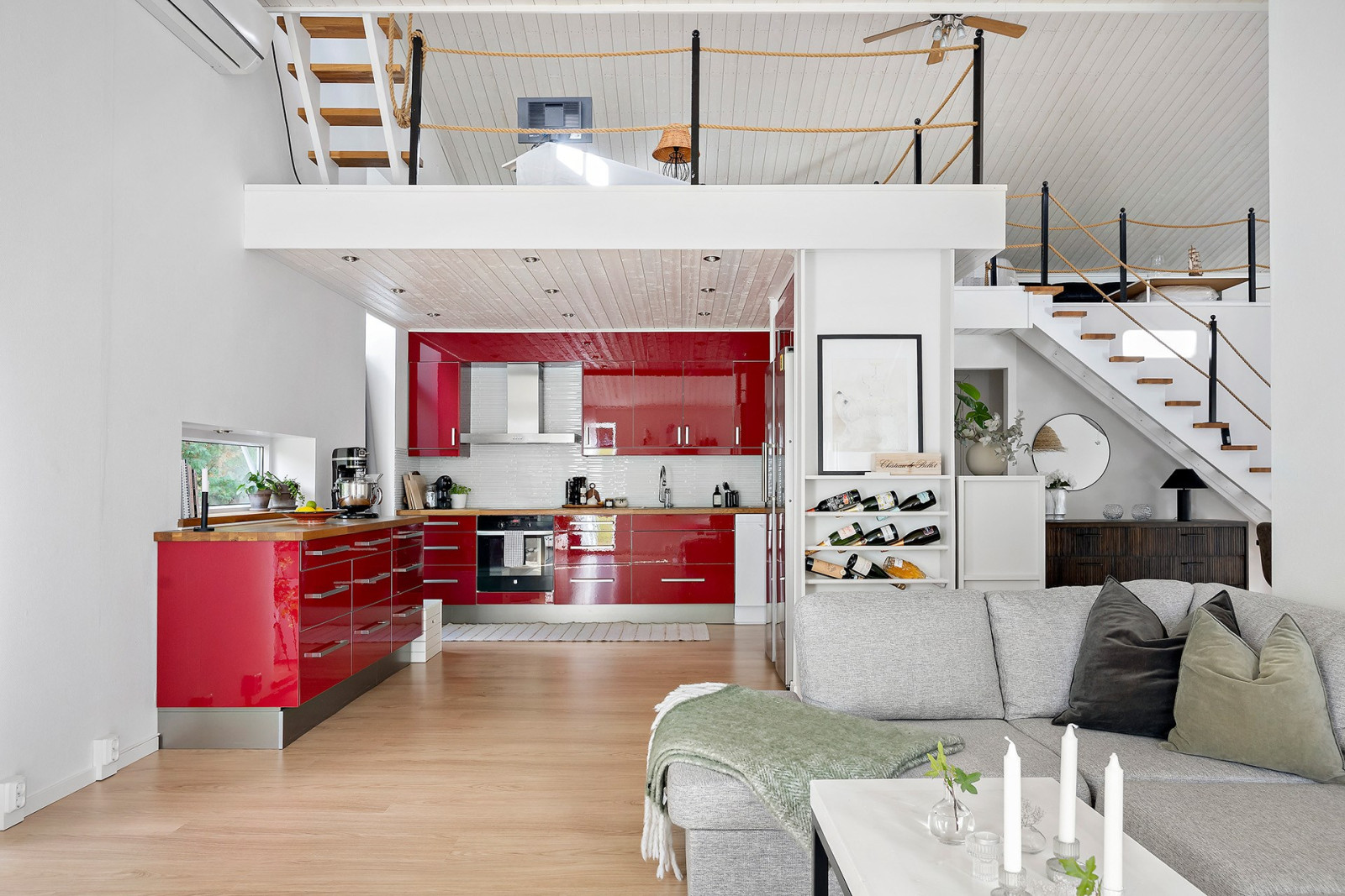 Från hallen öppnar huset upp sig med härlig takhöjd ända upp till nock och ett vackert loft som bidrar till den öppna och ljusa känslan. De stora högfönstren och de liggande fönstren längs loftgången släpper in rikligt med dagsljus och skapar en trivsam atmosfär året runt. Till höger i hallen finns en rymlig skjutgarderob med gott om förvaring, och härifrån leder även ektrappan upp till loftet. Planlösningen bjuder på en fin öppenhet mellan kök, vardagsrum och loft – perfekt för umgänge och familjeliv. Vidare från allrummet nås de två sovrummen samt badrummet. Det färgstarka köket har högblanka köksluckor, generösa arbetsytor och gott om förvaring. Här finns även stora fönster som släpper in ett vackert ljus över den fristående köksbänken. Vardagsrummet ligger i direkt anslutning till köket och har en stor öppning mot allrummet, vilket förstärker känslan av rymd. Fyra höga fönster bidrar till ett fantastiskt ljusinsläpp och från rummet leder pardörrar ut till det trivsamma uterummet – en perfekt plats för sommarens middagar och avkopplande stunder. Loftet ramas in av rep och svarta smidesstolpar som ger en unik karaktär. Här finns gott om yta för både umgänge, arbete eller extra sovplats, samt ytterligare en liten trappa som leder upp till loftgången. Uterummet har även det en fin rymd med tre högfönster, skjutdörrspartier åt väster ut till altanen samt ett fint klinkergolv med golvvärme (el).