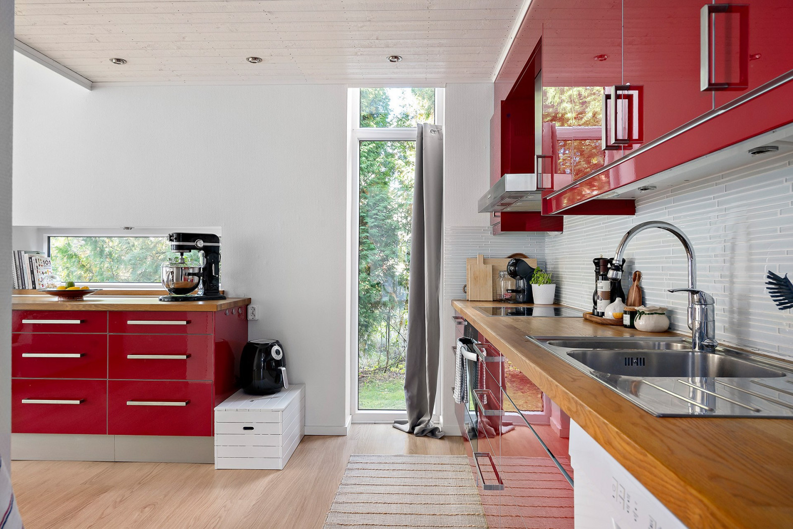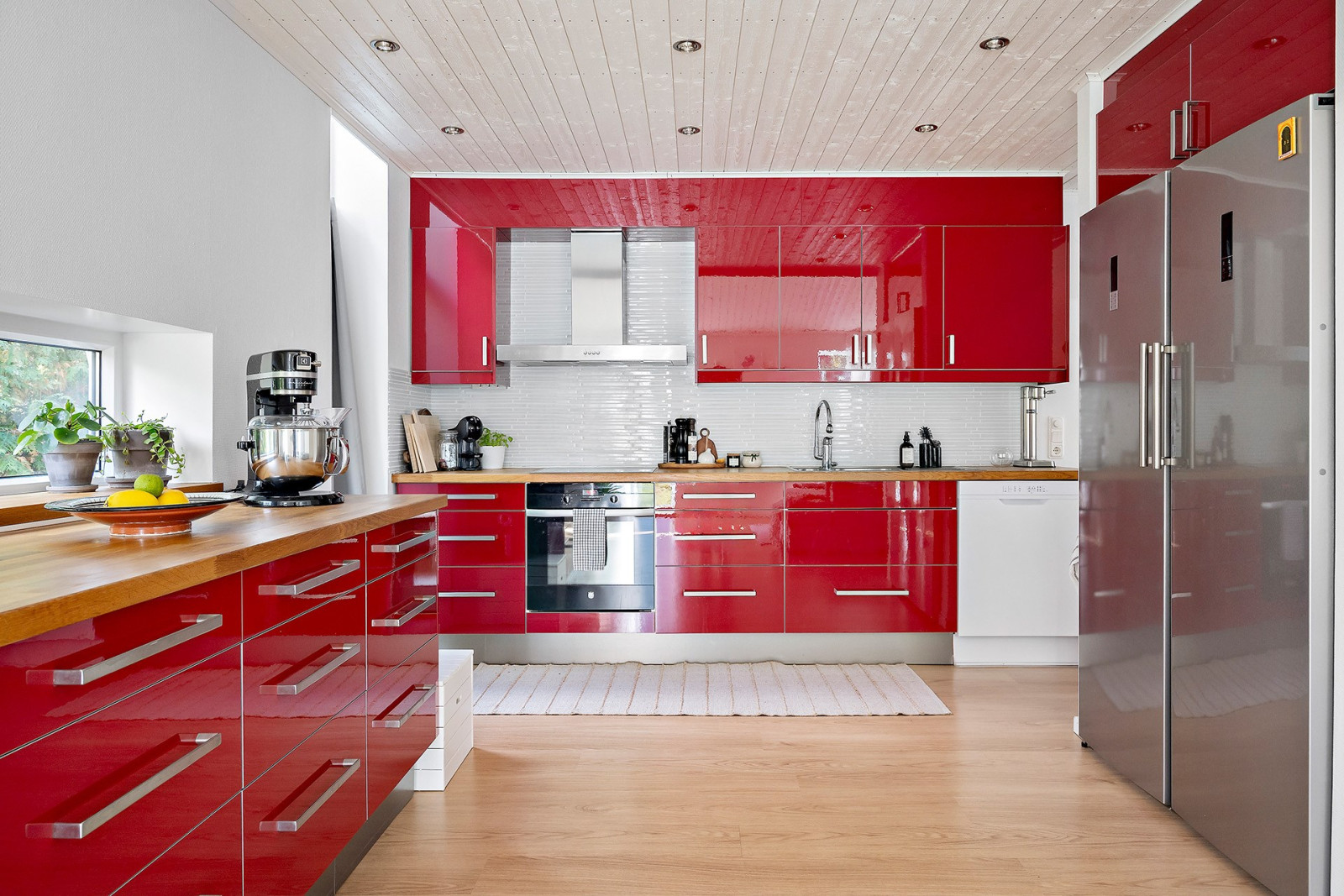 Ikea kök med högblanka skåpsluckor, ekbänkskivor, glas keramik ovan köksbänk. Utrustat med spishäll (induktion), fläktkåpa, inbyggnadsugn, diskmaskin, kyl/frys, infälld takbelysning.