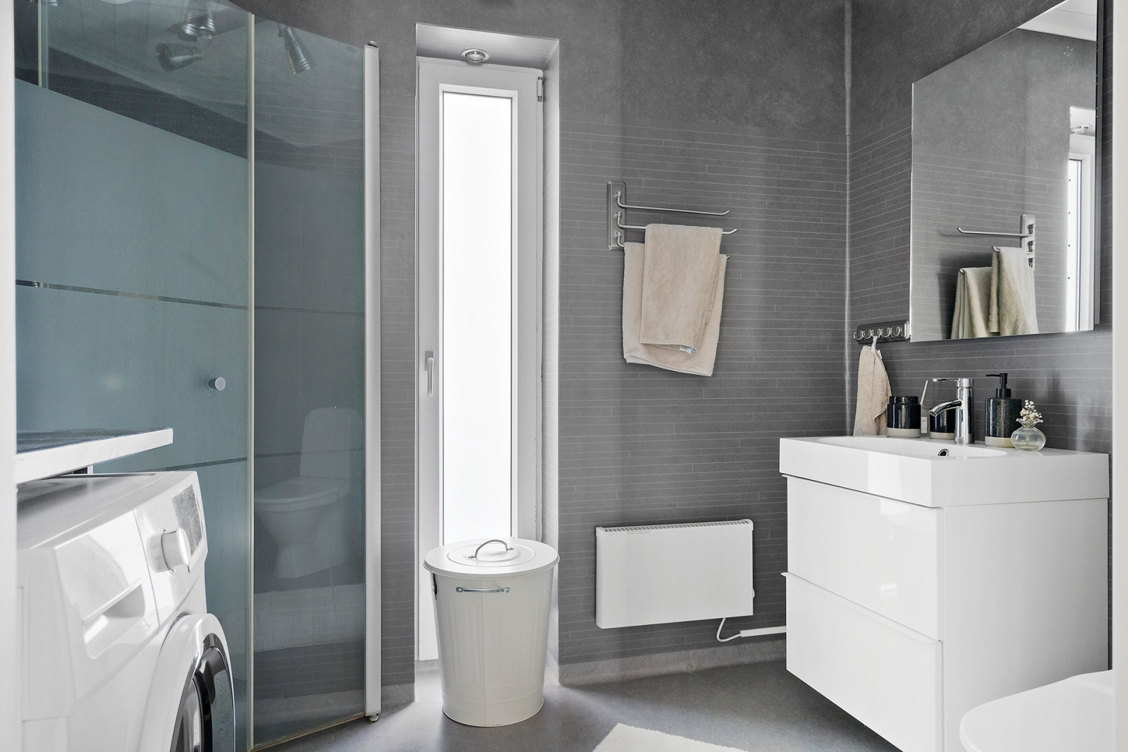 Inrett med plastmatta, våtrumsmatta, wc, tvättställ, belyst badrumsspegel, dusch (vikdörrar), tvättmaskin samt vädringsfönster åt öster.