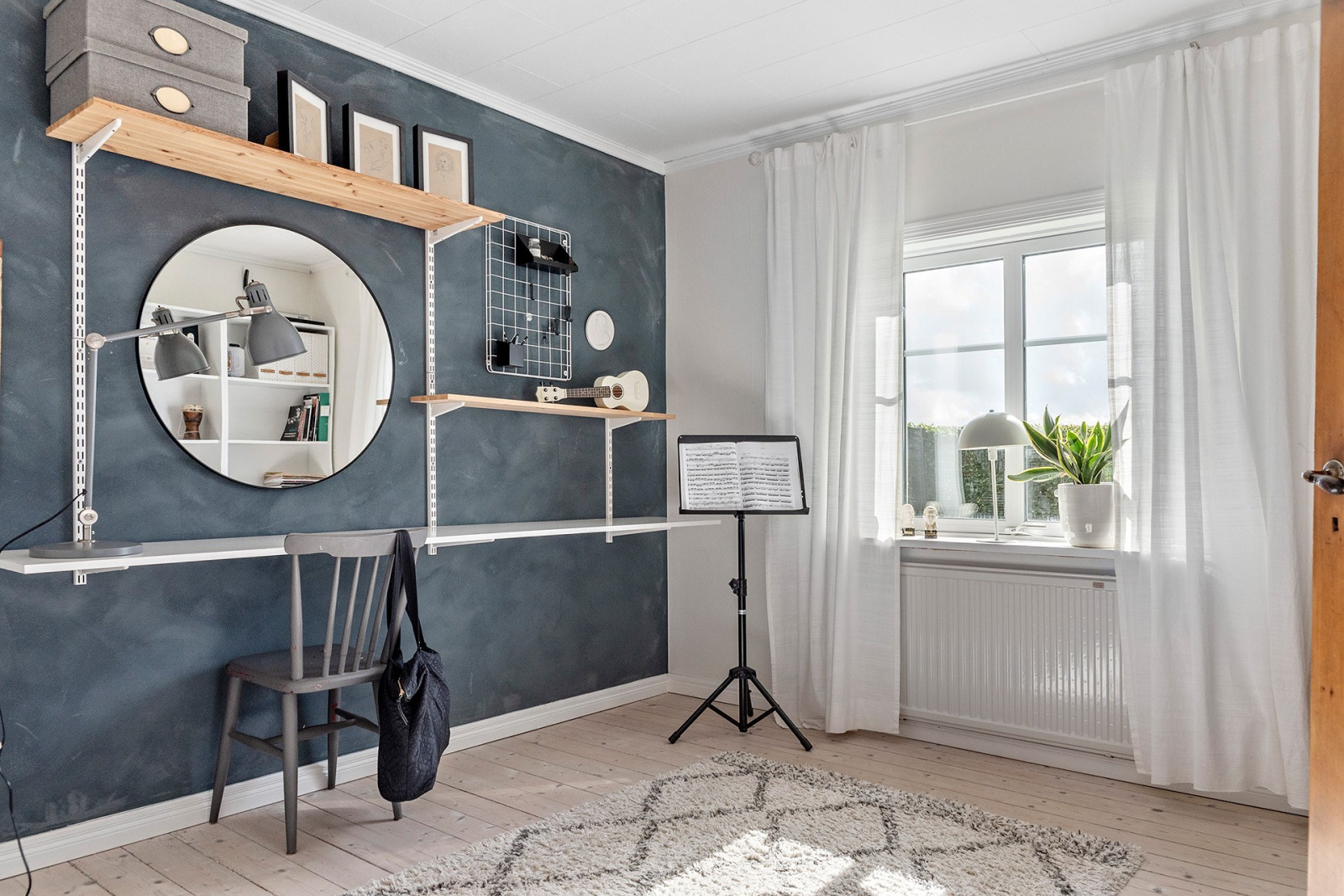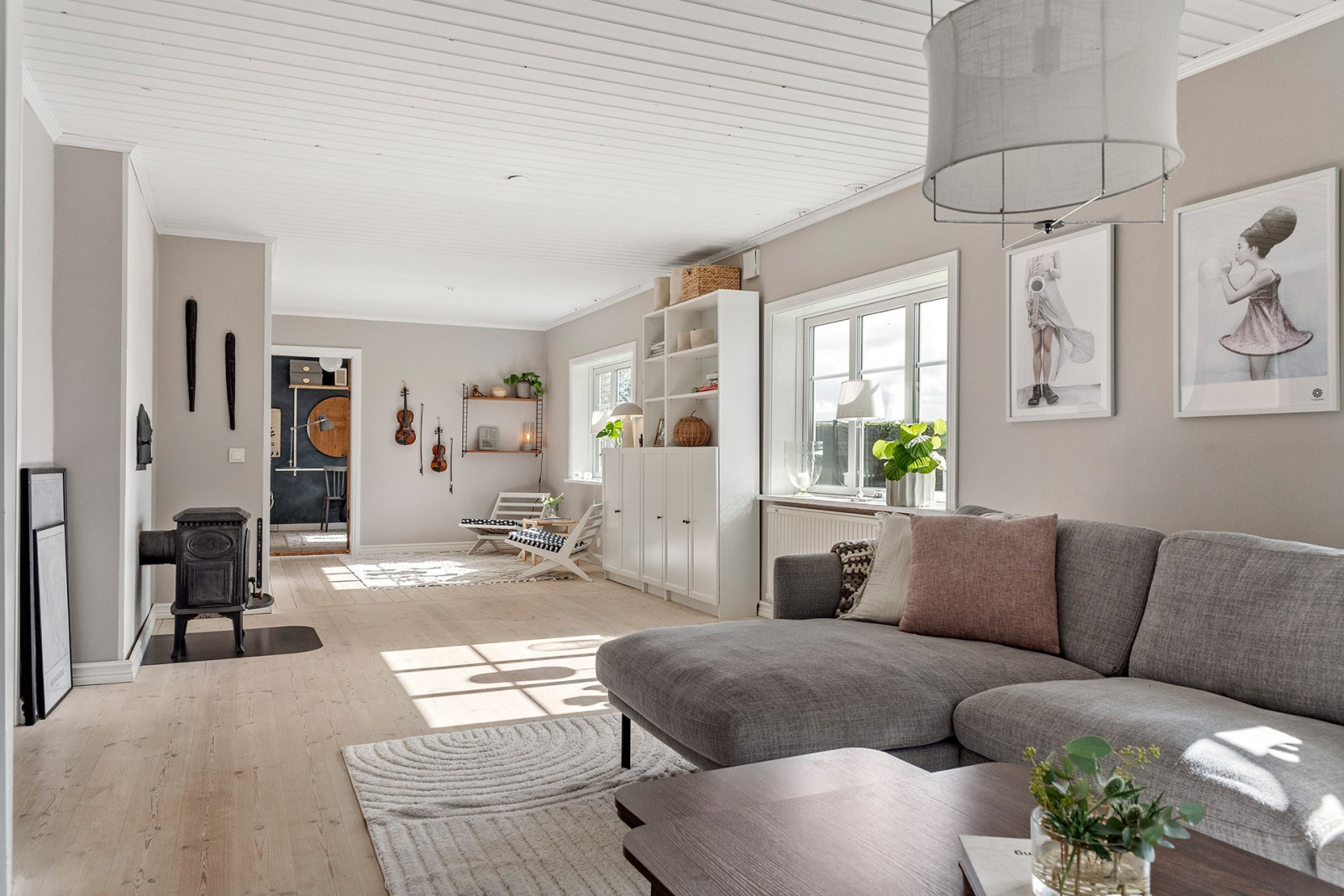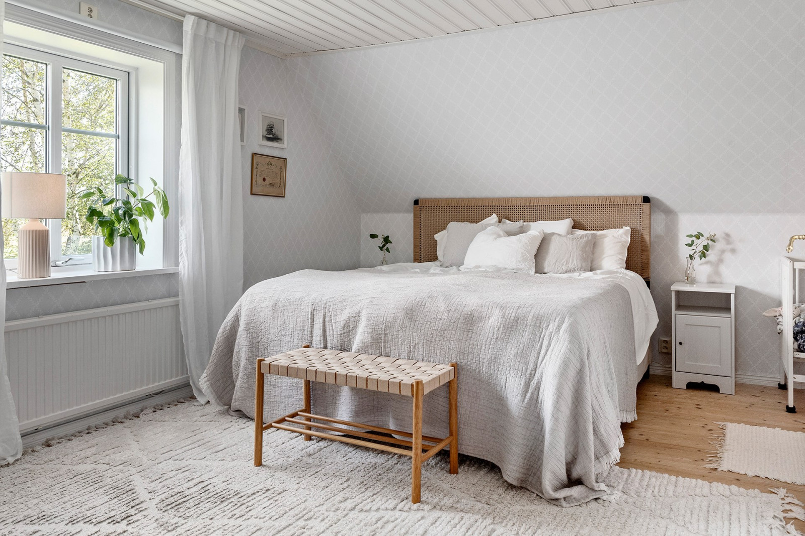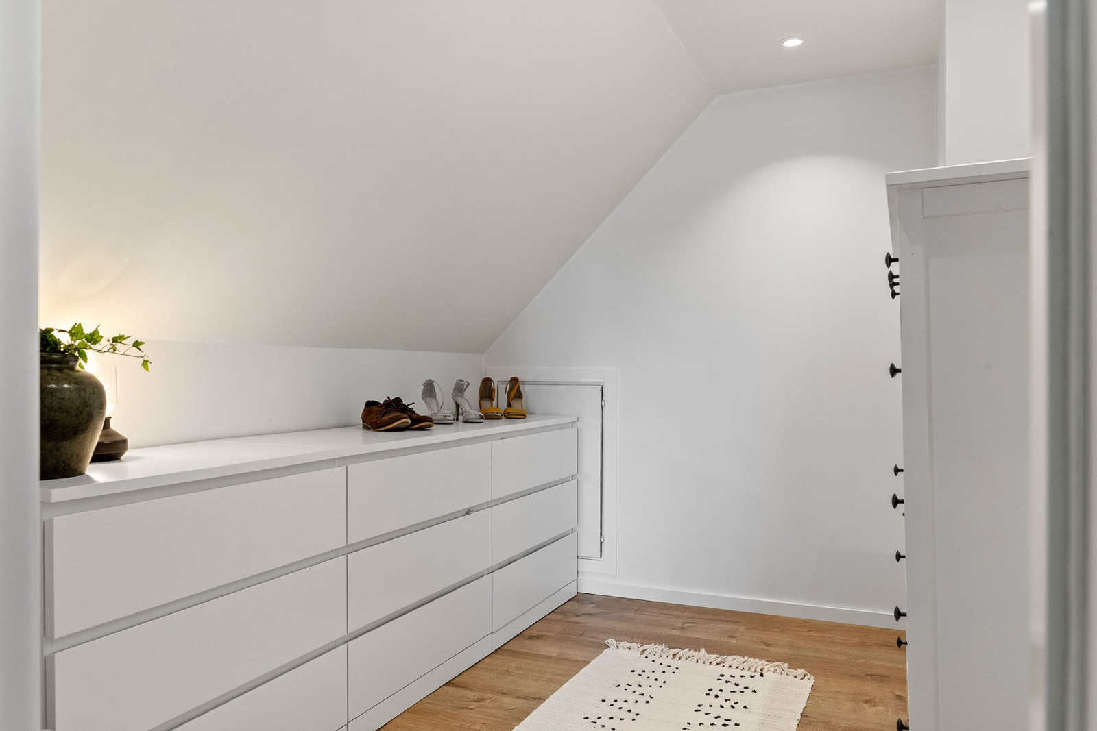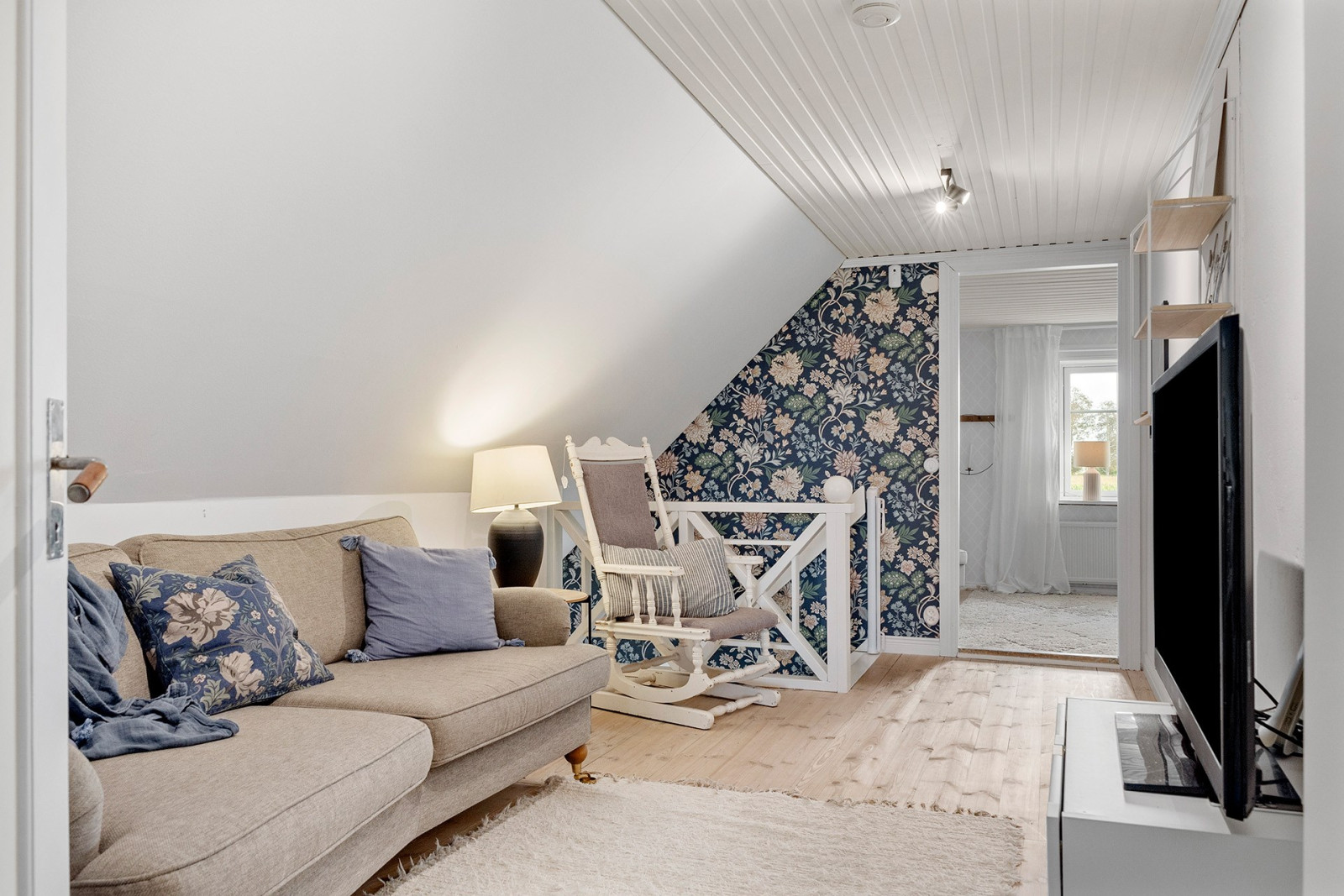 På ovanvåningen finns ett allrum i mitten samt ett rymligt sovrum i vardera gavel. I det ena sovrummet finns en walk-in-closet för bra förvaring.