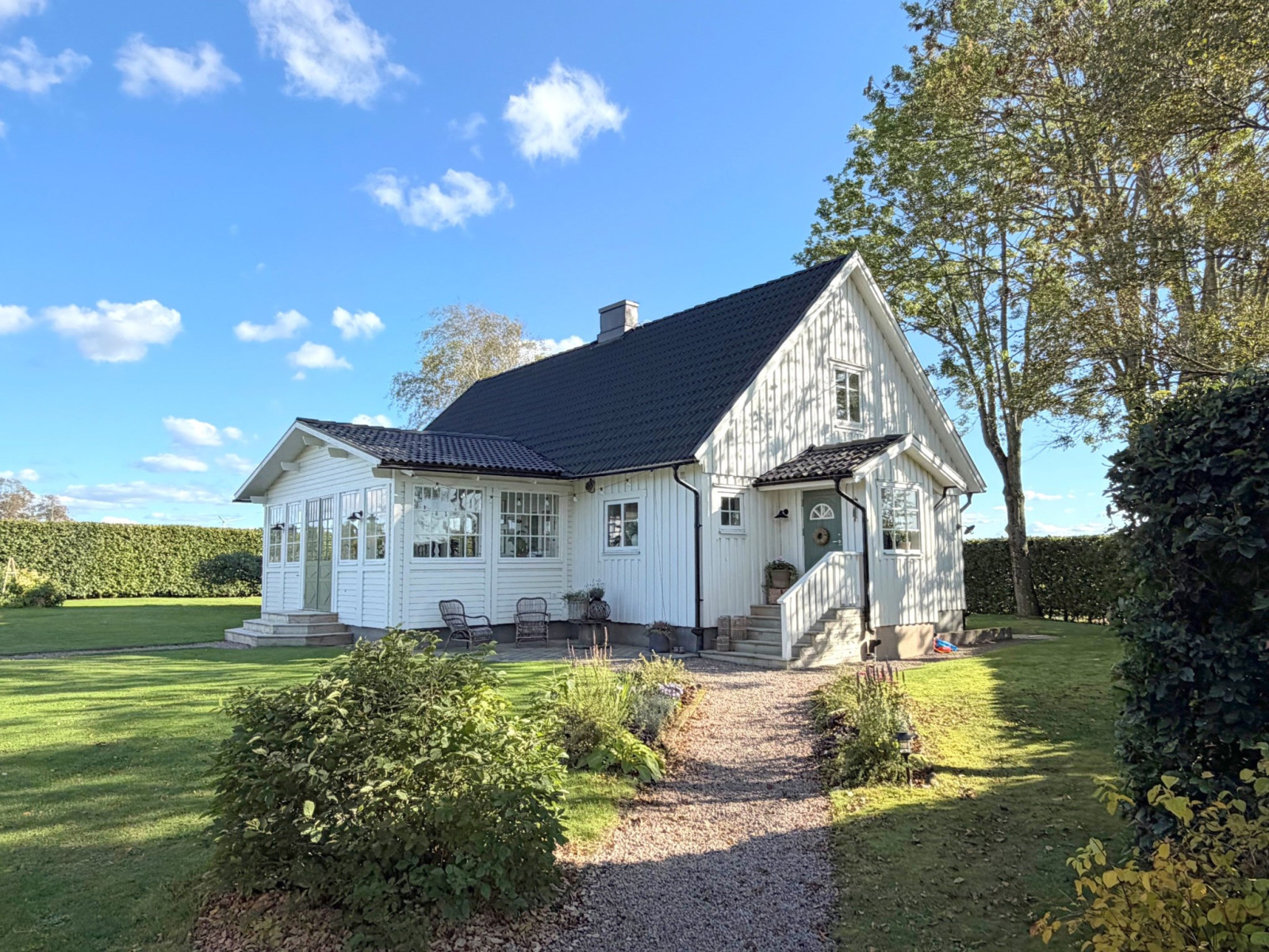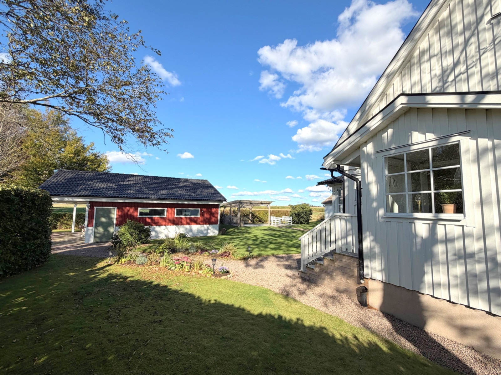 Vacker och väl anlagd trädgård med rabatter, gångar, träd och uteplatser.Uteplats/balkong