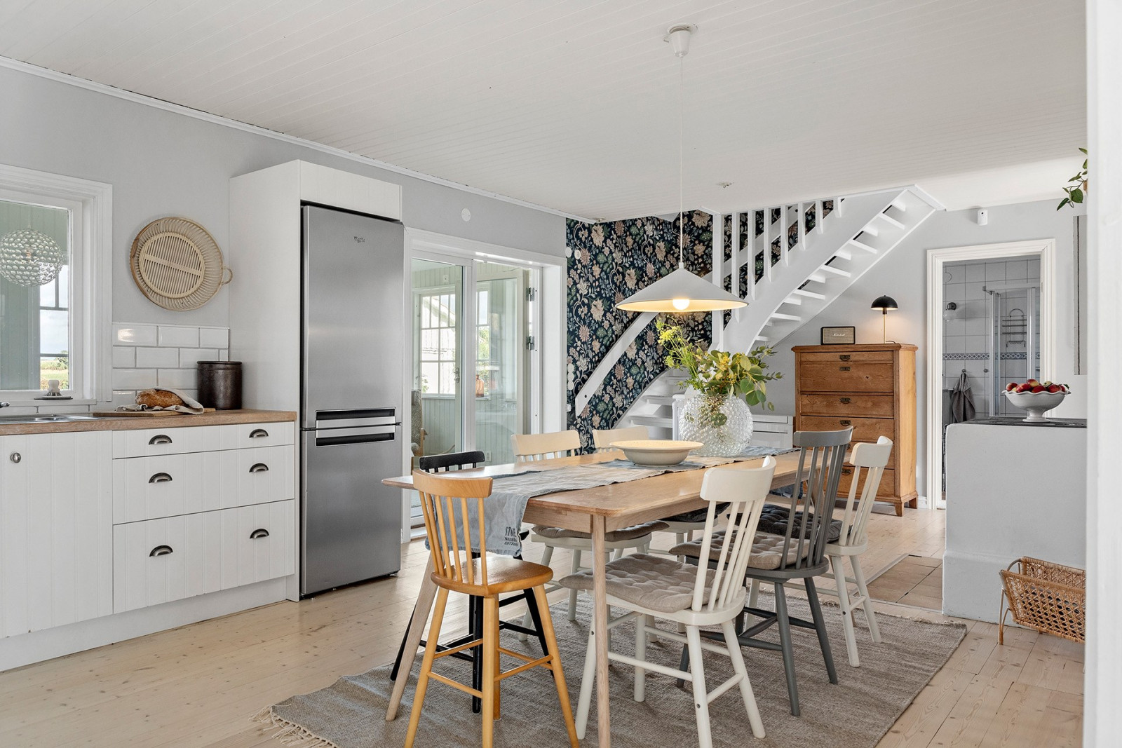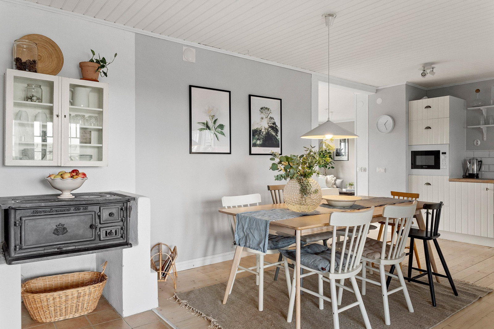 Lantligt kök med vit köksinredning och stor matplats. Spis (ca 2021), spisfläkt (ca 2021), inbyggd mikrovågsugn, kombinerad kyl/frys (ca 2019) samt diskmaskin. I köket finns även en vedspis. (Ej kontrollerad.)