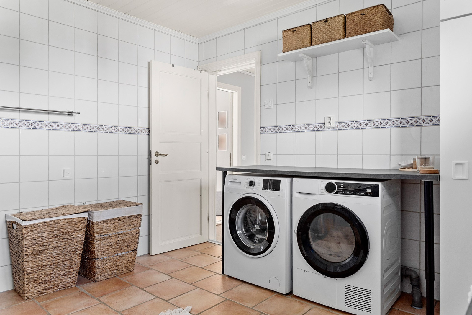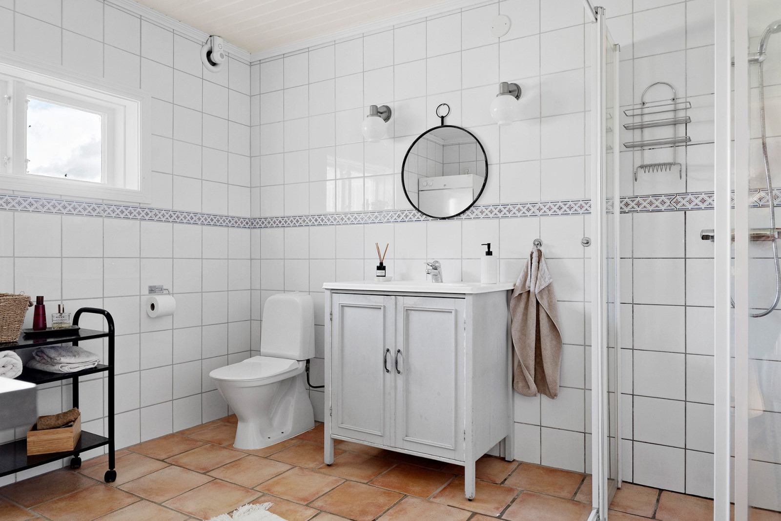 Badrum: Helkaklat badrum med golvvärme (el). Wc, handfat, dusch, tvättmaskin (ca 2019), torktumlare (2025), torkskåp.
