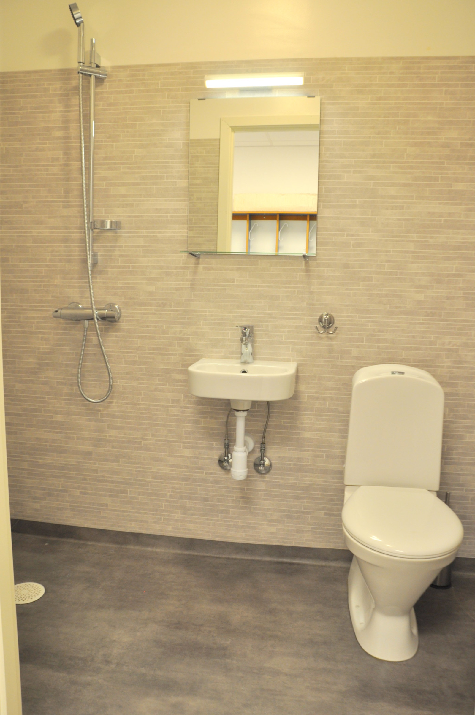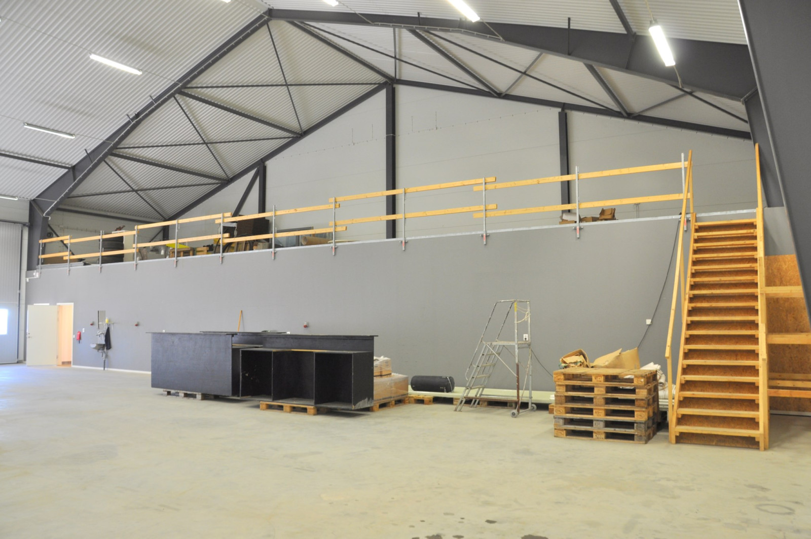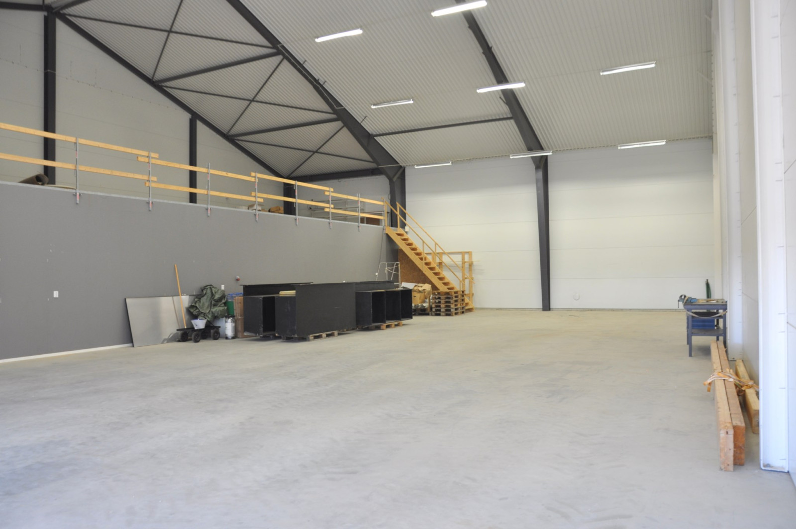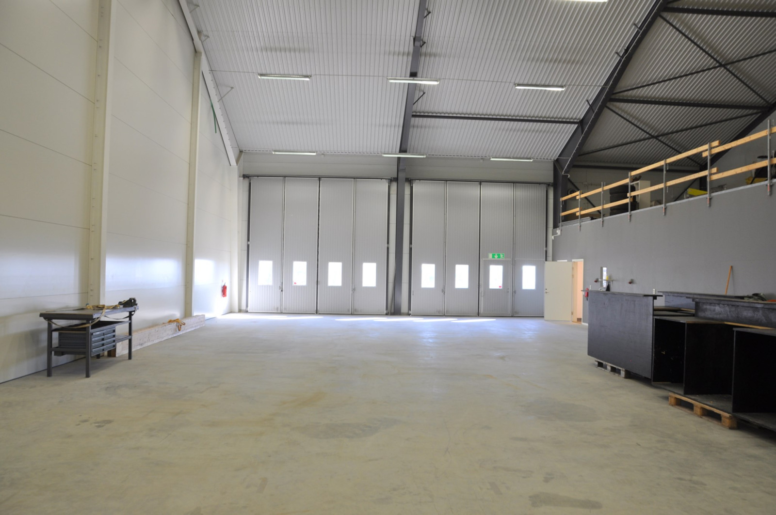 Rejäl hall med förstärkt platta om 288 kvm. Två rejäla vikportar (5 x 5 meter) och en takhöjd på 6,5 meter på den lägre delen och hela 9,5 meter på den högre. I anslutning till hallen finns även ett omklädningsrum med tvättmaskin och torkskåp samt ett badrum med WC, handfat och dusch. Entresolplan på 100 kvm finns och kan efter överenskommelse eventuellt nyttjas av en hyresgäst.