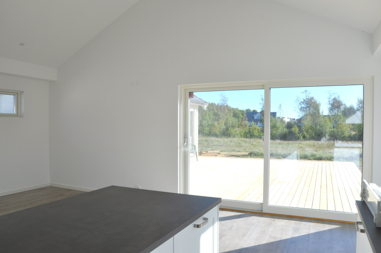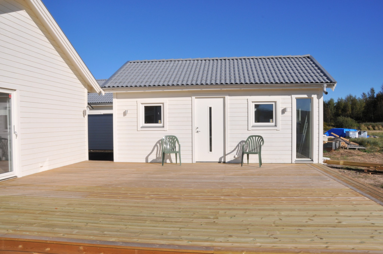 Lättskött tomt med asfalterad uppfart, stort altandäck samt gräsmatta.Uteplats/balkong