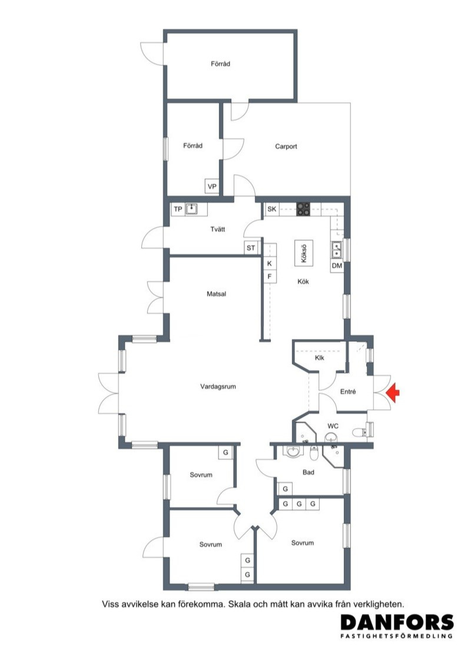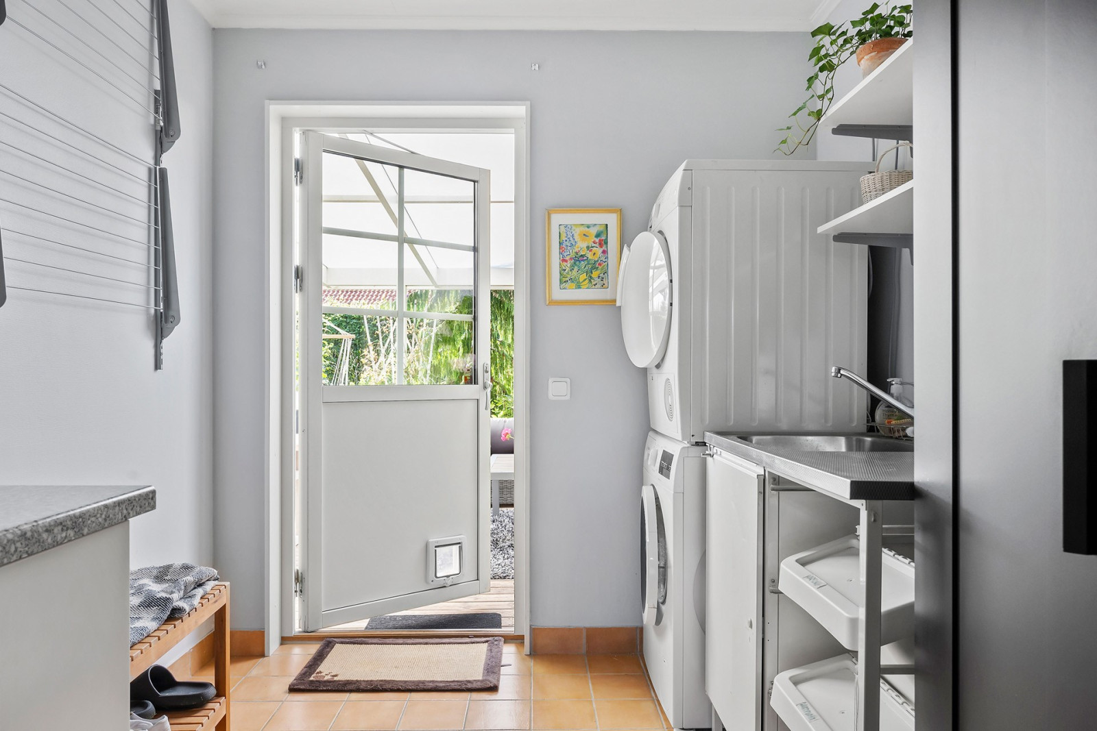 Torktumlare samt en nyare tvättmaskin finns i groventrén. Här finns också arbetsbänk och vask samt utgång till såväl carporten som altanen.