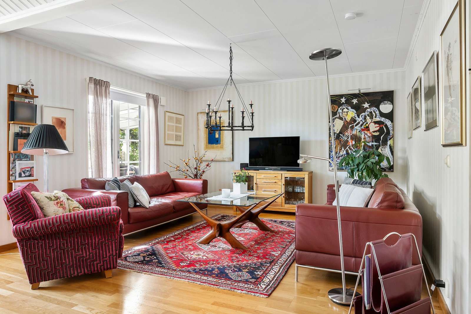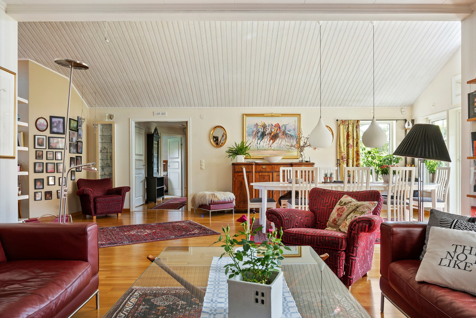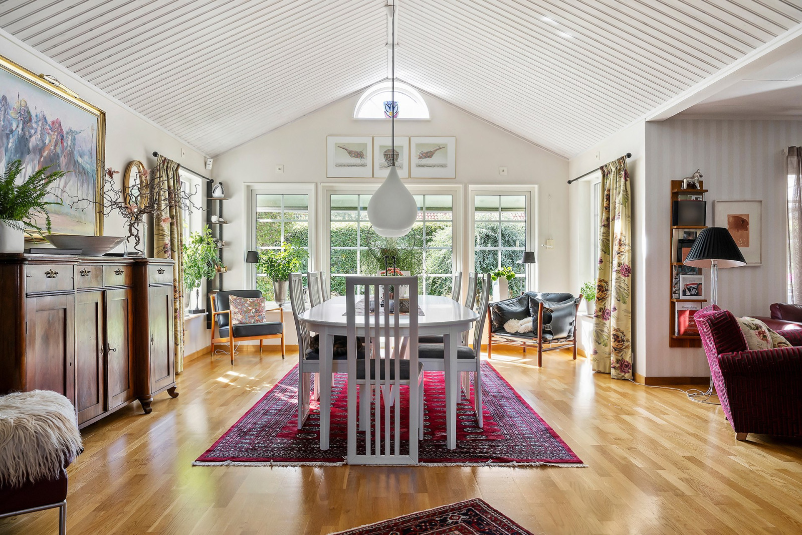 Entré sker till en klinkerbelagd hall med avhängningsmöjligheter samt en klädkammare för bra förvaring. Direkt till vänster ligger ett helkaklat badrum med dusch. Rakt fram nås det fantastiska sällskapsrummet med ryggåstak och fönsterpartier mot trädgården som ger ett härligt ljusinsläpp. Här finns gott om plats för umgänge med både matplats och soffgrupp och rummet har två utgångar till trädgården via glasade dubbeldörrar. Till höger nås det rymliga köket med rejäl matplats och köksö som ger extra förvaringsutrymme och arbetsyta. Vidare genom köket nås groventré och tvättstuga. Via groventrén har man en direkt ingång i huset från carporten. Tvättstugan har även utgång till den mysiga altanen med tak.