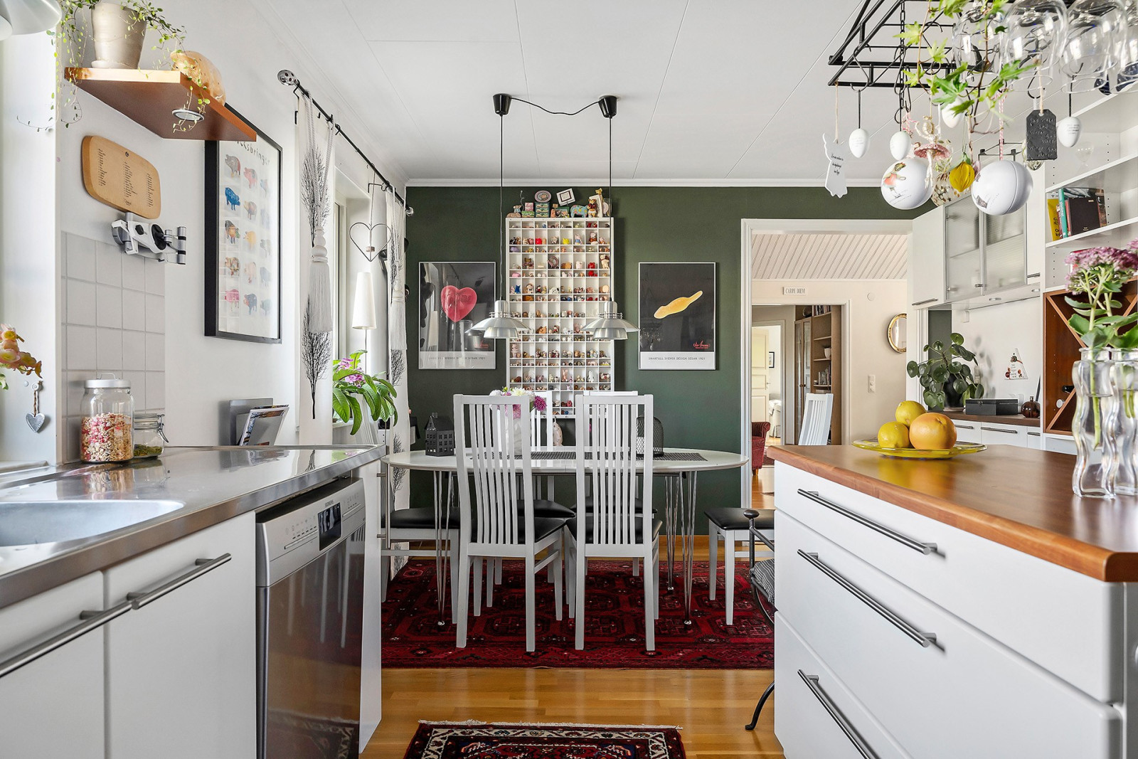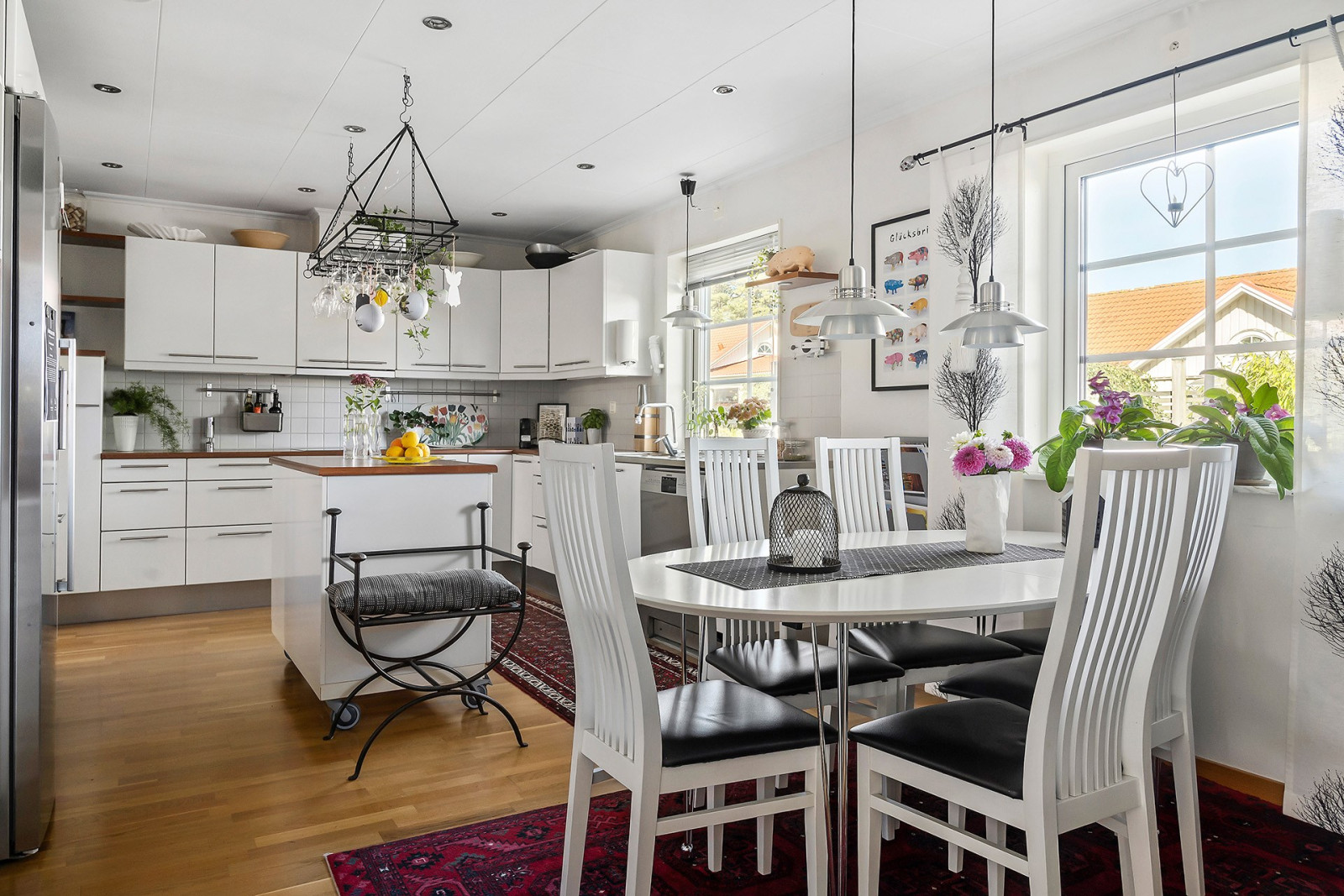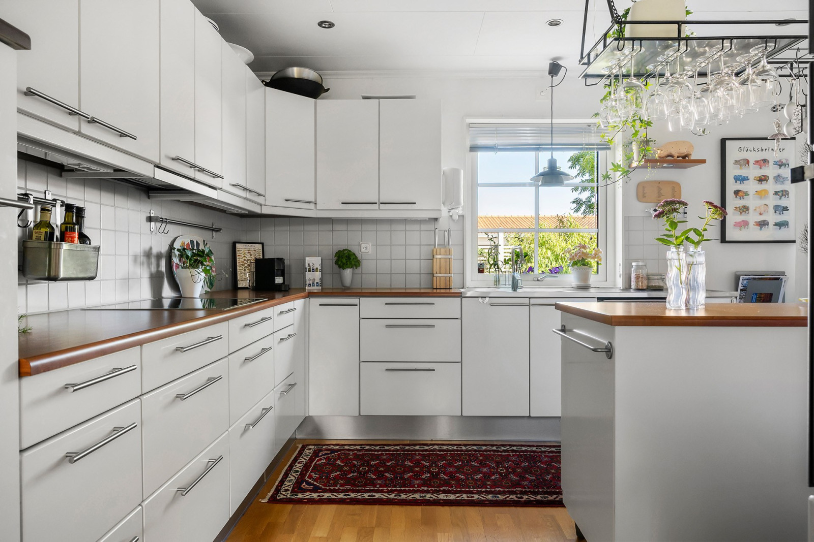 Köksinredning från HTH med en köksö med extra förvaring. Köket kompletterades med ytterligare skåp 2014. Bänkskiva i trä och praktiskt kakel som stänkskydd. Köket är utrustat med spishäll, spisfläkt, inbyggd mikro, inbyggd ugn, kylskåp (2019), frysskåp, diskmaskin (2024).