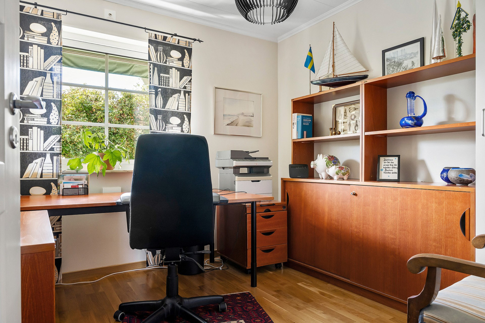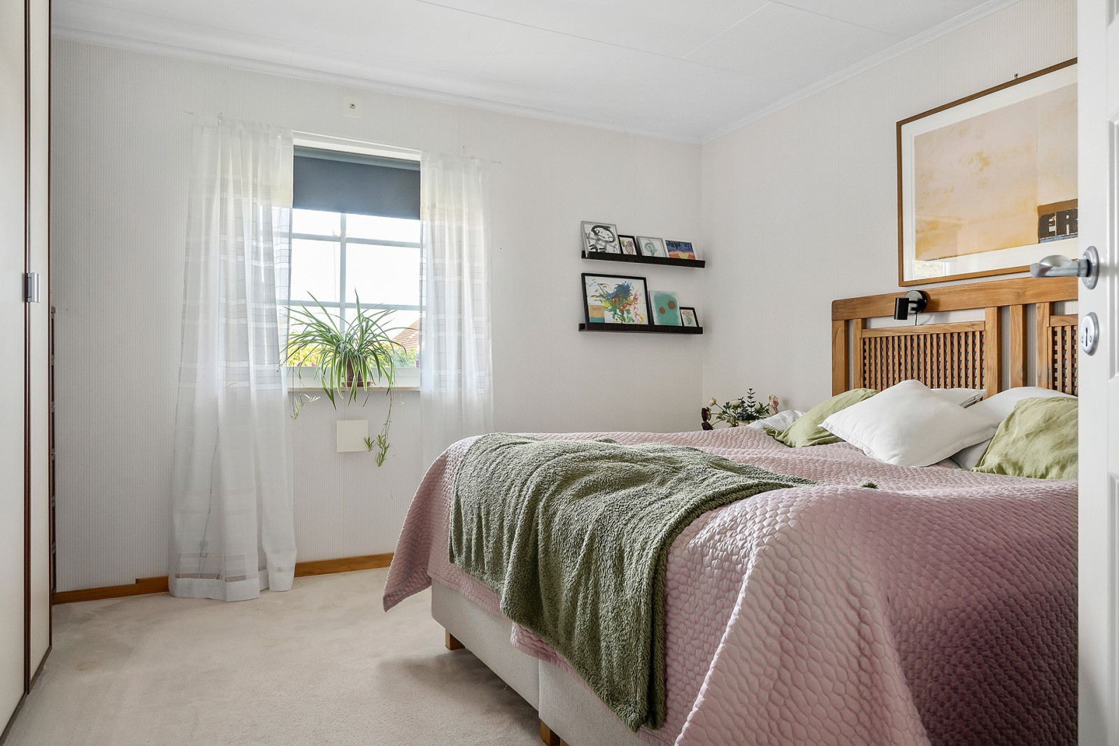 I husets vänstra del finns sovrumsavdelningen med tre sovrum samt det andra helkaklade badrummet med dusch. Ett av sovrummen har utgång till altanen och trädgården.Kök