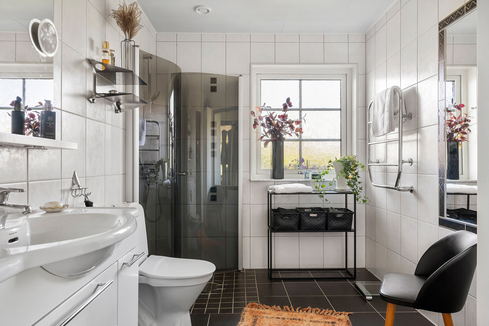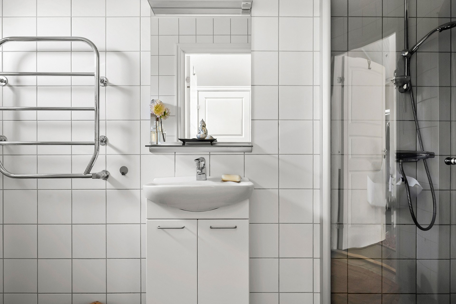Två helkaklade badrum. Båda badrummen är utrustade med WC, handfat, dusch och handdukstork.
