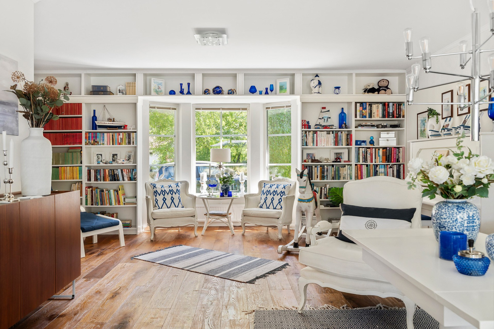 Entré sker via via den insynsskyddade trädgården. Här möts vi av en rymlig hall med garderober. Rakt fram finns det fullutrustade köket. Väljer man dörren till höger kommer man in i ett trivsamt allrum med plats för både matplats och soffgrupp framför den mysiga och värmande braskaminen. Rummet har stora fönsterpartier mot uterummet och trädgården åt två håll. Två trappsteg ner från allrummet kommer man vidare till ett stort ljust charmigt sällskapsrum med burspråk åt ena hållet och utgång till uterummet via glas-vikdörrar åt andra hållet.
