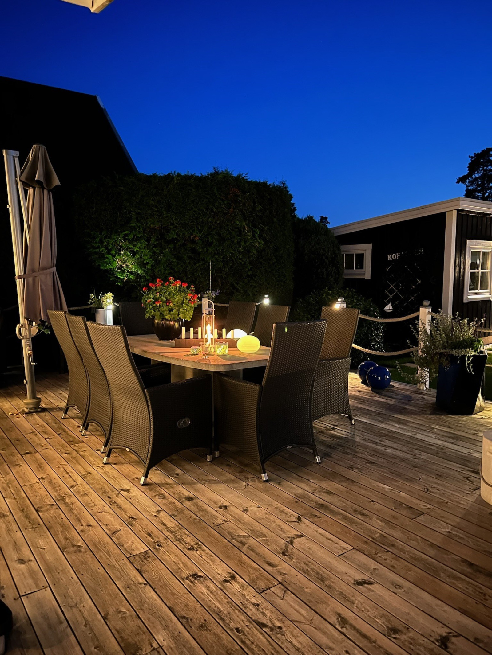 C:a 20 kvm stort klinkerbelagt inglasat uterum med golvvärme (2002). Öppen trallbelagd altan i vinkel (2020). Stenbelagd uteplats. Eldriven markis.Bilplats