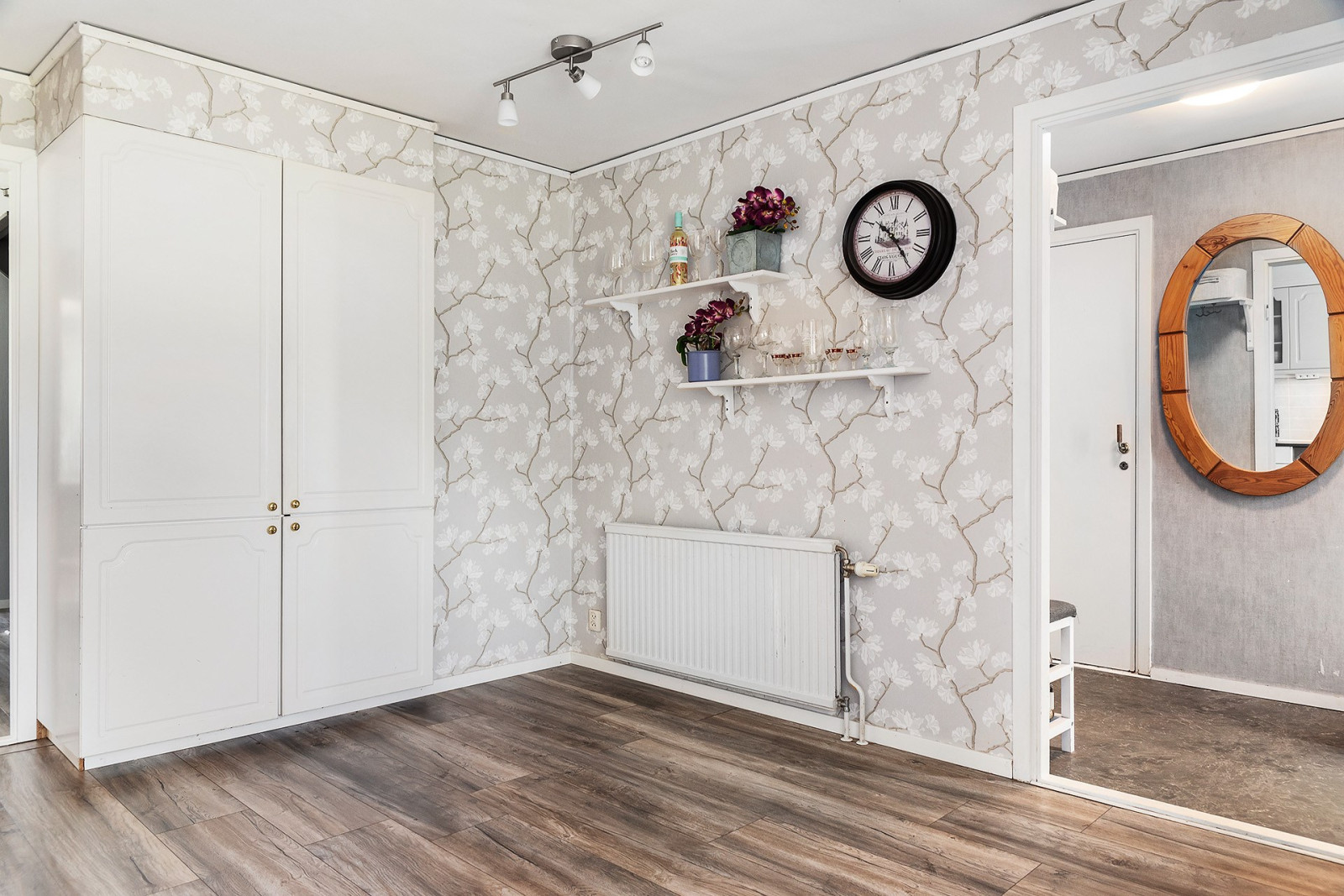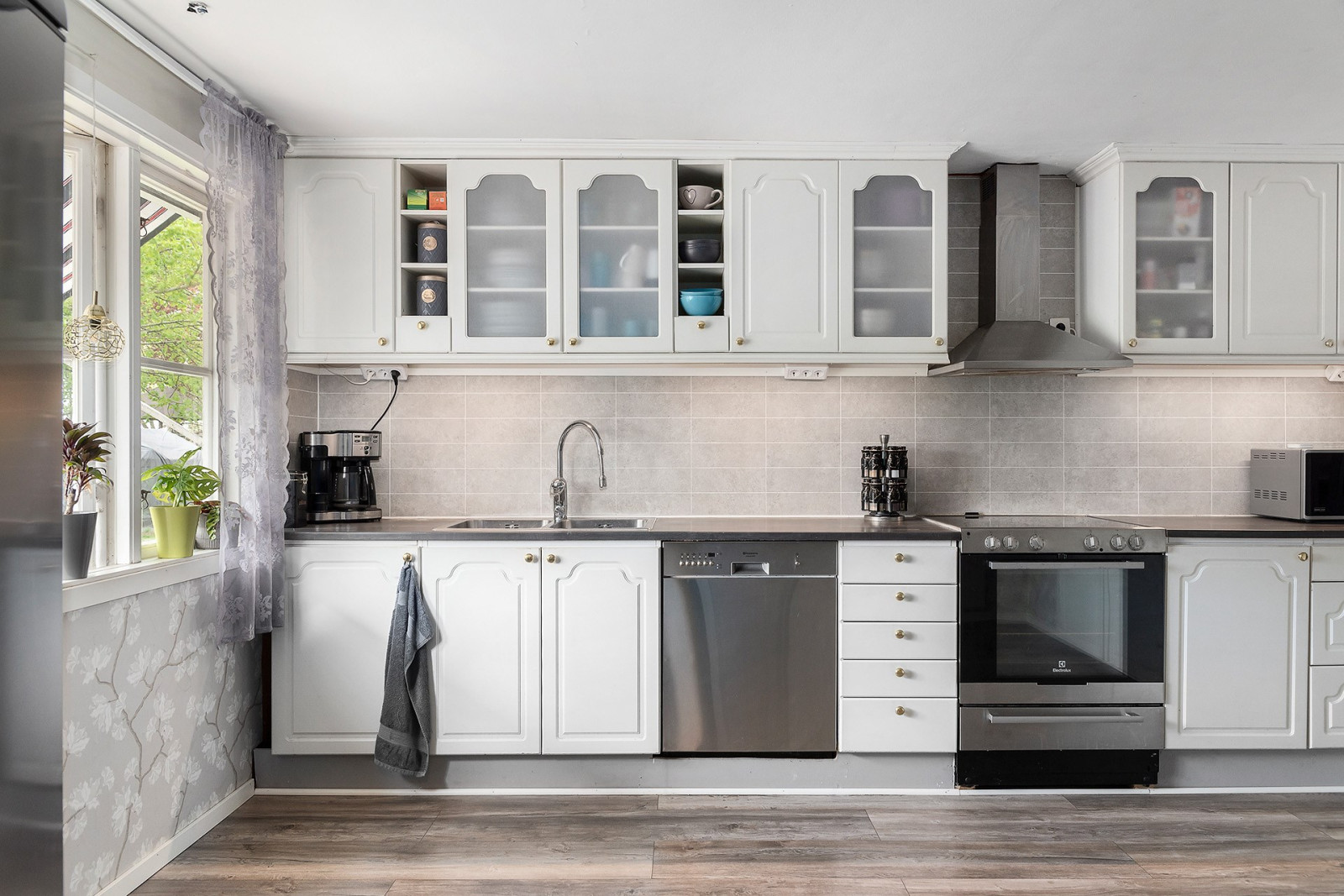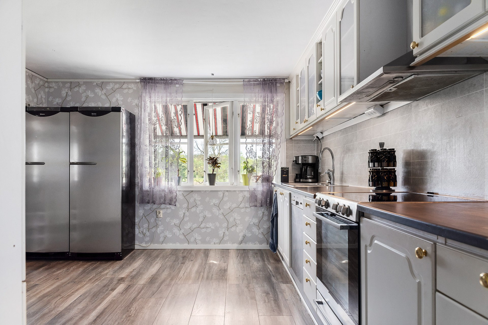 Rymligt kök med bra förvaring som renoverats 2022. Utrustat med vita skåpsluckor, bänkskiva laminat, spis/ugn, fläkt, diskmaskin, kyl, frys, samt plats för matbord. Samtliga vitvaror från 2022.