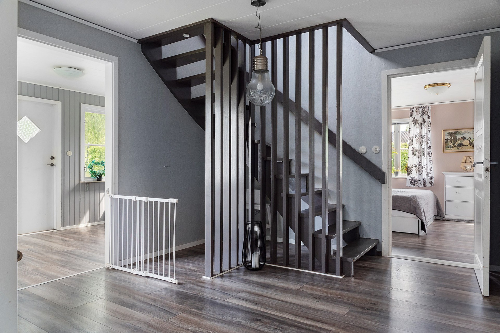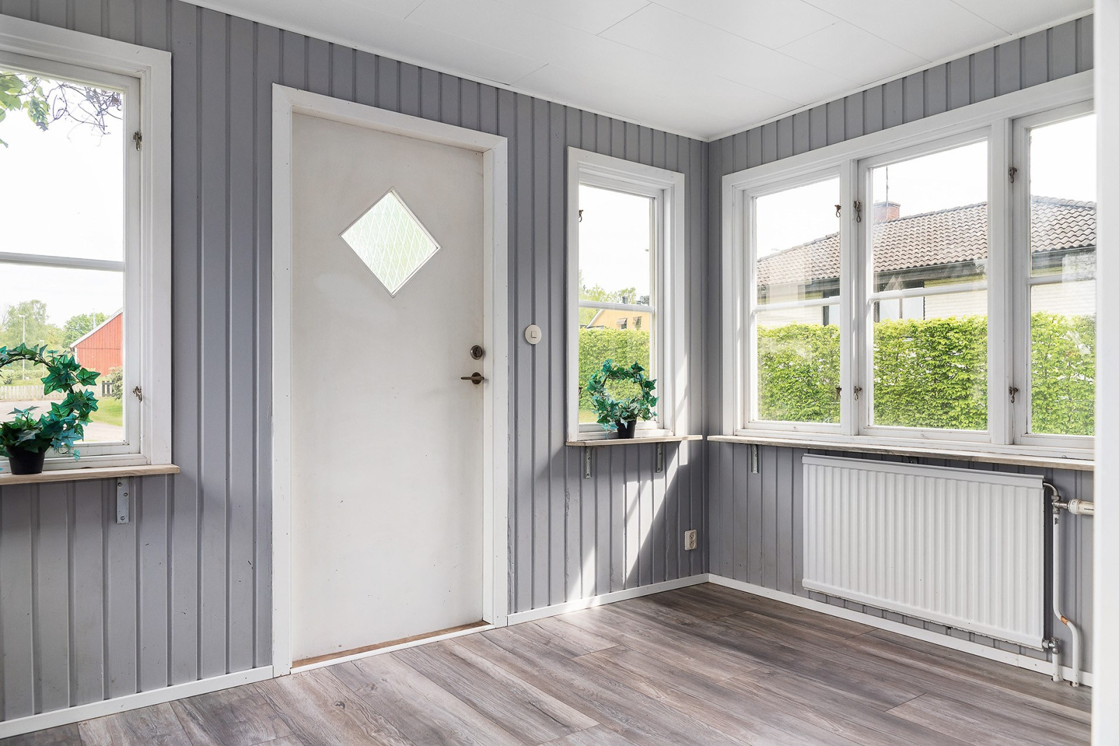 I förlängningen av vardagsrummet finner vi denna veranda, med fönsterpartier runt om. Inrett med laminatgolv samt fin träpanel. Trappan till ovanvåningen ligger i anslutning till verandan.