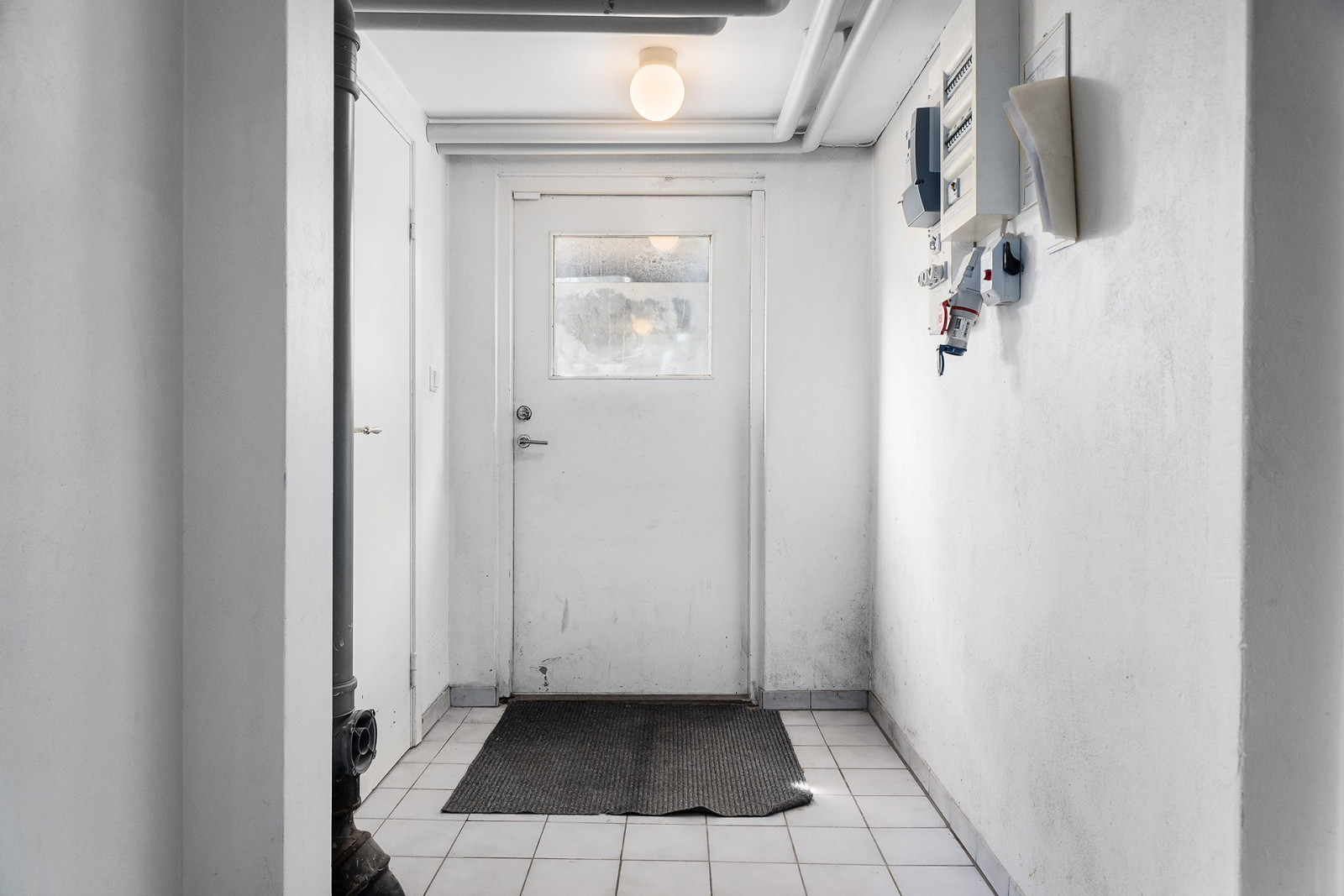 Hallen är inredd med plastmatta, tapet samt praktisk klädavhängning.