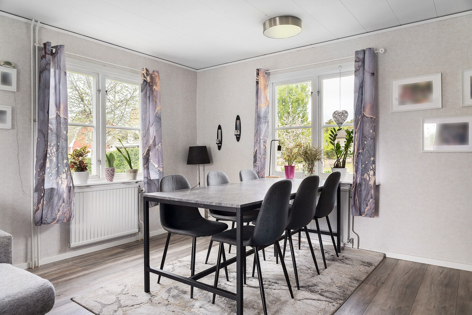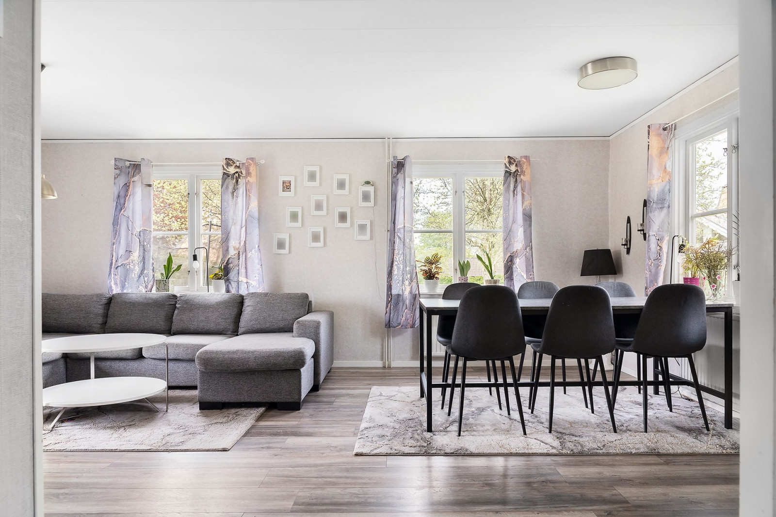 Trevlig vardagsrum med plats för både vardagsrumsmöbler samt matsalsgrupp. Tre fönster som vetter åt väster och norr samt pardörrar mot den stensatta terrassen åt söder.