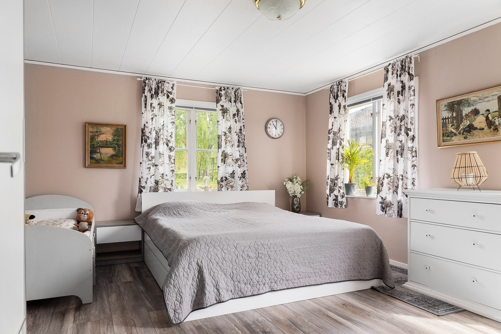 Även detta sovrum har trägolv, tapet och fönster åt öster.