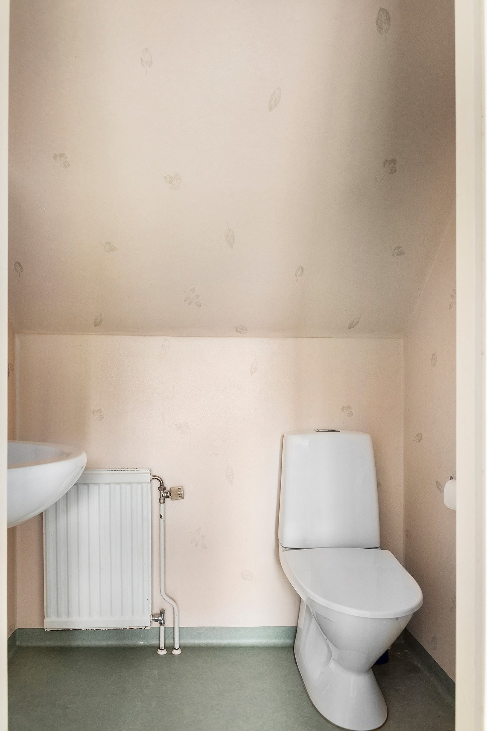 Inrett med plastmatta, våtrumsmatta vägg, wc, tvättställ, möjlighet till dusch samt vädringsfönster åt söder.
