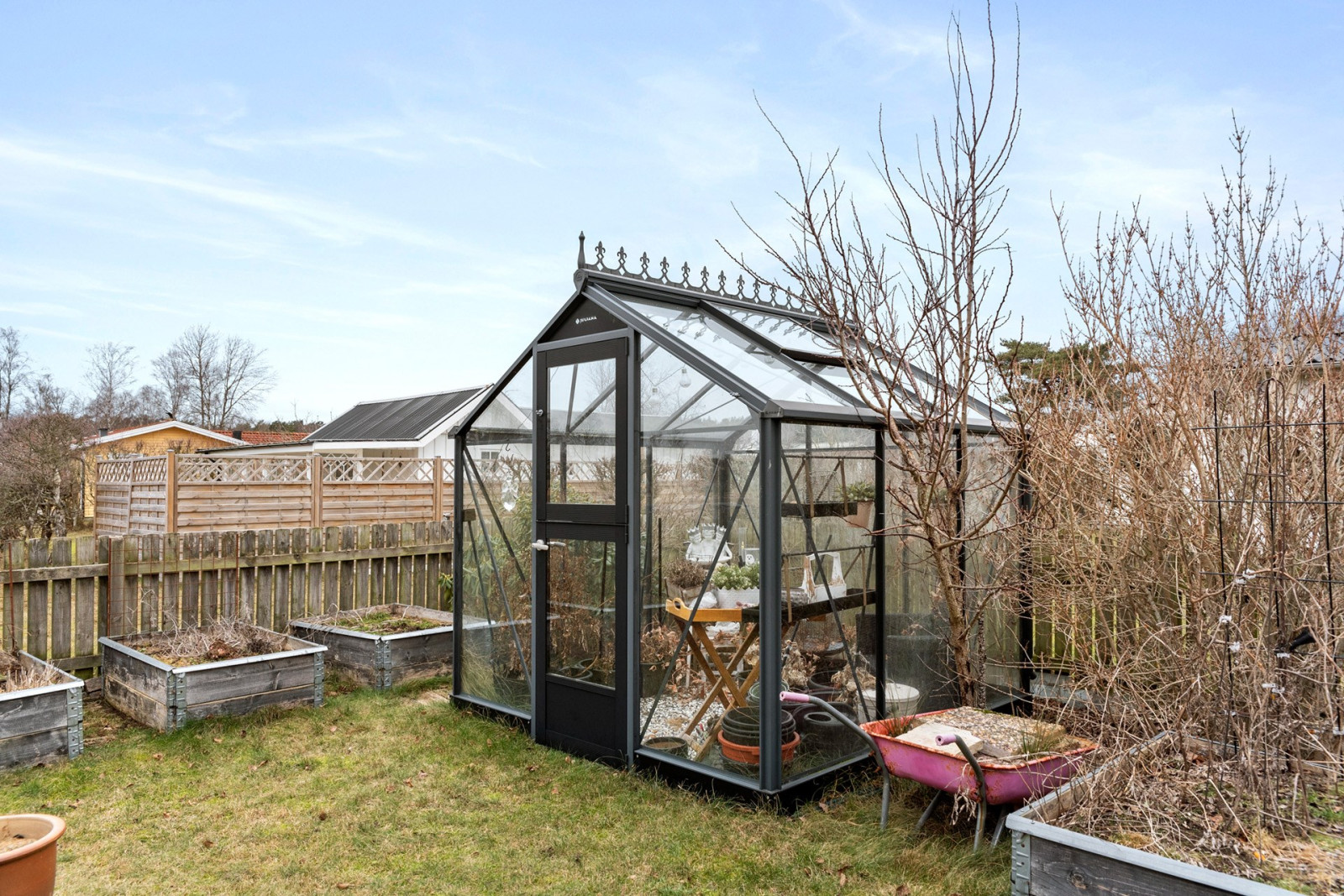 Mysig och ombonad trädgård med flertalet fruktträd och ett växthus i bra skick för ytterligare odlingsmöjligheter.Uteplats/balkong