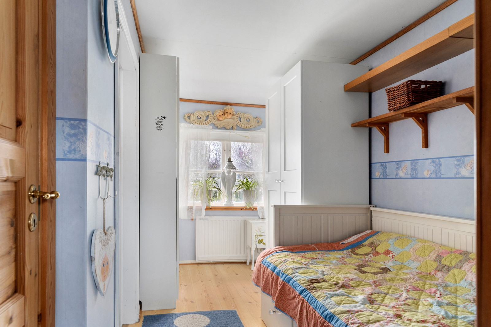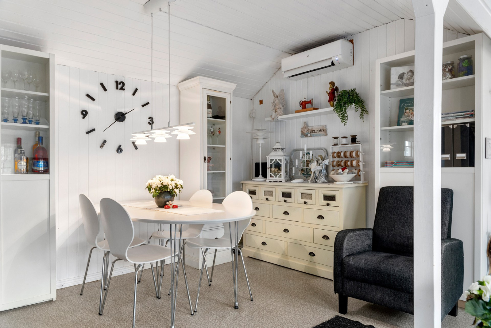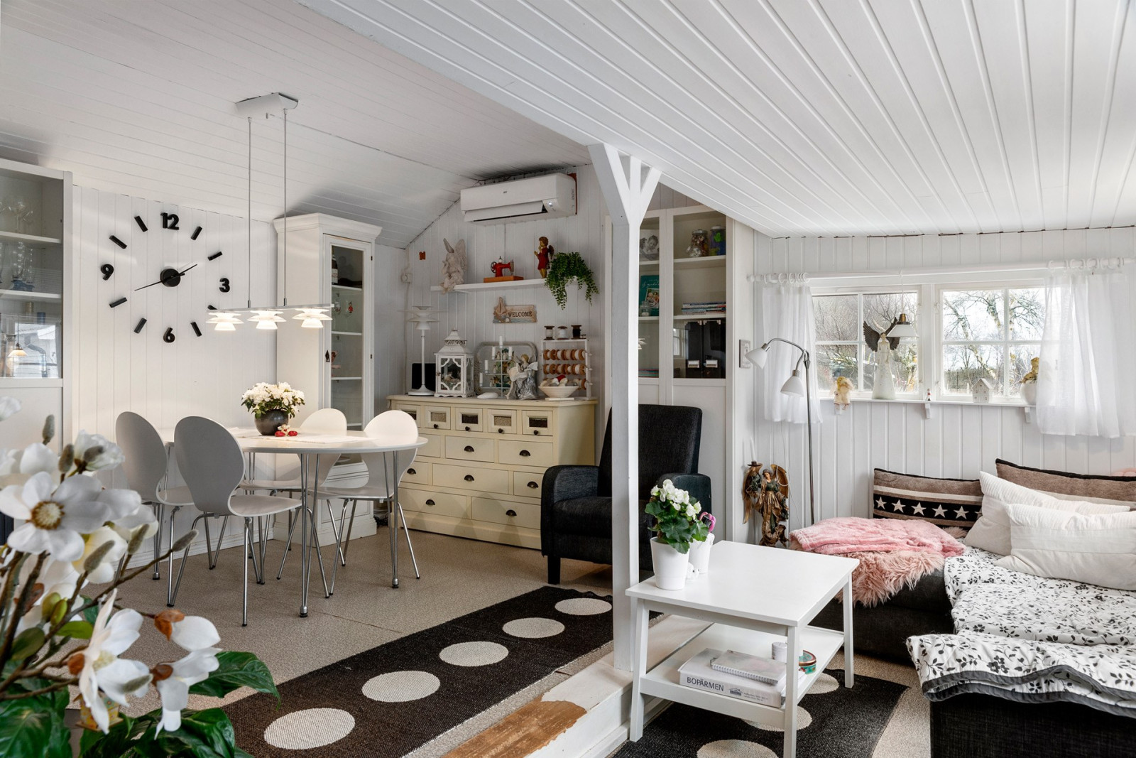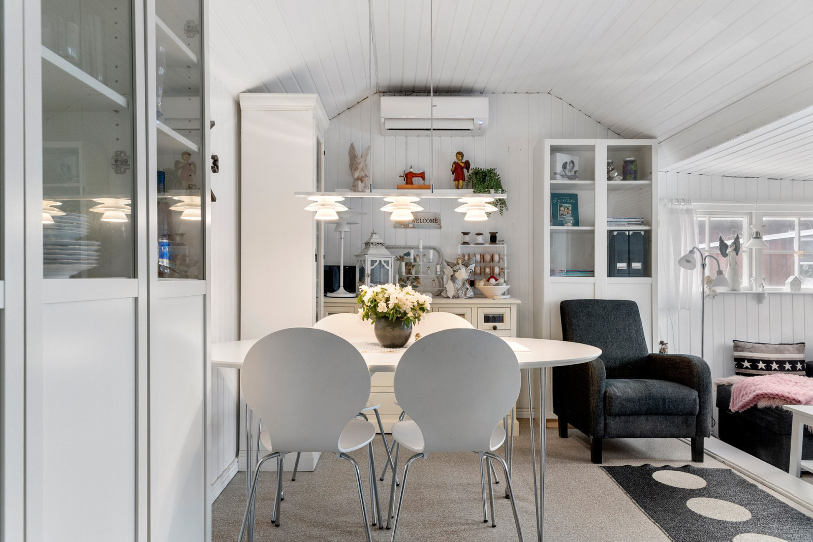 Entrén är centralt placerad i huset. I hallen finns en garderob för förvaring. Direkt till höger nås sällskapsrummet och ett trappsteg upp även matplatsen - allt med en öppen planlösning. I anslutning till matplatsen finns det renoverade och smart planerade köket med gott om förvaring i förhållande till kökets storlek. I sällskapsrummet finns en härligt braskamin för extra värme eller myskvällar under årets kallare tid. Till vänster från entrén ligger ett rum som används som sovrum. Här finns garderober samt en mindre klädkammare. Vidare genom sovrummet nås badrummet med dusch och tvättmaskin.Kök