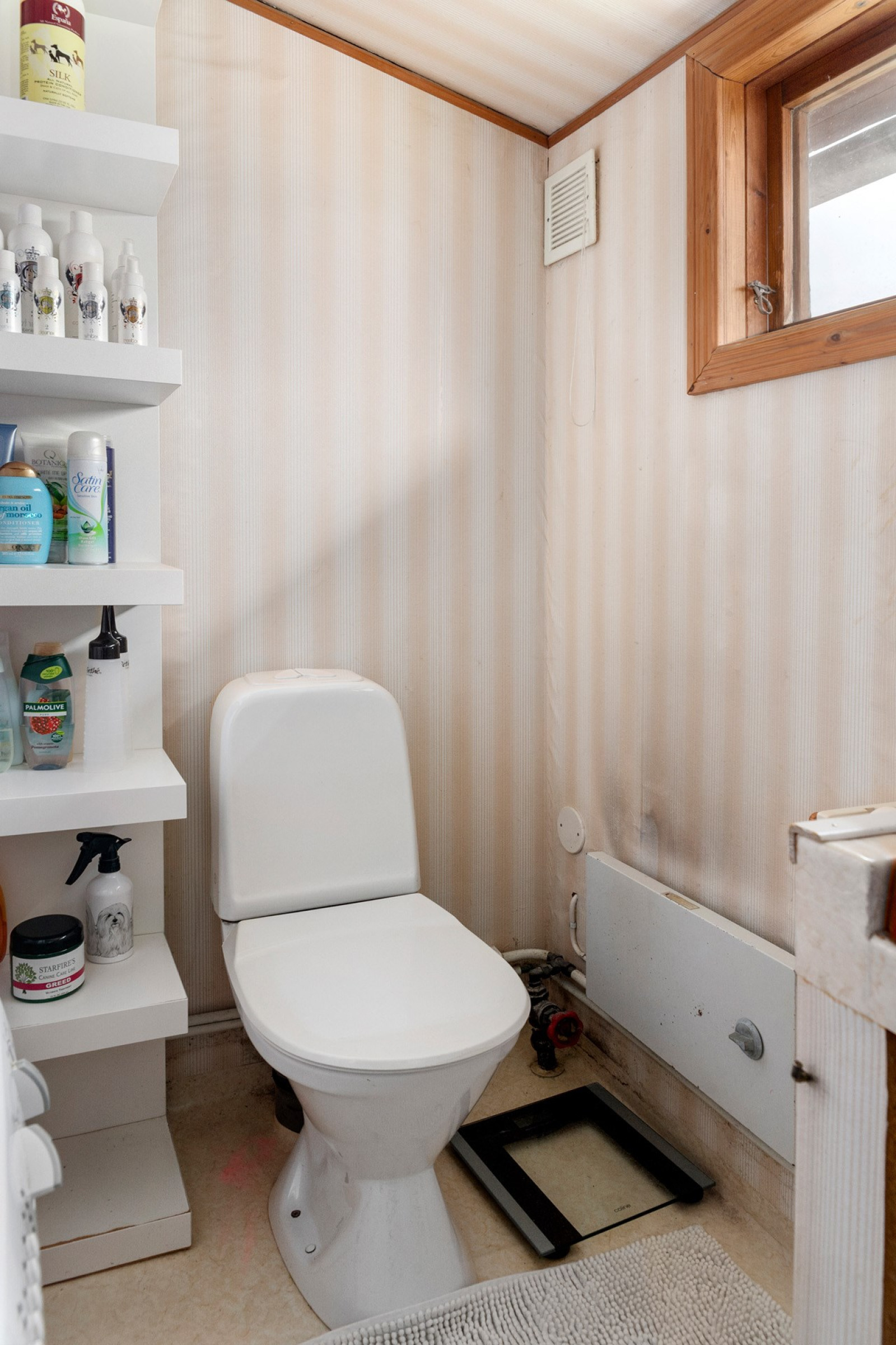 WC, handfat, dusch, tvättmaskin. Här finns också varmvattenberedaren placerad (20 liter).