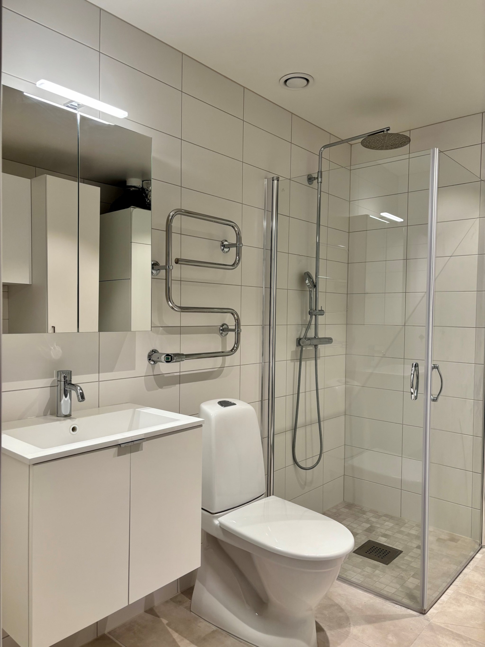 Helkaklat badrum med duschväggar av glas, wc, handfat, handduksvärmare, tvättmaskin och torktumlare.