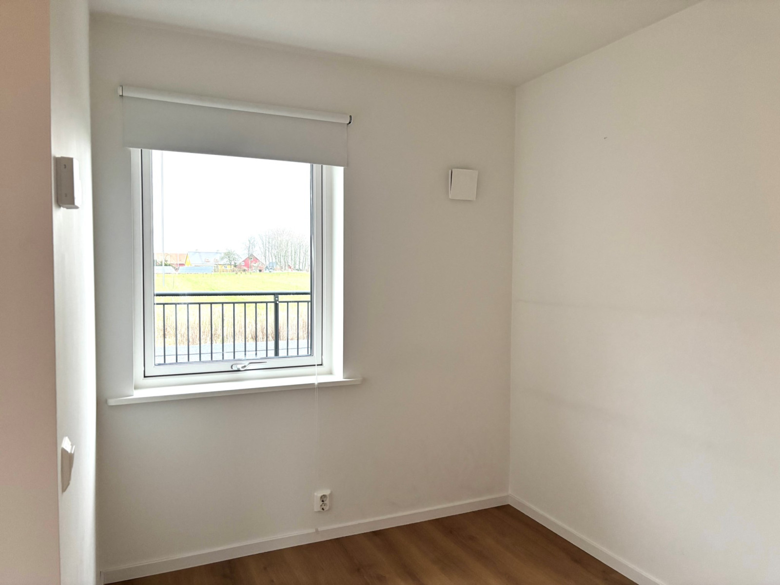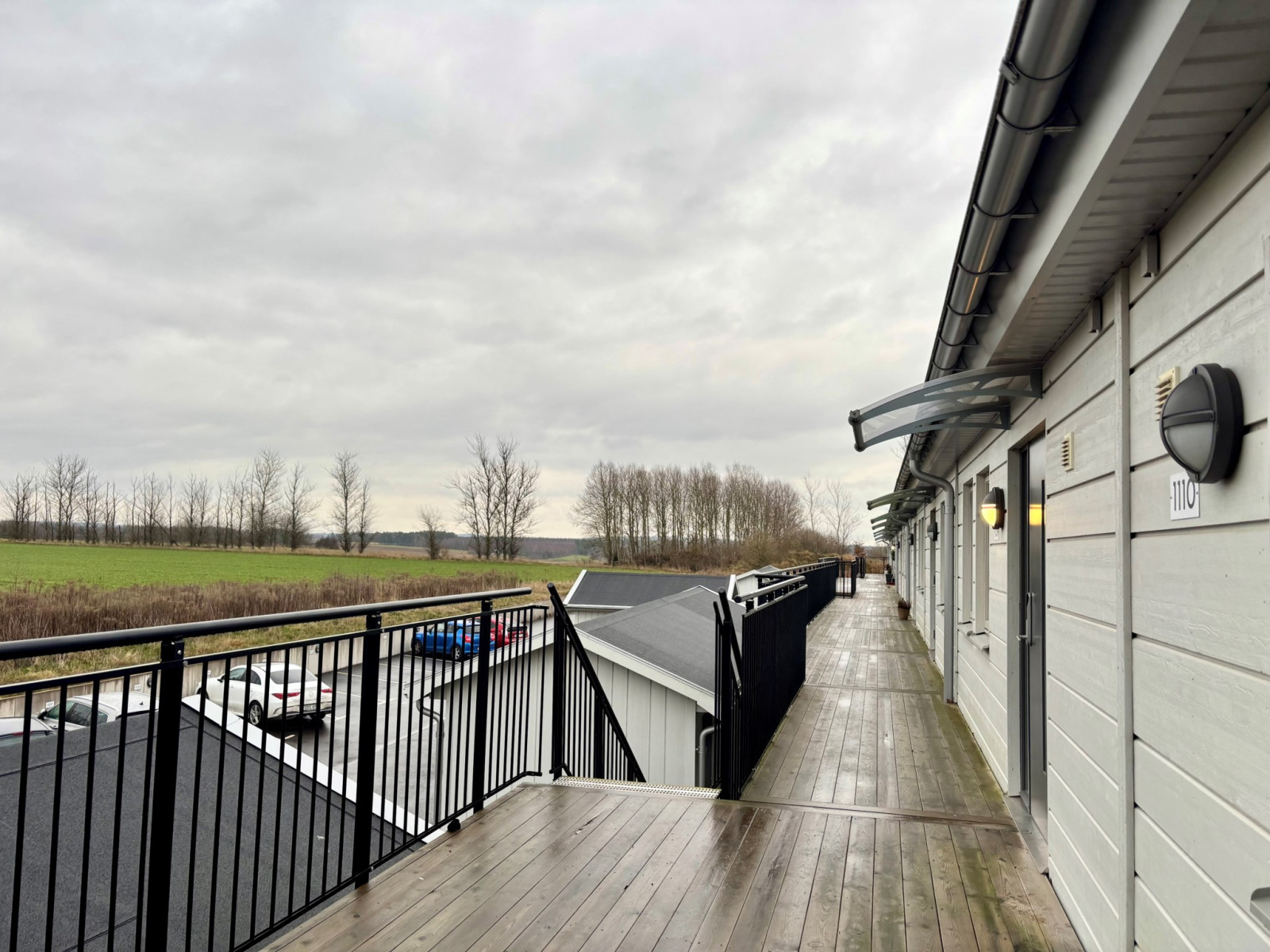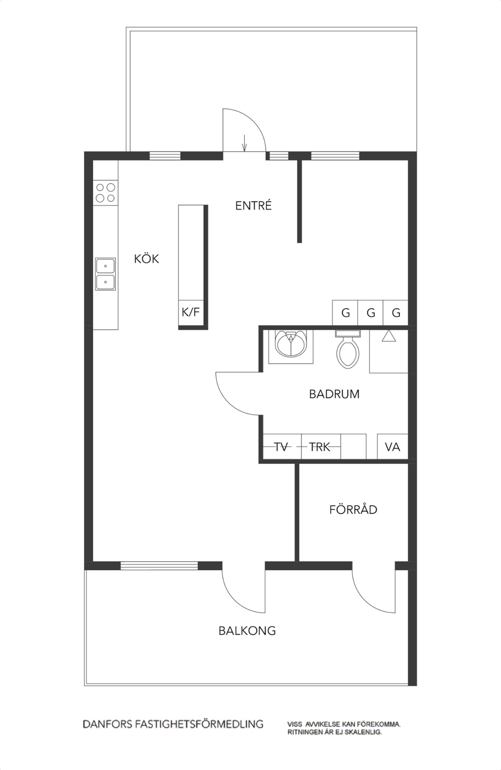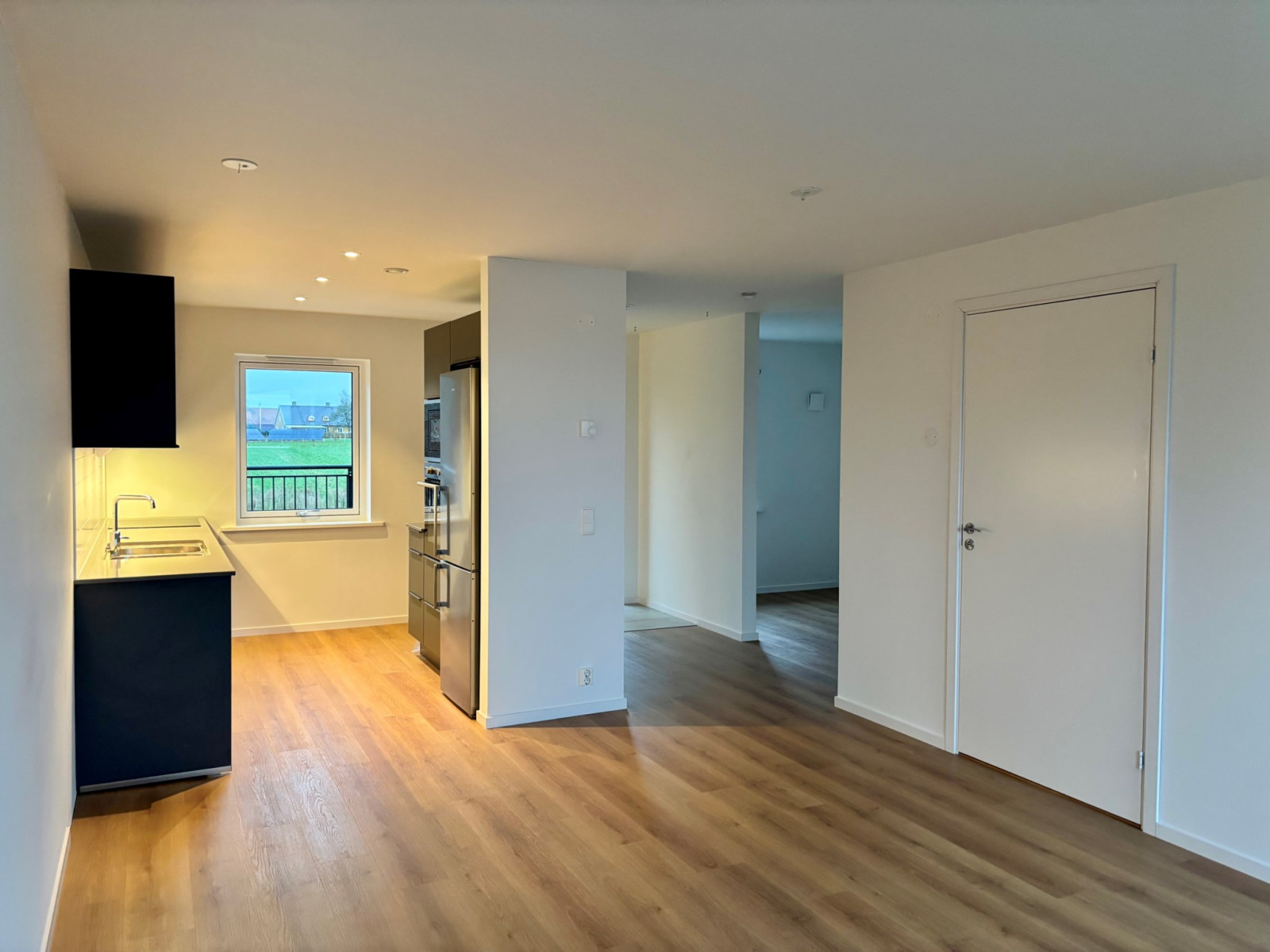 Ytterdörren som är utrustad med ett modernt Yale-kodlås, leder dig in till en ljus hall med klinkergolv. Till vänster efter hallen finns den avskilda sovalkoven, med gaderober och utsikt mot fälten. Åt höger ifrån hallen finns köket, med luckor i mattgrått och bänkskiva i sten. Från allrummet nås badrummet och balkongen i sydvästläge. Balkongen har trallgolv och glasräcke, härifrån nås även lägenhetens isolerade förråd.Kök