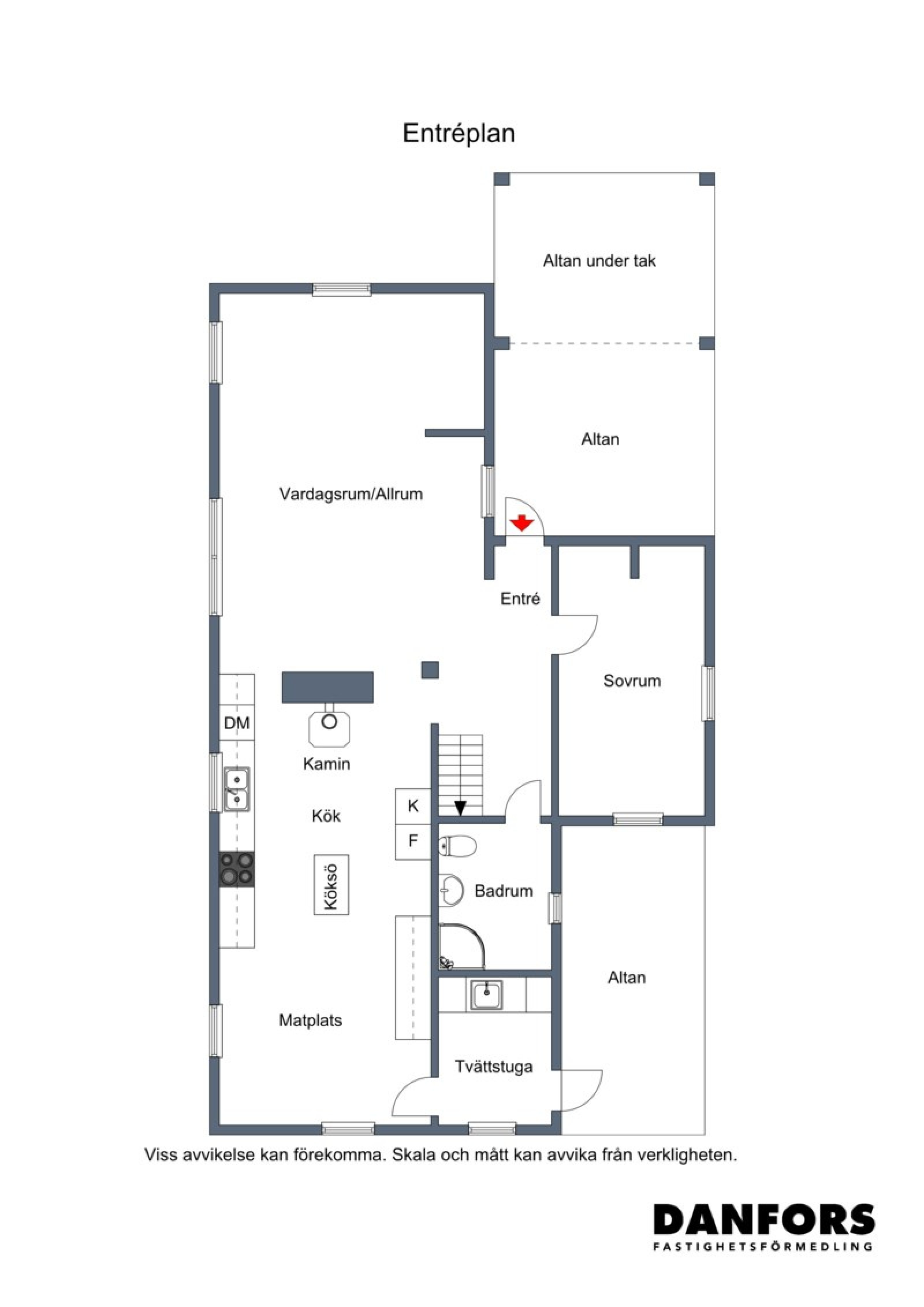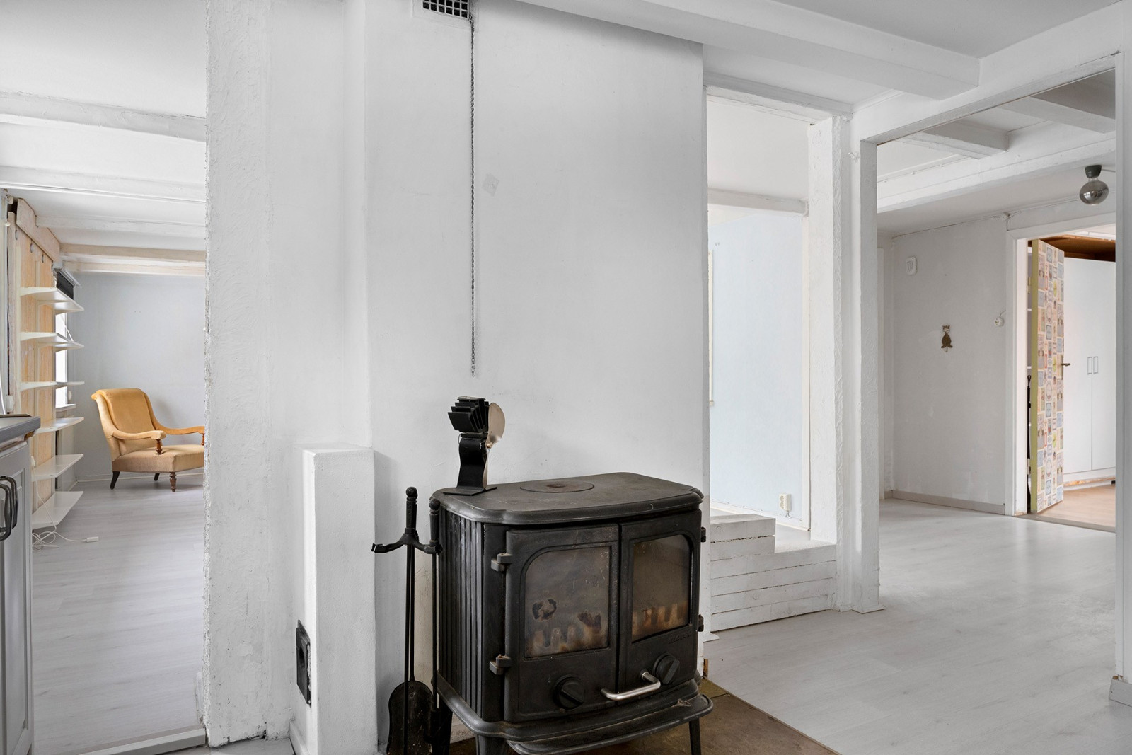 Entré sker till en öppen och välkomnande hall som har direkt kontakt med både kök och allrum. Till vänster om entrén ligger sovrummet, och rakt fram nås bostadens badrum. Allrum och kök är placerade i anslutning till hallen och skiljs delvis åt av en murstock som skapar en naturlig avgränsning mellan rummen. Längst in i köket, vid matplatsen, finns en praktisk tvättstuga med egen groventré.