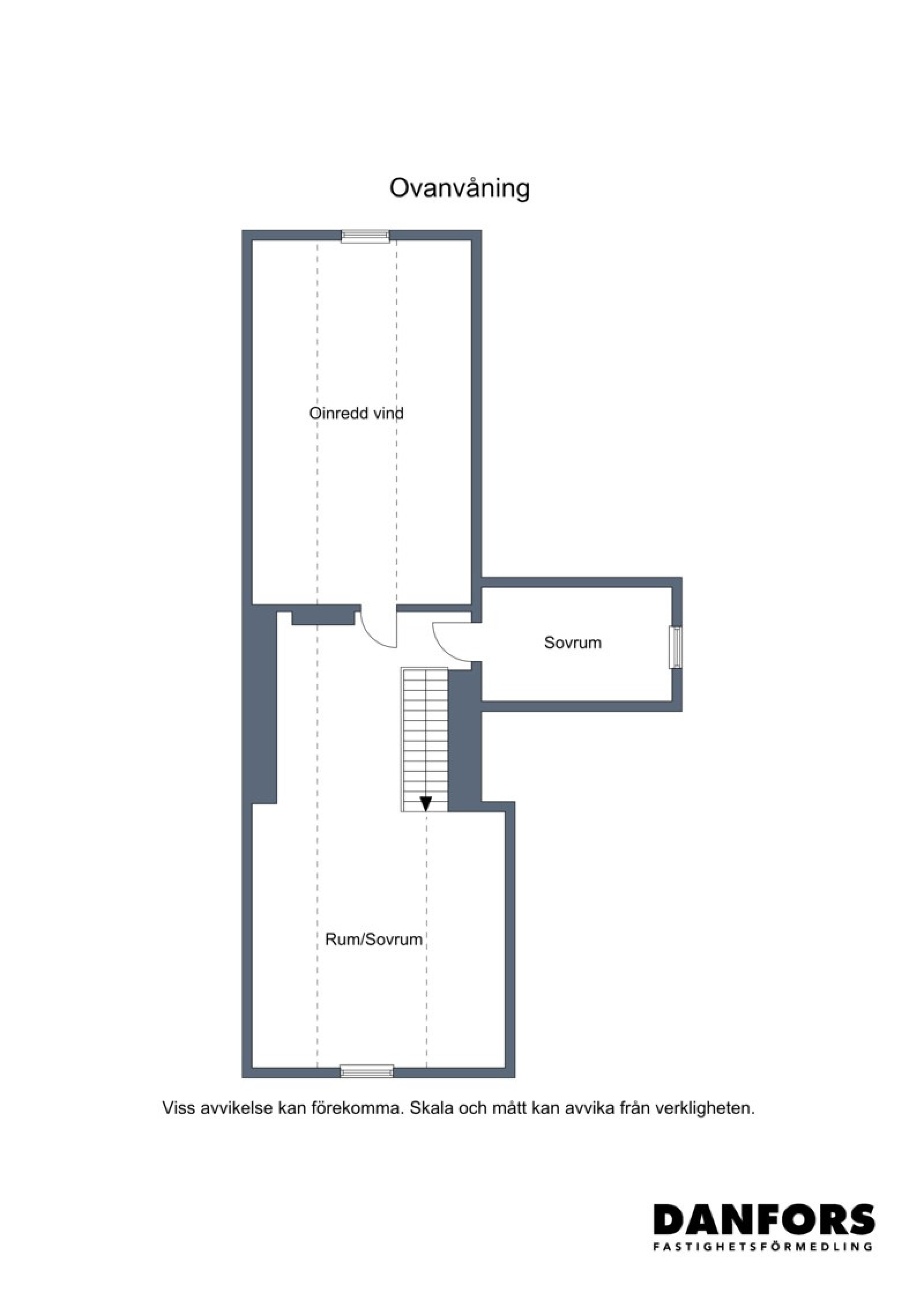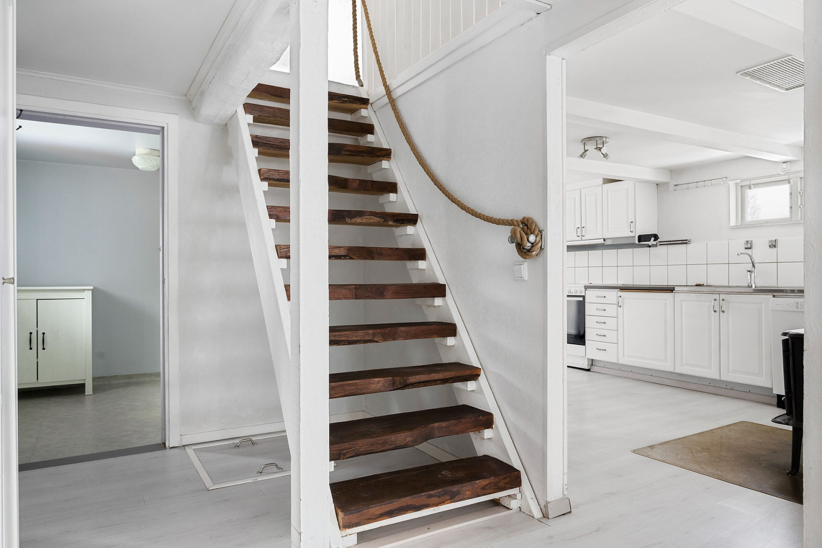 Via trappan i hallen når man ovanvåningen som rymmer ett rymligt sällskapsrum eller sovrum samt ett mindre gästrum. Här finns även en oinredd vind med goda möjligheter att utveckla ytterligare boyta i framtiden.Hall/entré