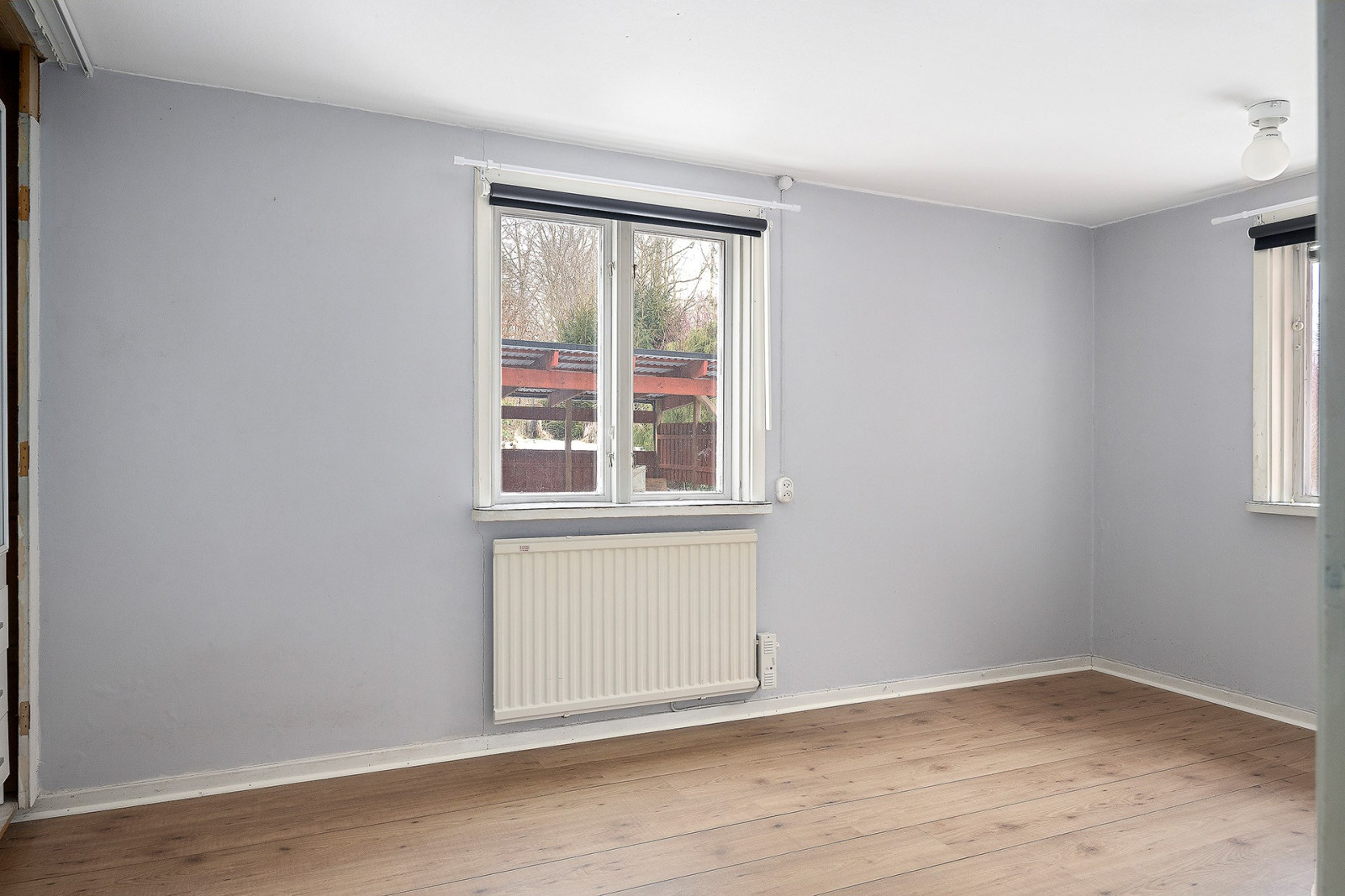 Inrett med ljust laminatgolv, ljusa väggar. Ena kortväggen har man möjlighet till förvaring med takskena för draperi, finns även fönster åt väster.