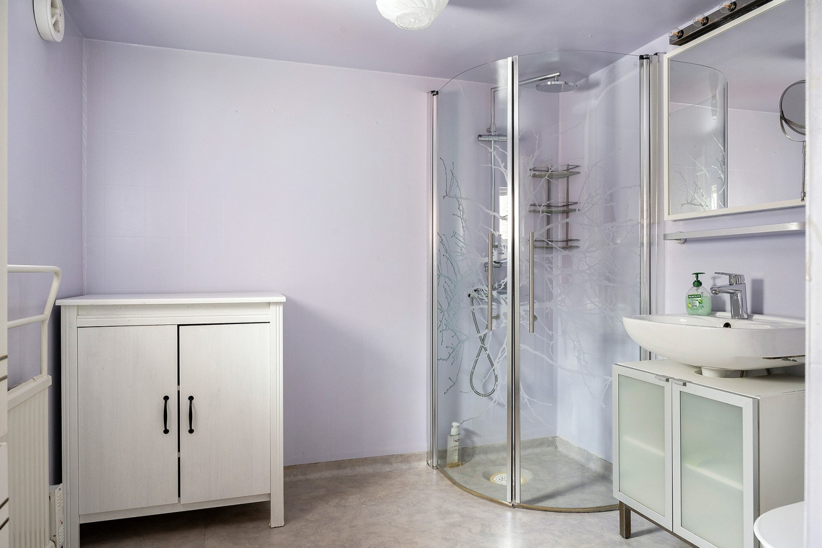 Praktisk badrum med plastmatta, våtrumsmatta vägg, wc, tvättställ med underskåp, dusch (vikdörrar) badrumsskåp samt vädringsfönster åt väster.